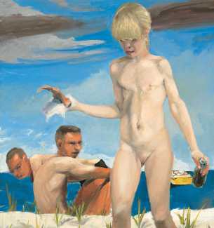 Eric Fischl became famous in the eighties for his scenes from suburban life on Long Island. In ‘Sleepwalker’ a sullen adolescent masturbates into the children’s paddling pool, while in ‘Bad Boy’ his cousin sneaks a glimpse of a woman’s naked pudenda while groping for money in her open bag. She might be his mother, his sister, his neighbour – this is John Updike with an incestuous twist. Fischl also probed deep into thirties realism, discovering spurts of sexual anxiety among the angled shadows.