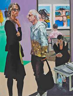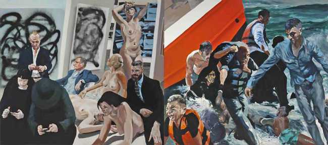 The 2016 painting ‘Rift Raff’ takes the same theme into the socio-political arena. The right-hand panel offers a scene of turmoil – asylum-seeking refugees, among them an old woman and a young boy, struggling in the water, being giving assistance and carried to safety. In contrast the left-hand panel presents a tableau from an art fair, with four naked women intermingling with five resting fairgoers. None of the figures on the left-hand panel are aware of the chaos taking place to the right, some on their cellphones while others stare into space. One of the women turns her head to look at what appears to be an abstract painting by Christopher Wool, another, her arms raised to her forehead, looks out of the painting to the viewer with what appears to be a troubled and critical gaze.