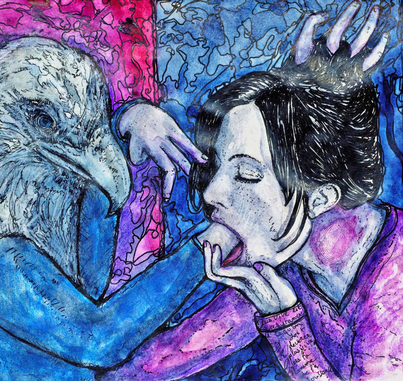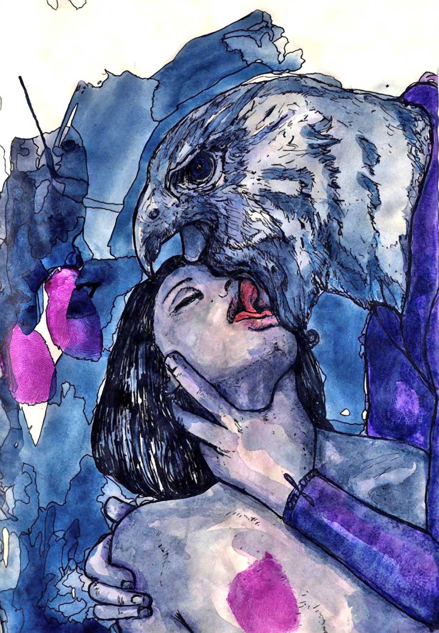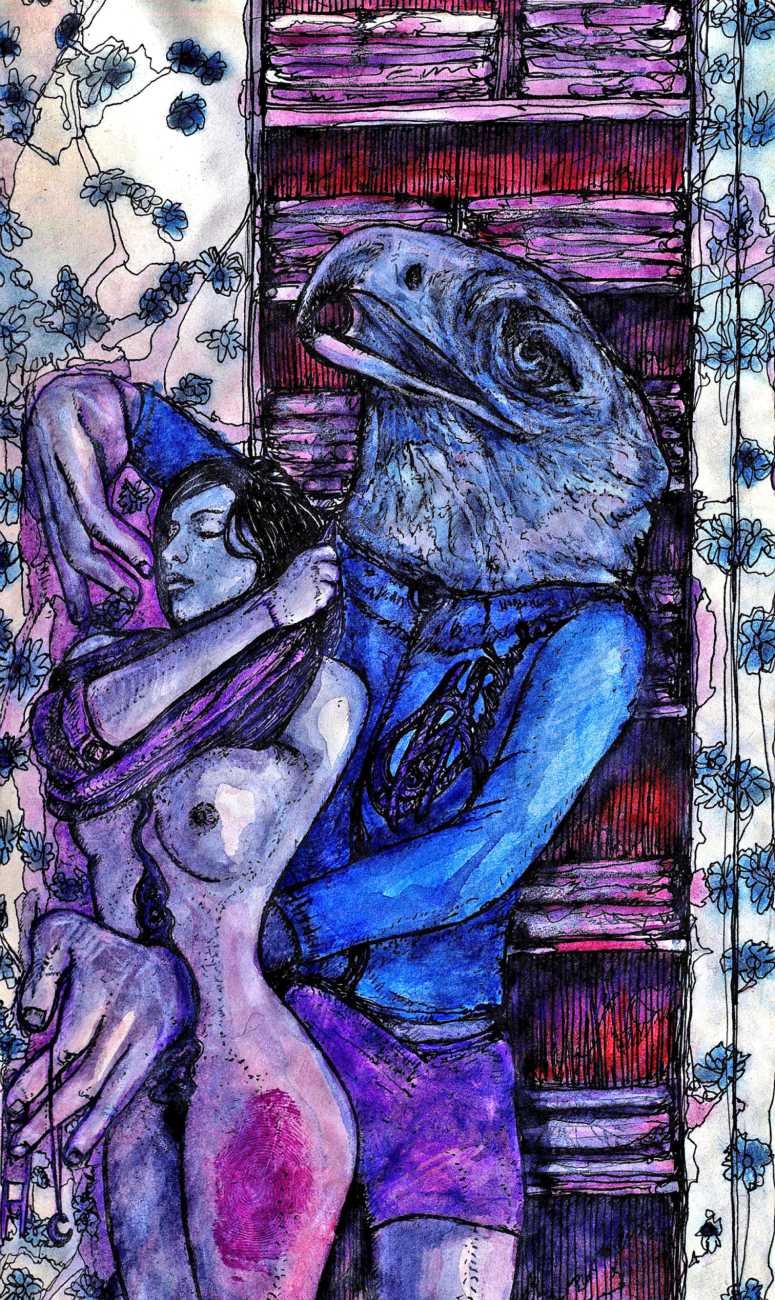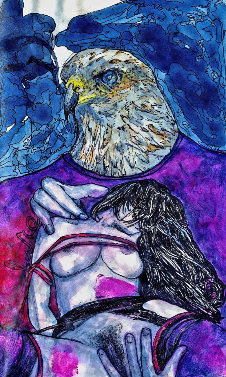 Swann enters the world of the senses behind an alter ego in the form of a bird in almost all his work, either as a human character with a mask or as a kind of Egyptian god. His powerful and beautiful women indulge in this erotic game, aware of the power they wield and absolute owners of the pleasure they seek.