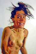 Schmidt paints in acrylic, and often uses a cheap brush applying paint in rather crude, fast strokes. His style is loud and dominant, the colours are based on what you he sees, but are often carried to an extreme. The surprising thing is that even with these crude, raw brushstrokes the model is defined in a perfectly precise way. Shining eyes, pupils with sharp contours, a sinewy neck or bony shoulder blades: everything is unambiguously defined, and yet this is a type of painting that does not attempt to create the illusion of a realistic rendition of the subject matter. The fact that we can always clearly recognise the subject, yet at the same time know we are actually looking at a painting, is a contradiction that is the real challenge in the works of Hanjo Schmidt.