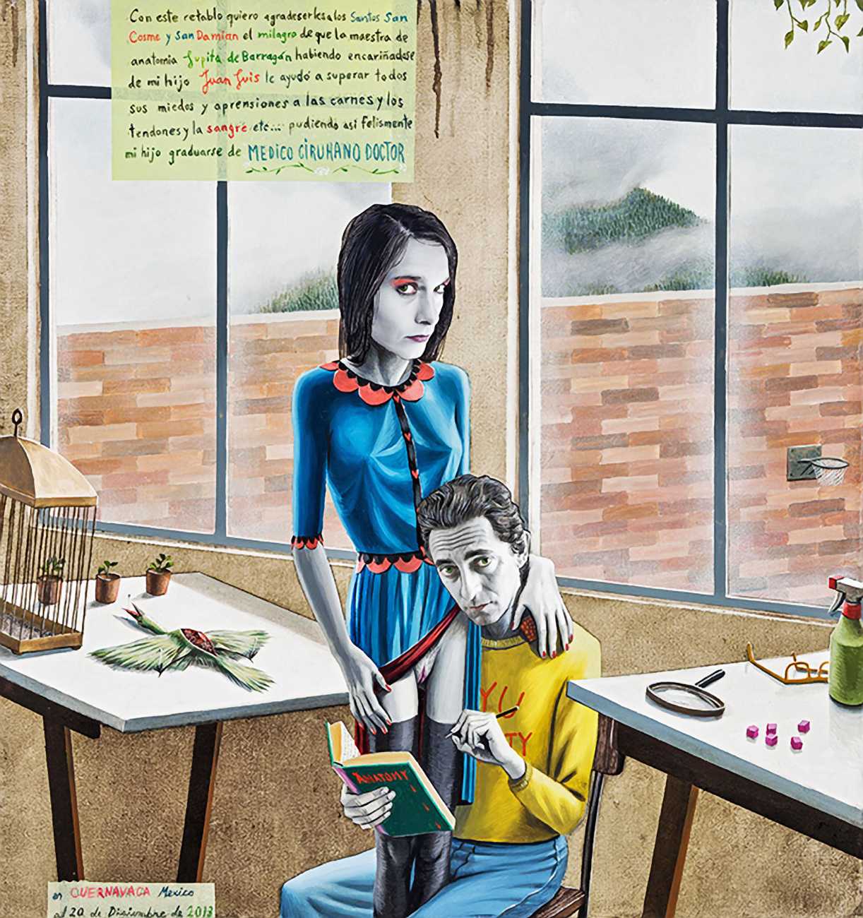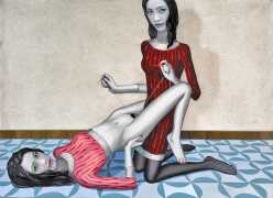 With each new exhibition, and he exhibits regularly in Barcelona and in Berlin, Rubert incorporates new themes and expressive elements, such as natural hair, or threads to tie up men and women (it’s not clear who is being tied up by whom: these things are always messy) or sew up sexual organs or eyelids. Sometimes he includes lighting behind the canvas, the background lights going on and off slowly, revealing and hiding the erotic encounters behind the curtains.