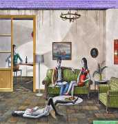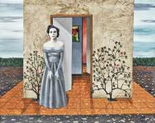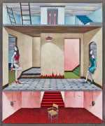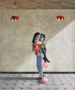 How I start a painting has very much to do with forms, shapes, geometry, proportion, composition. So, that would be like the first thing I get into and from there I am also very much into photography. There is something very magical about photography and the portrait. This is something I have been very fascinated with for years. In most of my paintings I reference portrait photography that looks at you without expression. I see this stage as the expression you have to invent for yourself. For example, when you look at a baby, you always have to show expression. Because, a straight look into the eyes with no expression has something of a tunnel to death. It is like any answer can come through that. That is an element I very often use in my works. I really enjoy creating images that you will not very easily understand, from first glance, what you are seeing.