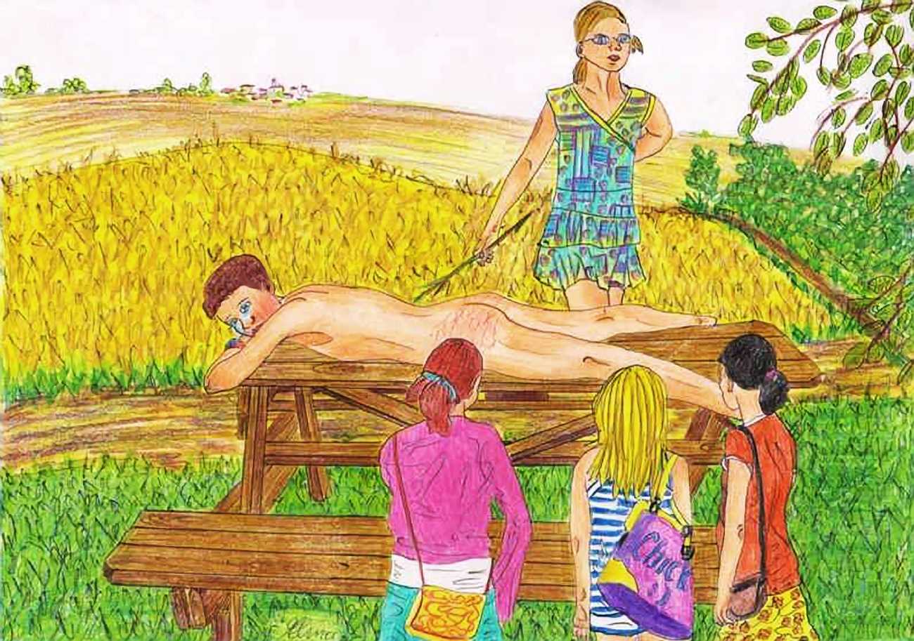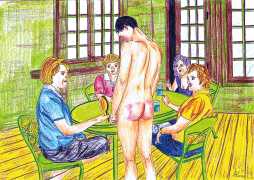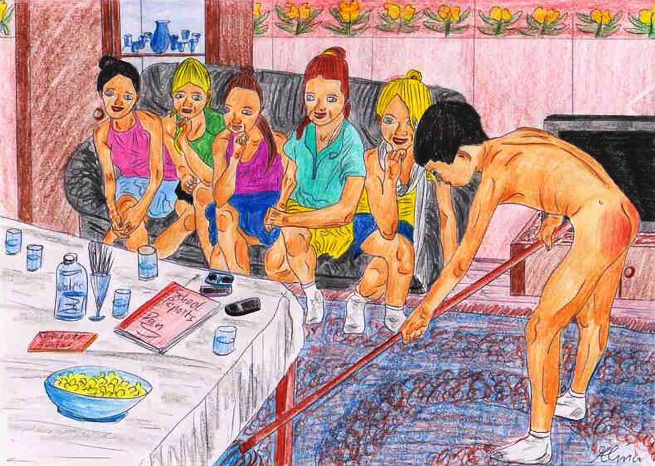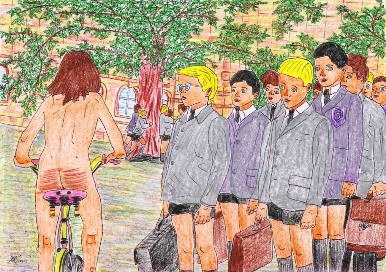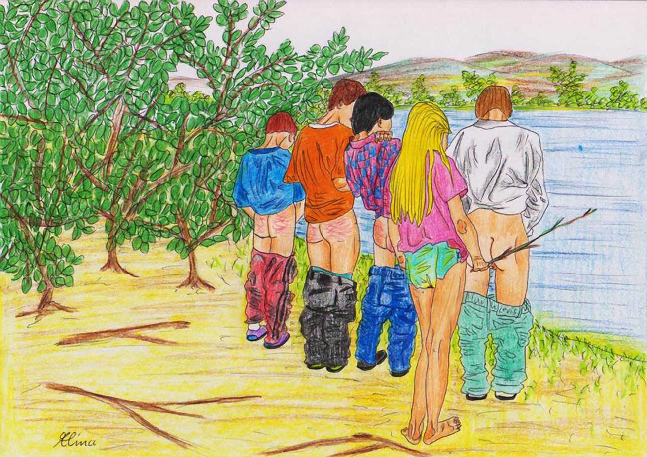 Züchtigung (punishment or chastisement) is the theme of Alina’s drawings, set in a wide variety of contexts from classroom to ‘I’ll show you mine if you show me yours’ scenarios.