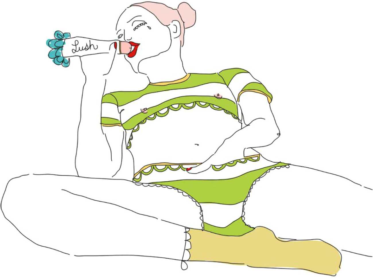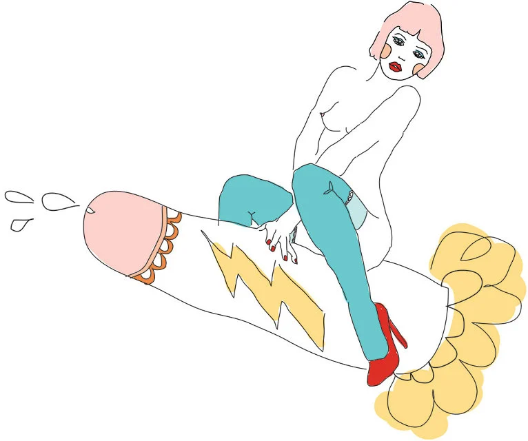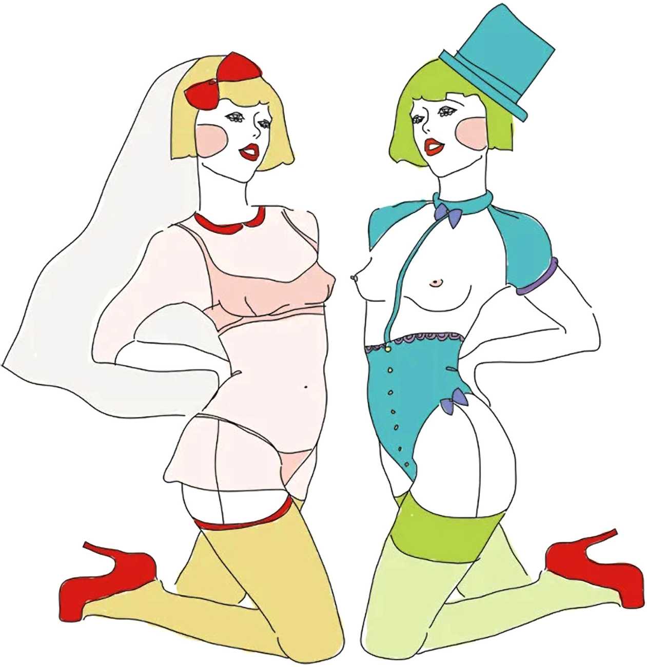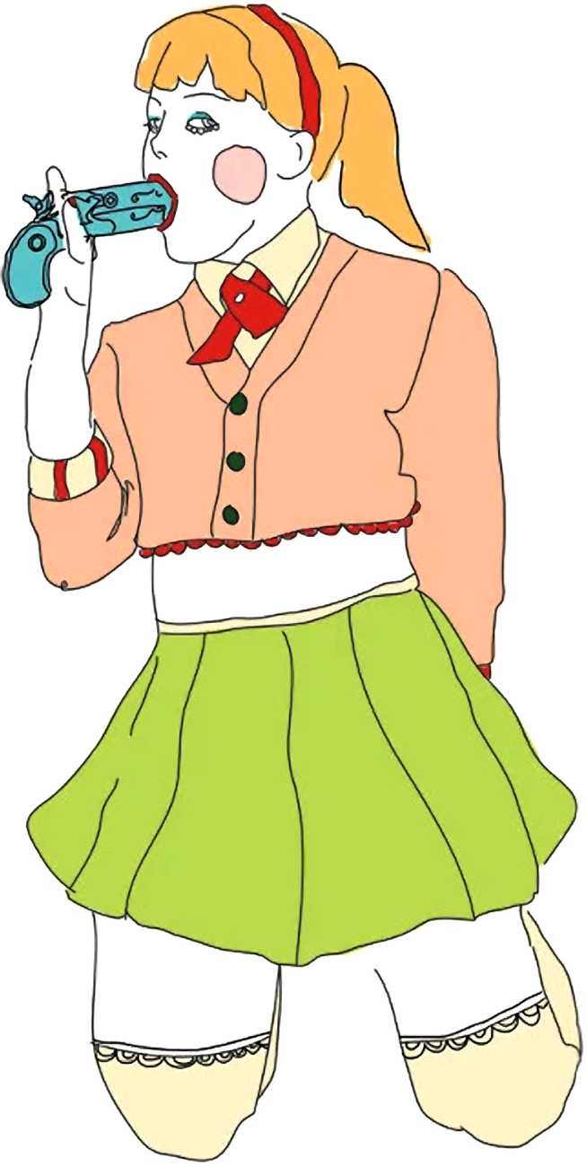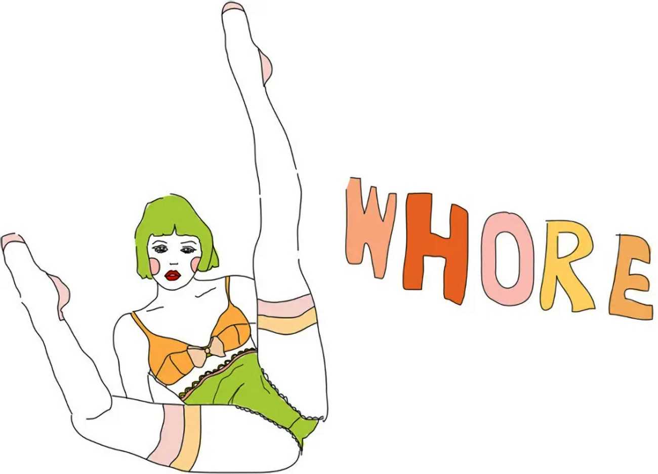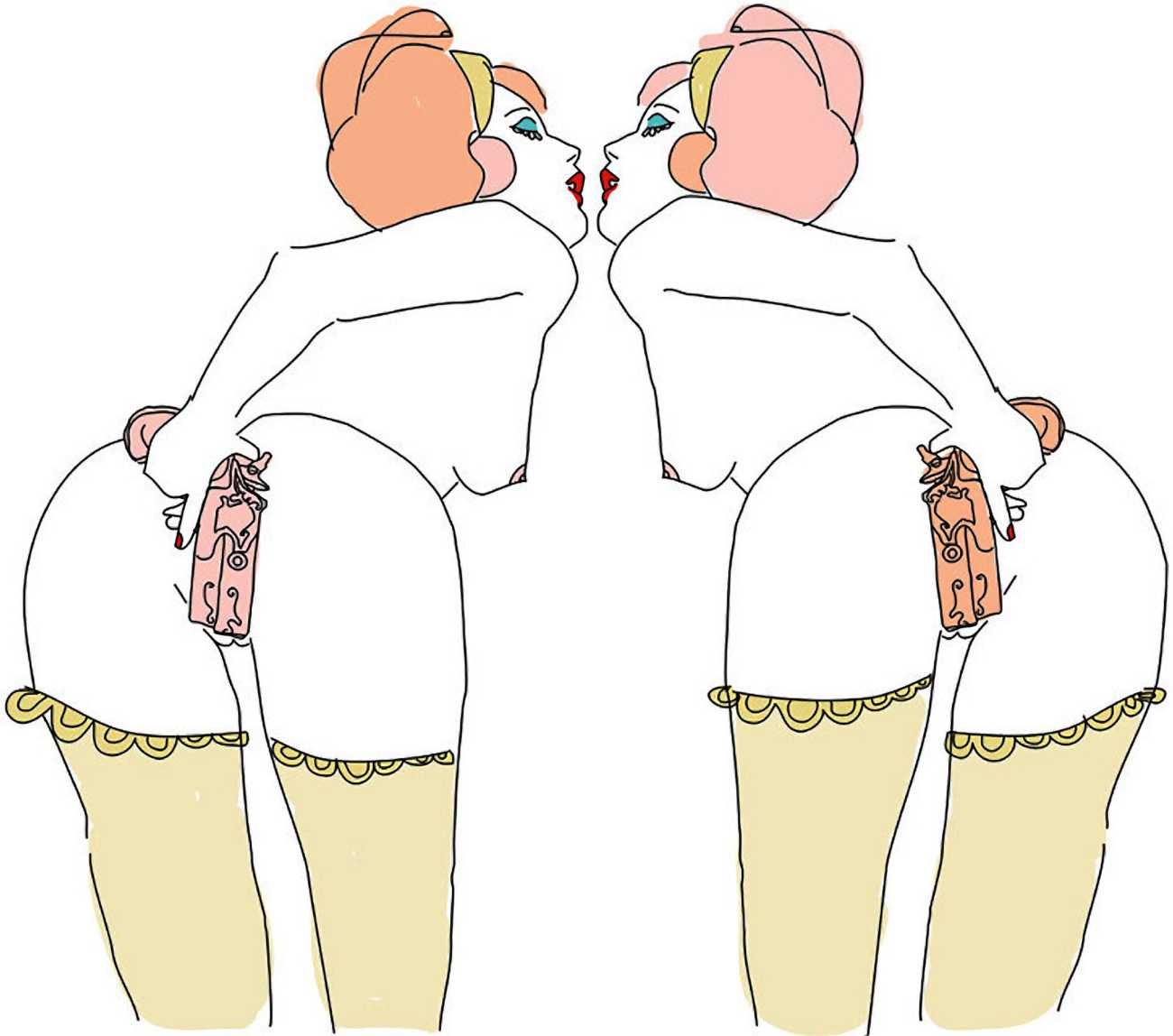 The style is very much that of a graduate in fashion design, a set of colourful neatly-drawn images. The content, however, demonstrates clearly Krim’s interest in the transgressive aspect of women’s clothes, with suggestive sexual references. The combination of titillation and guns raises many of the questions about American culture the artist has gone on to explore in her more political work, which can regularly be seen on her Instagram account.