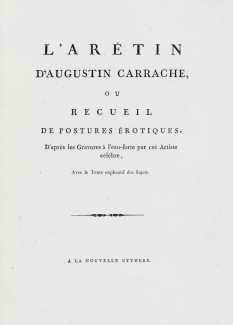 L’Arétin d’Augustin Carrache, ou recueil de postures érotiques, d’après les gravures à l'eau-forte par cet artiste célèbre, avec le texte explicatif des sujets (The Aretino by Agostino Carracci, or a Collection of Erotic Postures after the Etchings by the Famous Artist, with the Explanatory Text of the Subjects), which was published in Paris in 1798, was an important milestone in the history of these infamous pictures. You can find the full history of the Aretino/Raimondi I Modi here; suffice it to say that by the end of the eighteenth century any series of paintings or etchings on the theme of sexual positions had become popularly known as ‘Aretinos’.