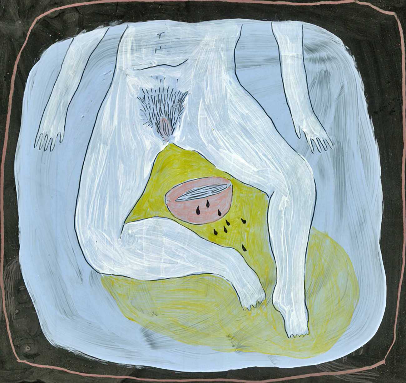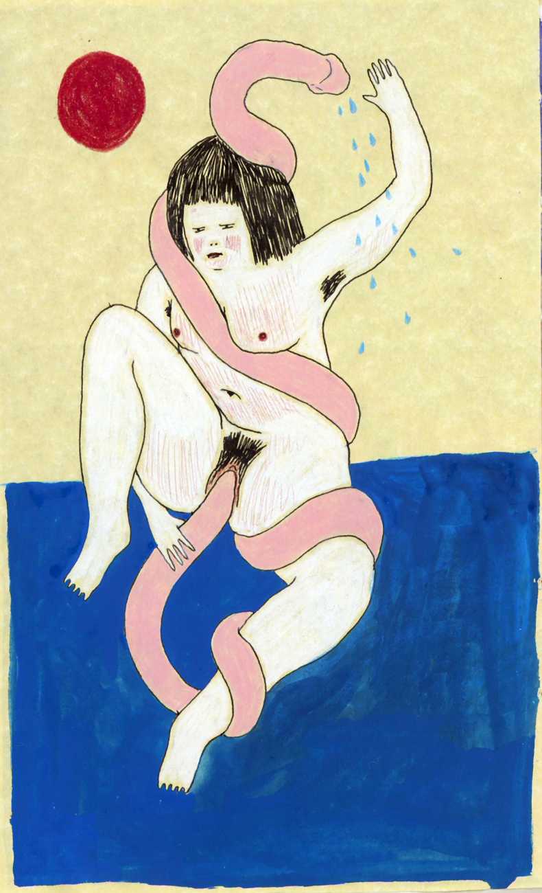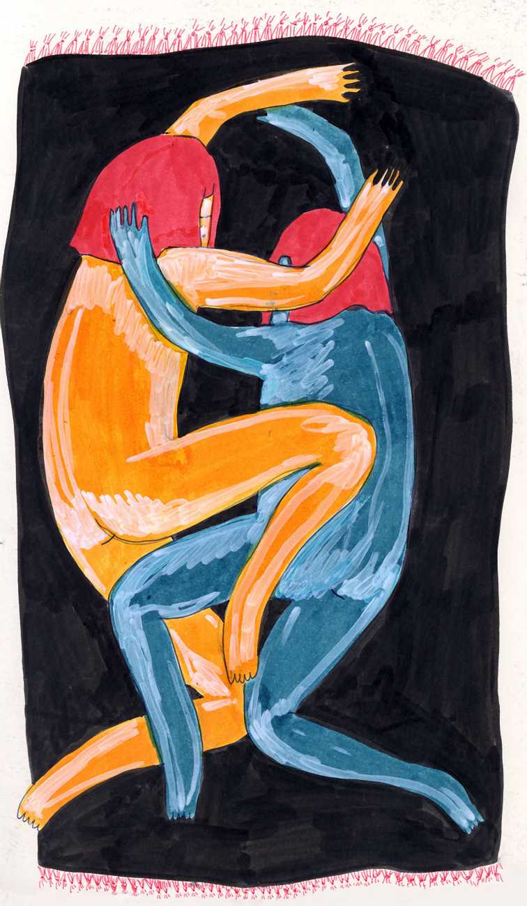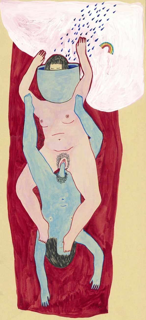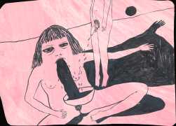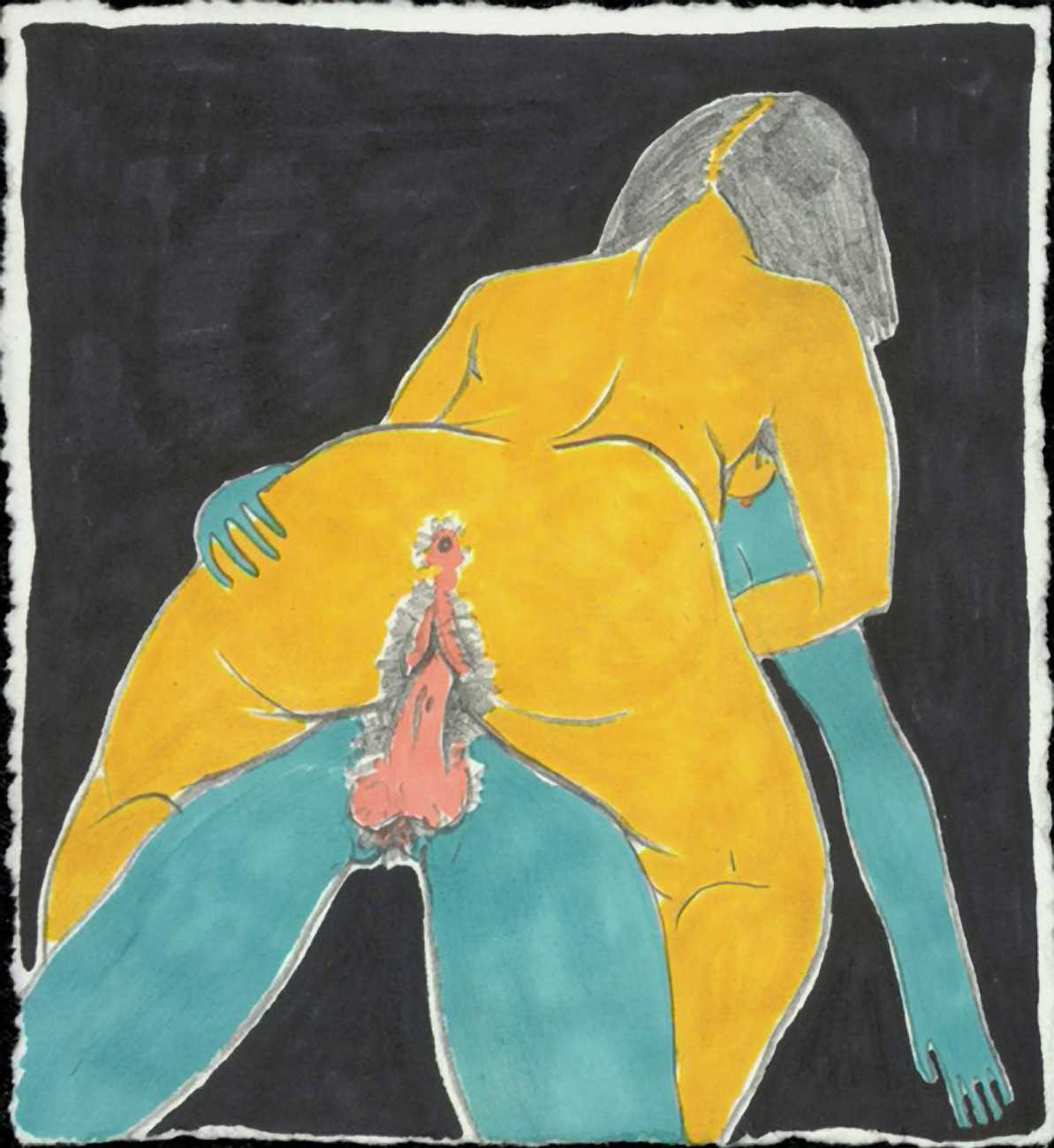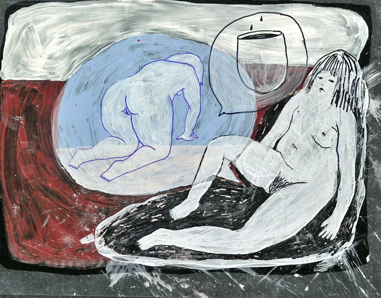 The affection in touch, being touched, and touching stretches across the surface-based work, provoking a viewer to feel big love. Often the tiny childlike characters sexually experiment between two worlds – a ghostlike past and a present orgasmic setting. With clear representation of sexual interactions with both highly rendered and gestural elements, she provides blaring commentary on the casual interactions of a stagnant solitary search for sexual comfort. In the midst of climax, tears are often indistinguishable from pussy squirts and cum shots.