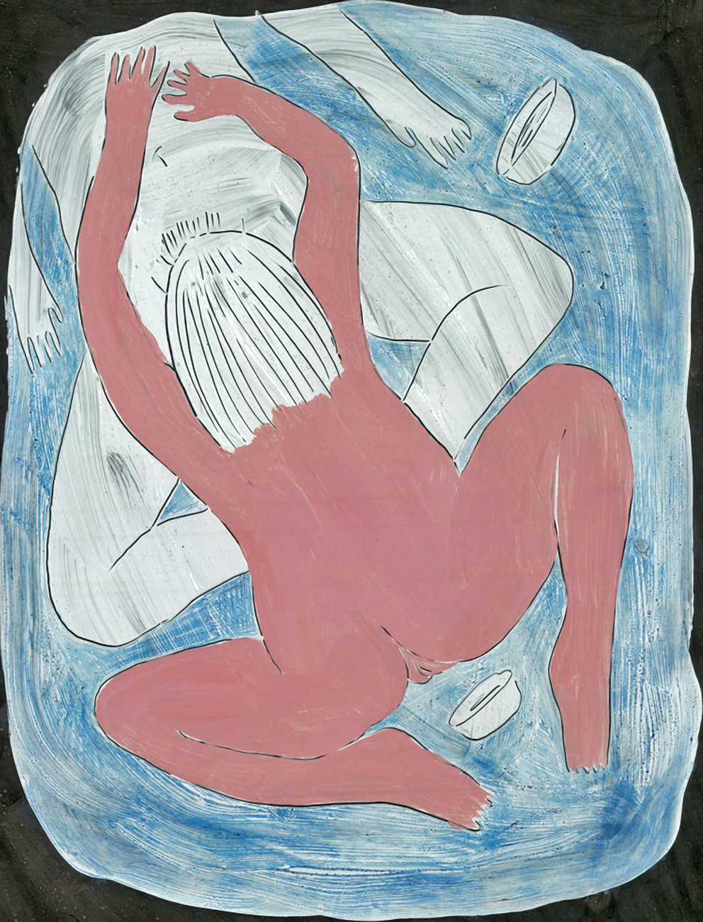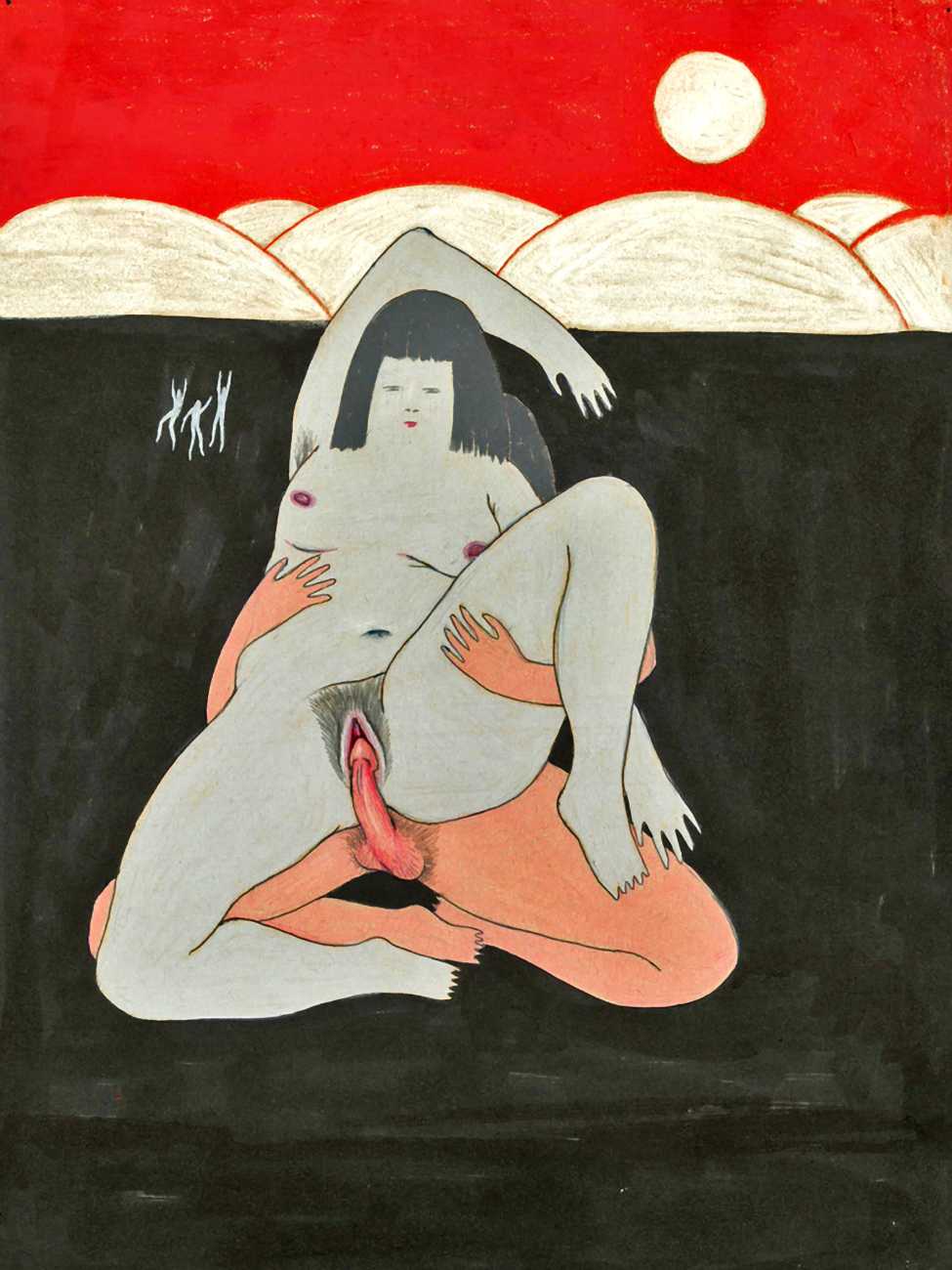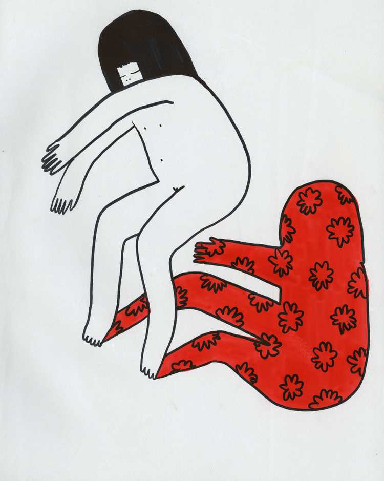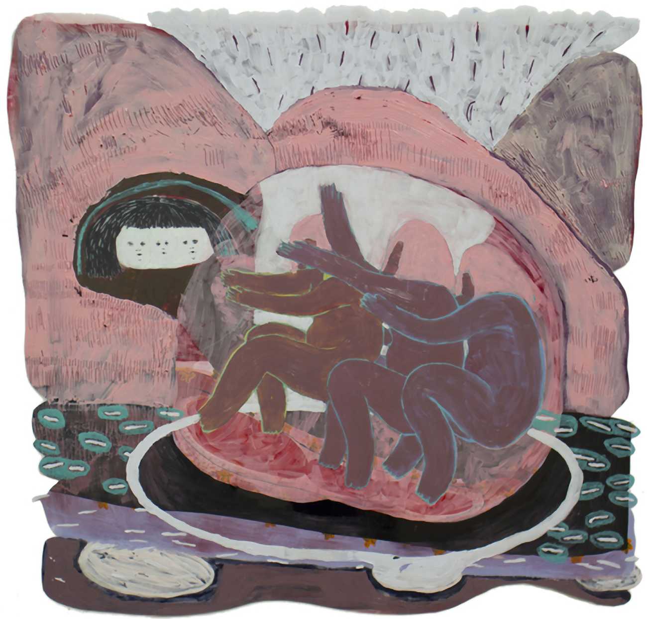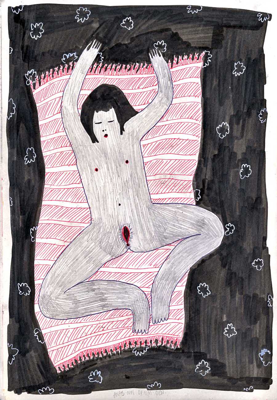 The affection in touch, being touched, and touching stretches across the surface-based work, provoking a viewer to feel big love. Often the tiny childlike characters sexually experiment between two worlds – a ghostlike past and a present orgasmic setting. With clear representation of sexual interactions with both highly rendered and gestural elements, she provides blaring commentary on the casual interactions of a stagnant solitary search for sexual comfort. In the midst of climax, tears are often indistinguishable from pussy squirts and cum shots.