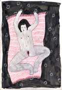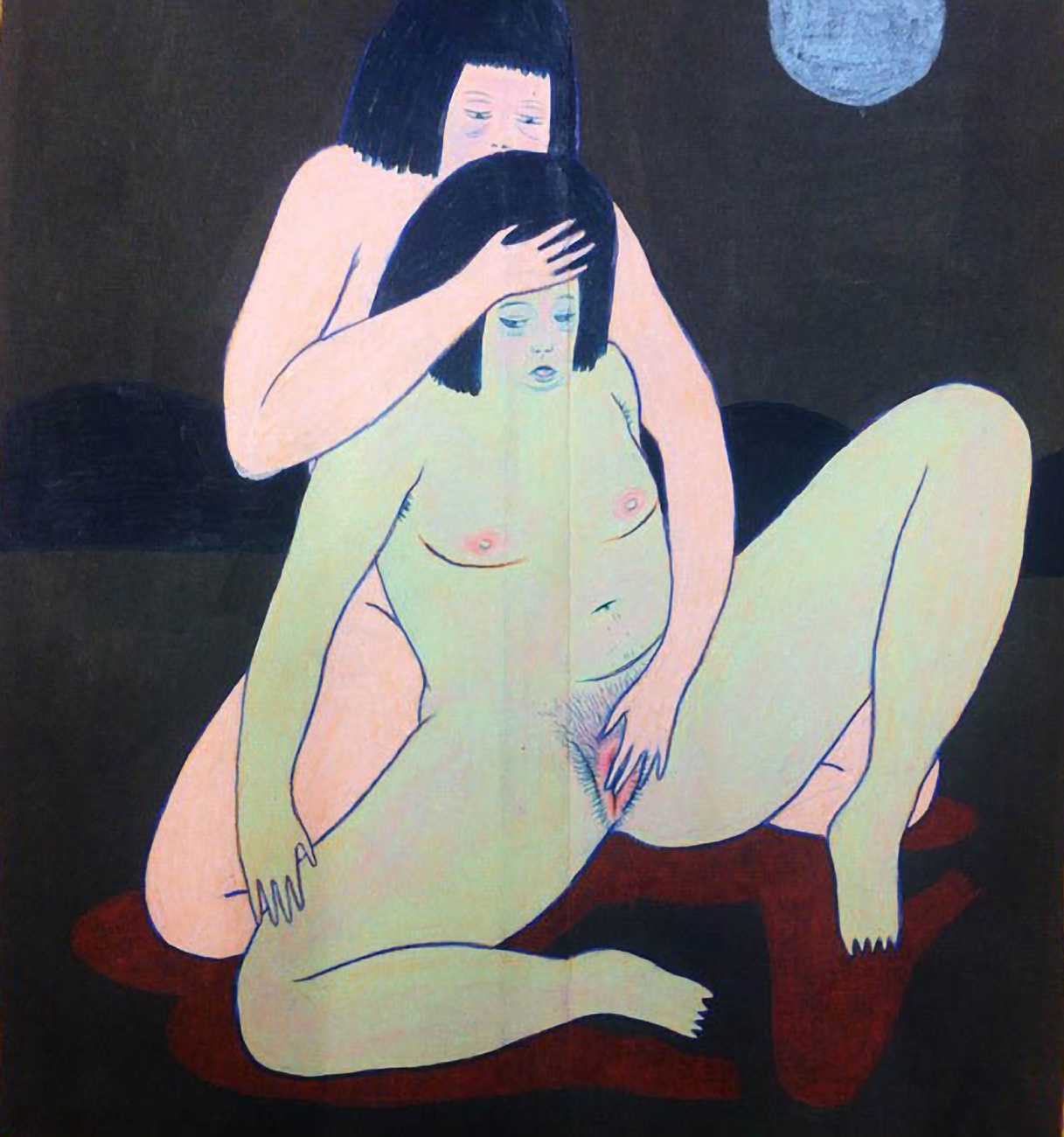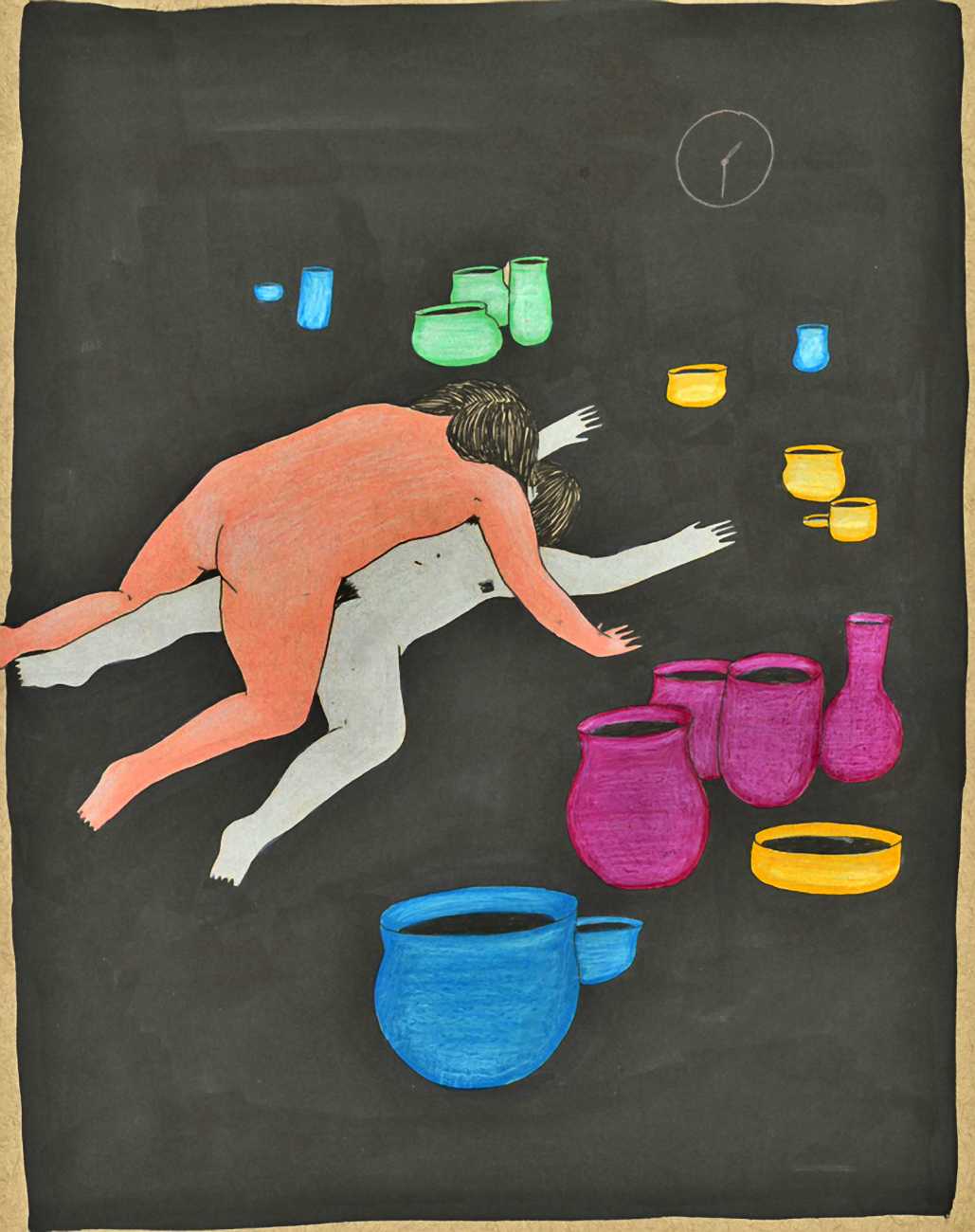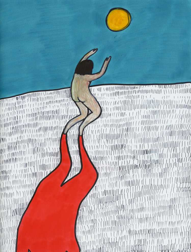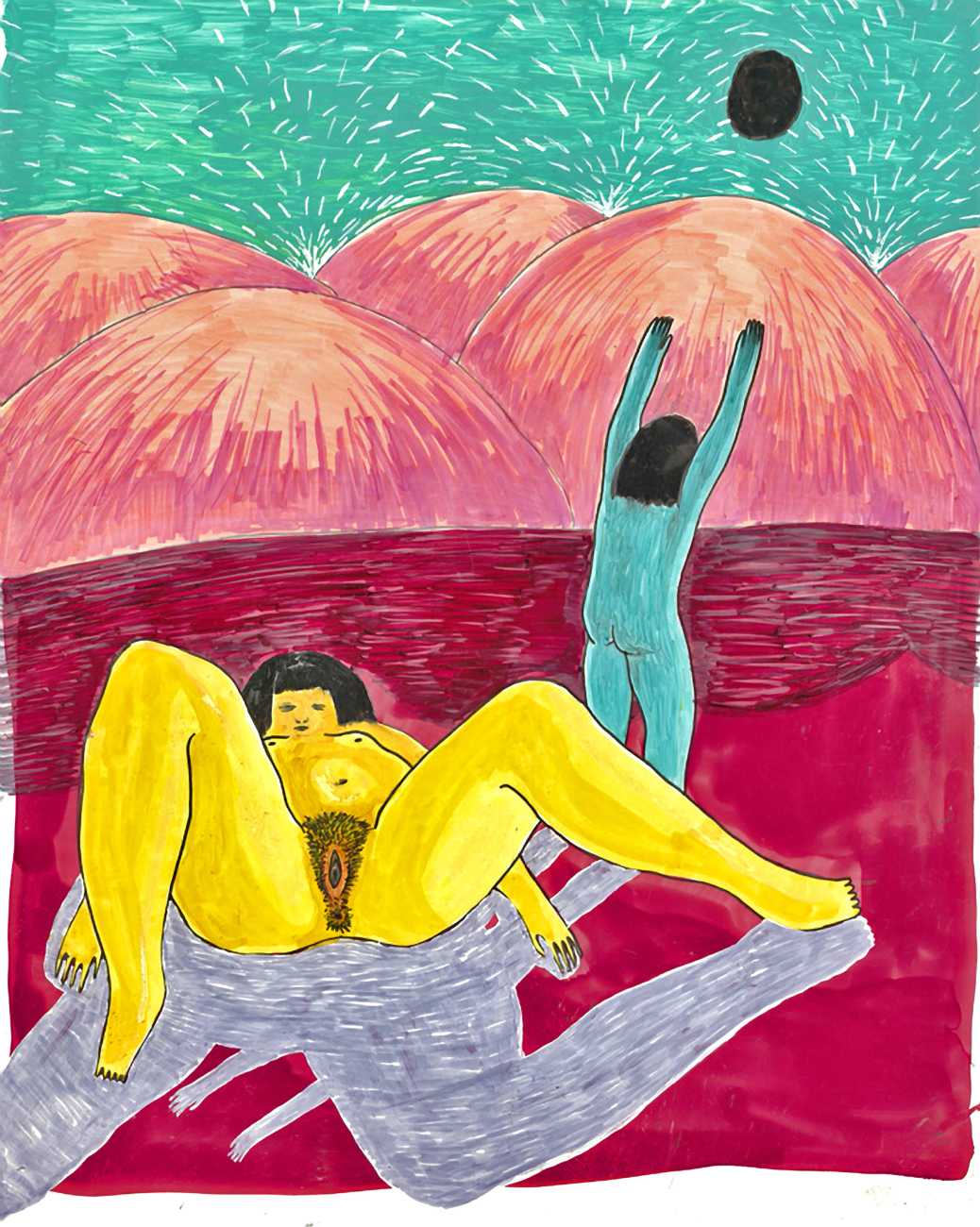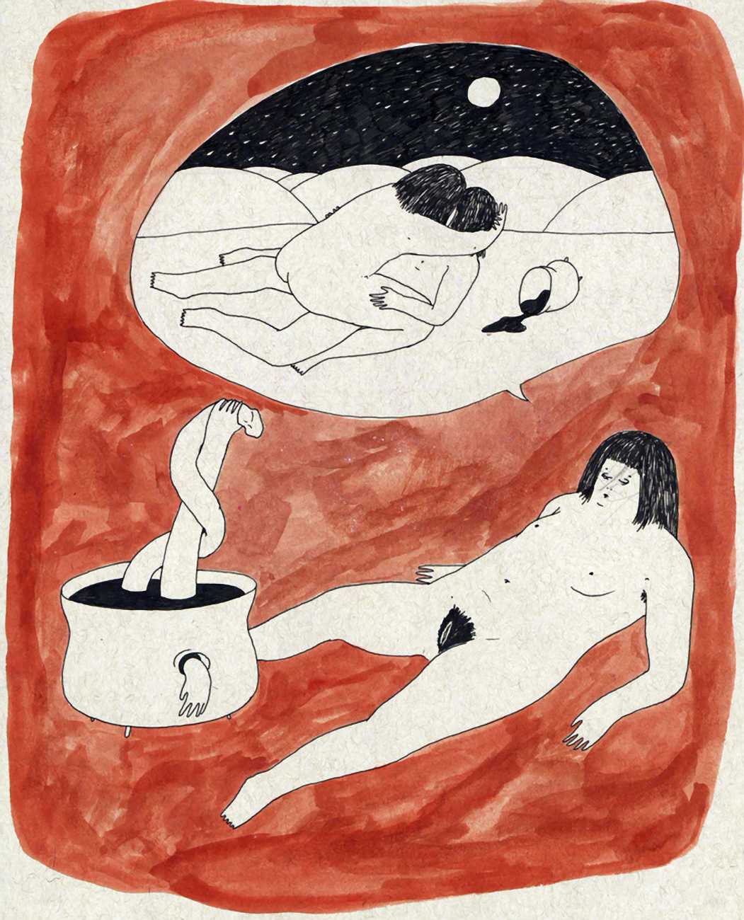The affection in touch, being touched, and touching stretches across the surface-based work, provoking a viewer to feel big love. Often the tiny childlike characters sexually experiment between two worlds – a ghostlike past and a present orgasmic setting. With clear representation of sexual interactions with both highly rendered and gestural elements, she provides blaring commentary on the casual interactions of a stagnant solitary search for sexual comfort. In the midst of climax, tears are often indistinguishable from pussy squirts and cum shots.