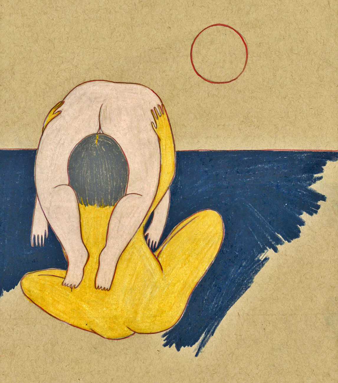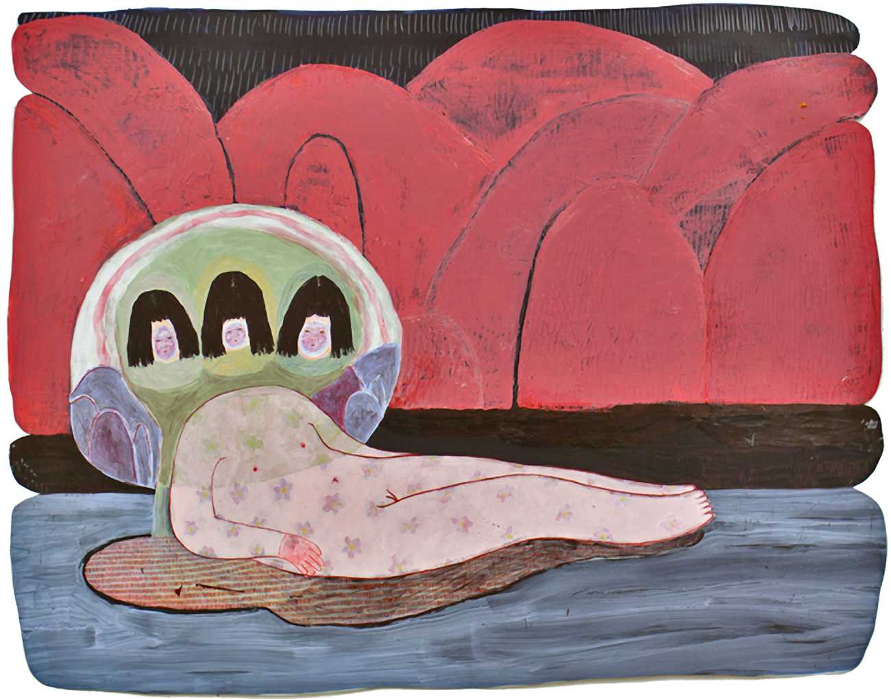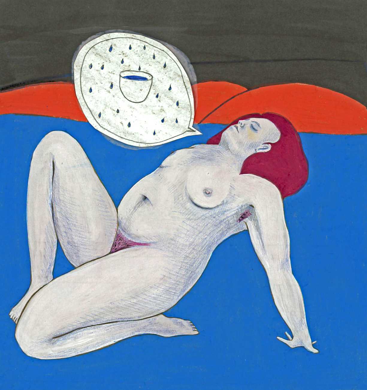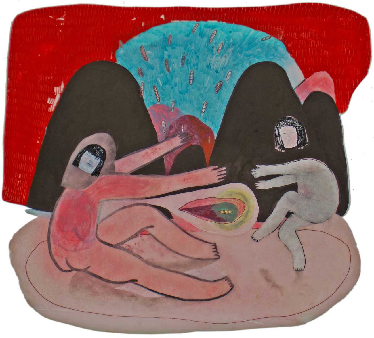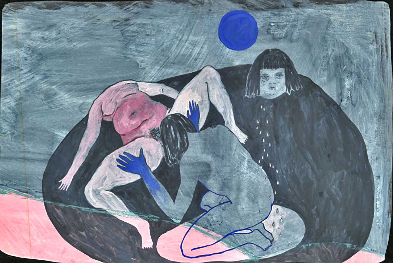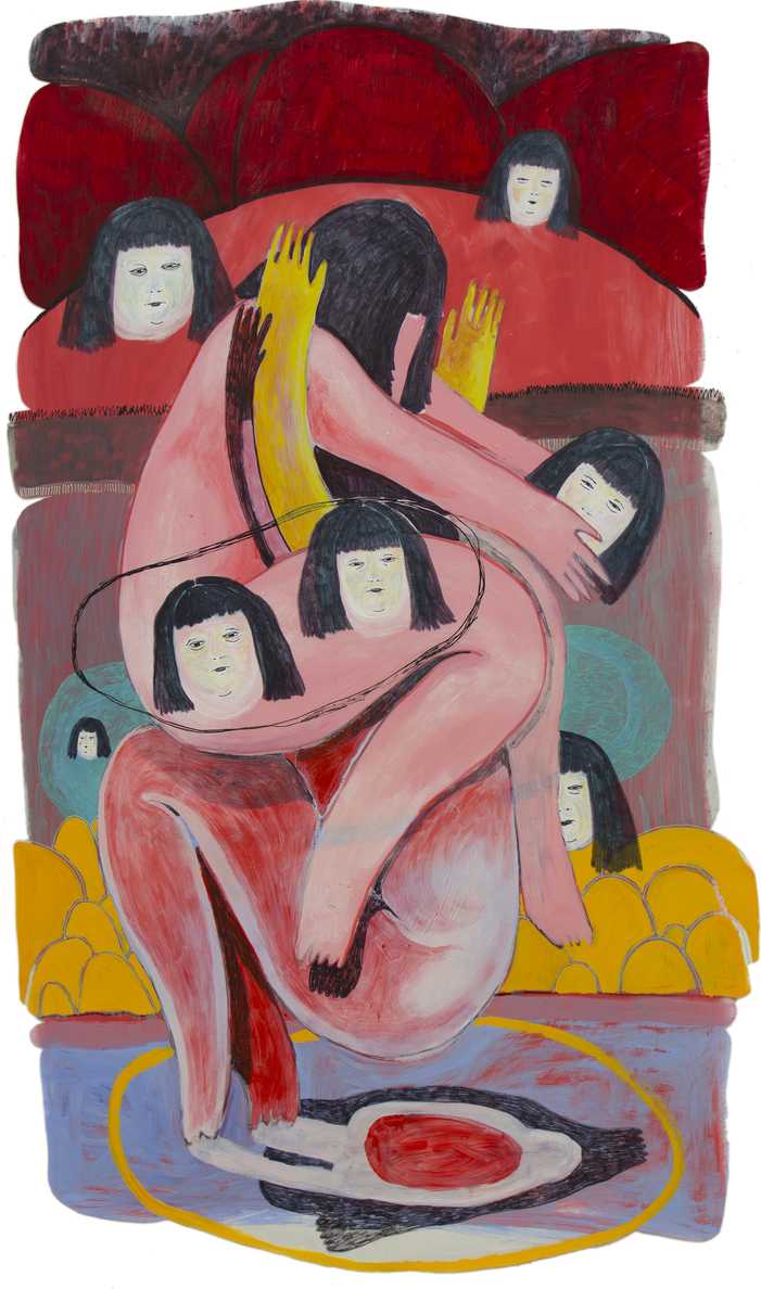 The affection in touch, being touched, and touching stretches across the surface-based work, provoking a viewer to feel big love. Often the tiny childlike characters sexually experiment between two worlds – a ghostlike past and a present orgasmic setting. With clear representation of sexual interactions with both highly rendered and gestural elements, she provides blaring commentary on the casual interactions of a stagnant solitary search for sexual comfort. In the midst of climax, tears are often indistinguishable from pussy squirts and cum shots.