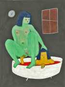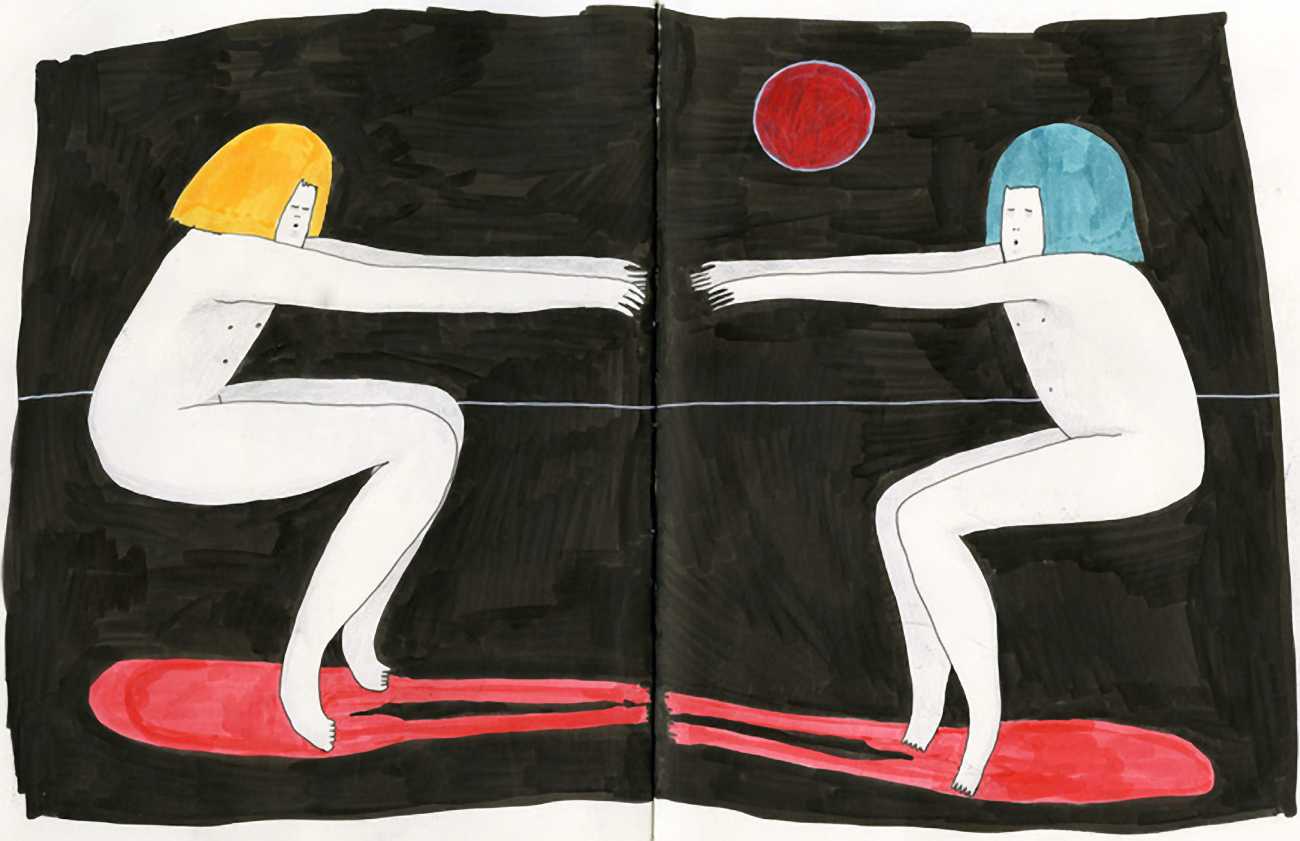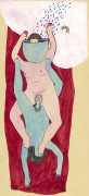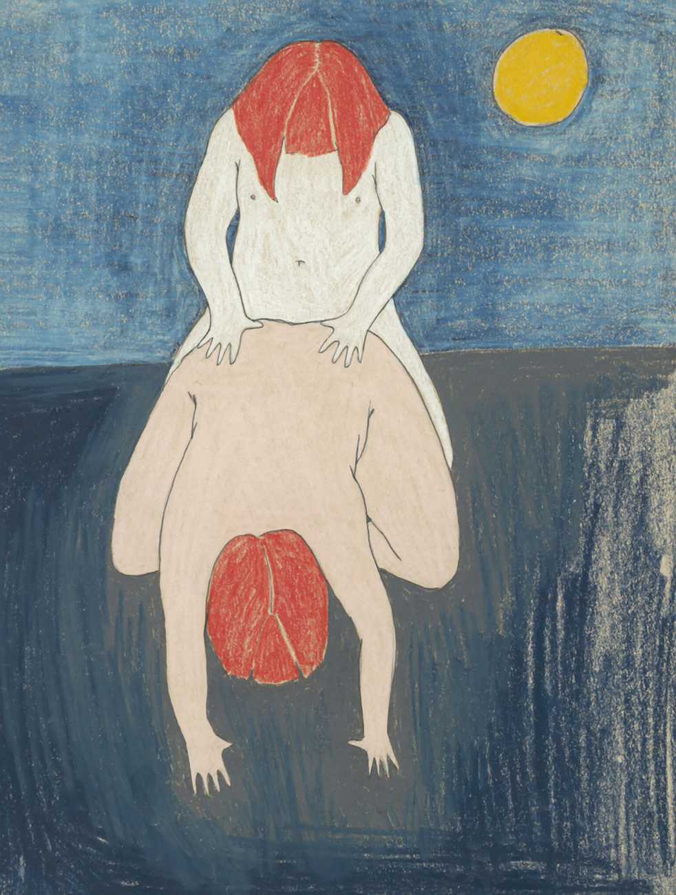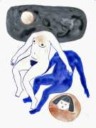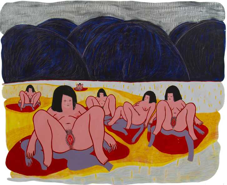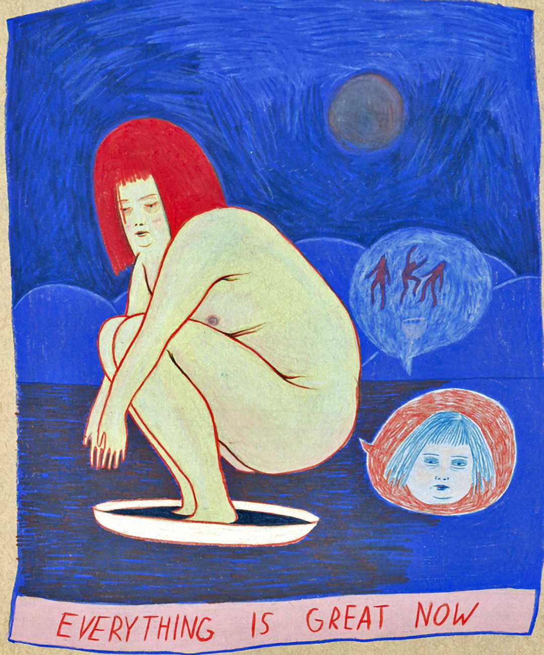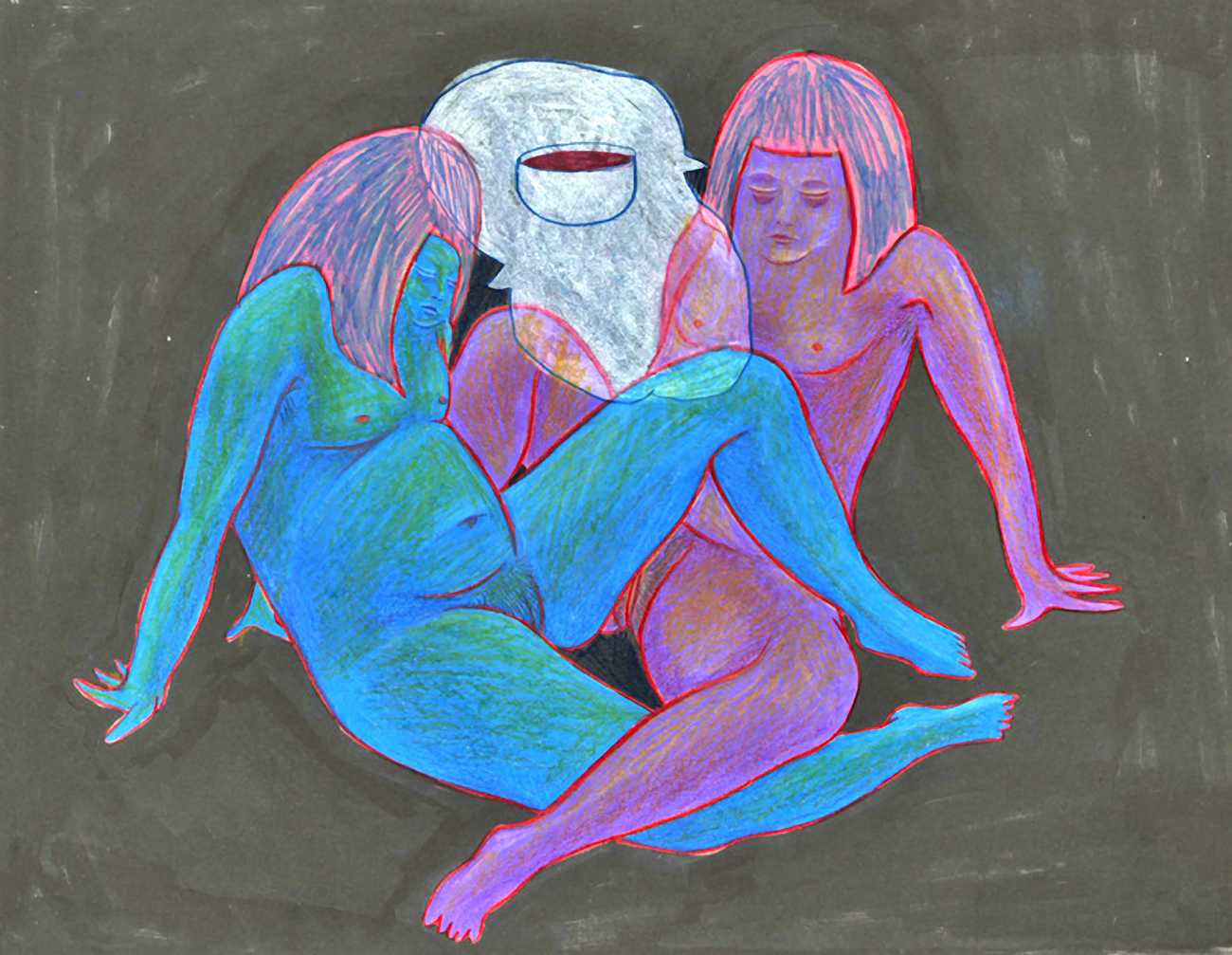 The affection in touch, being touched, and touching stretches across the surface-based work, provoking a viewer to feel big love. Often the tiny childlike characters sexually experiment between two worlds – a ghostlike past and a present orgasmic setting. With clear representation of sexual interactions with both highly rendered and gestural elements, she provides blaring commentary on the casual interactions of a stagnant solitary search for sexual comfort. In the midst of climax, tears are often indistinguishable from pussy squirts and cum shots.