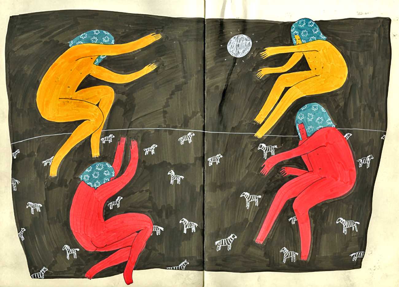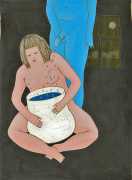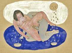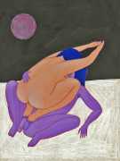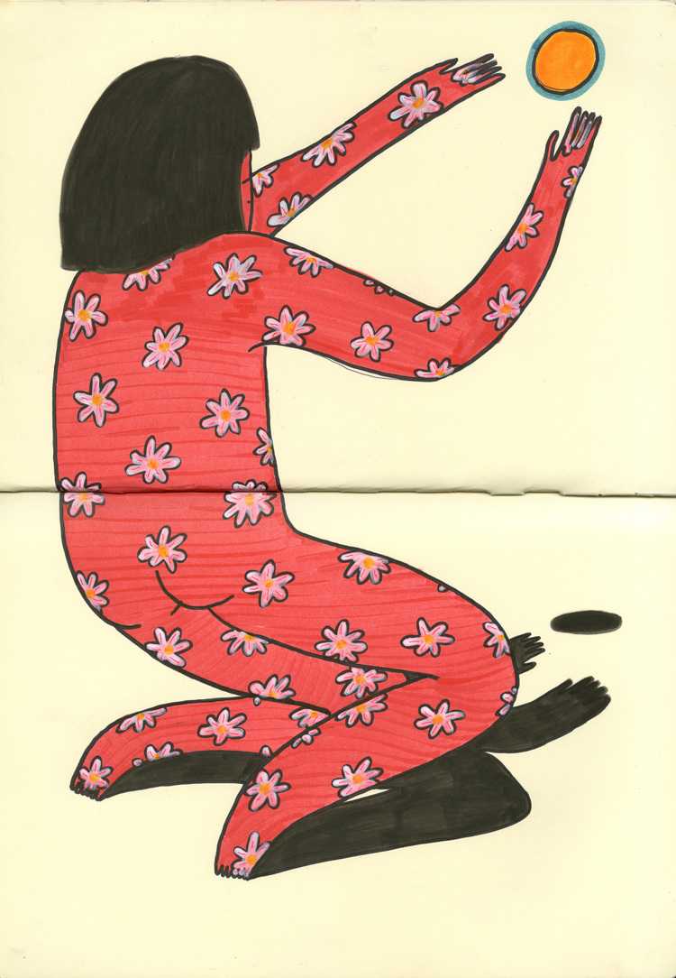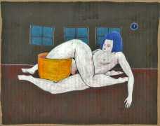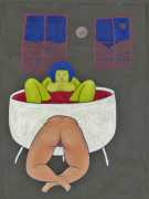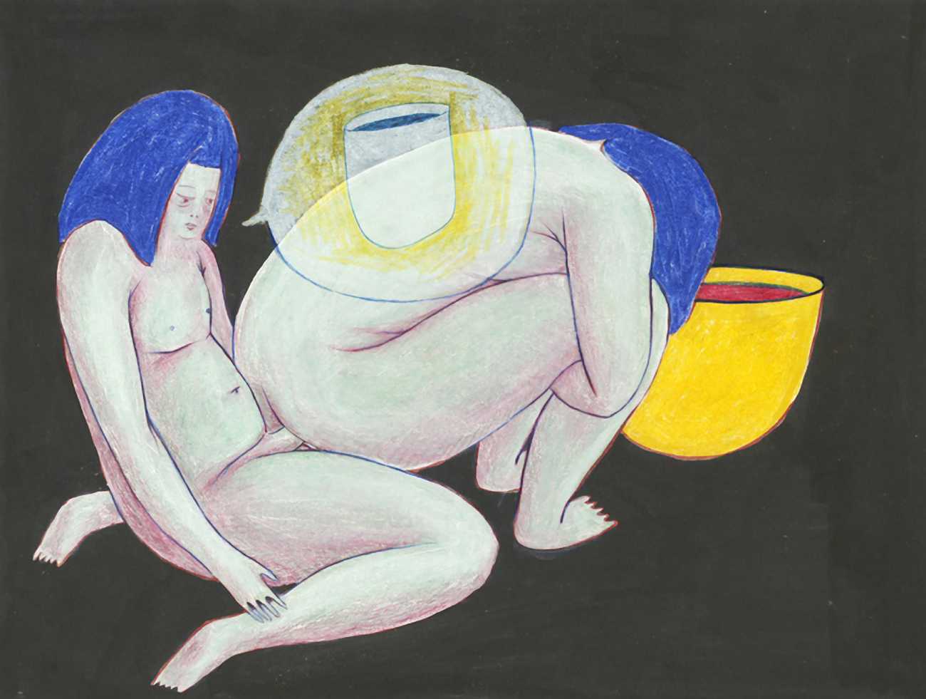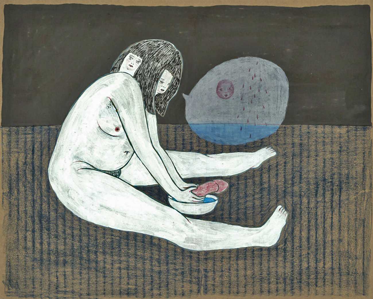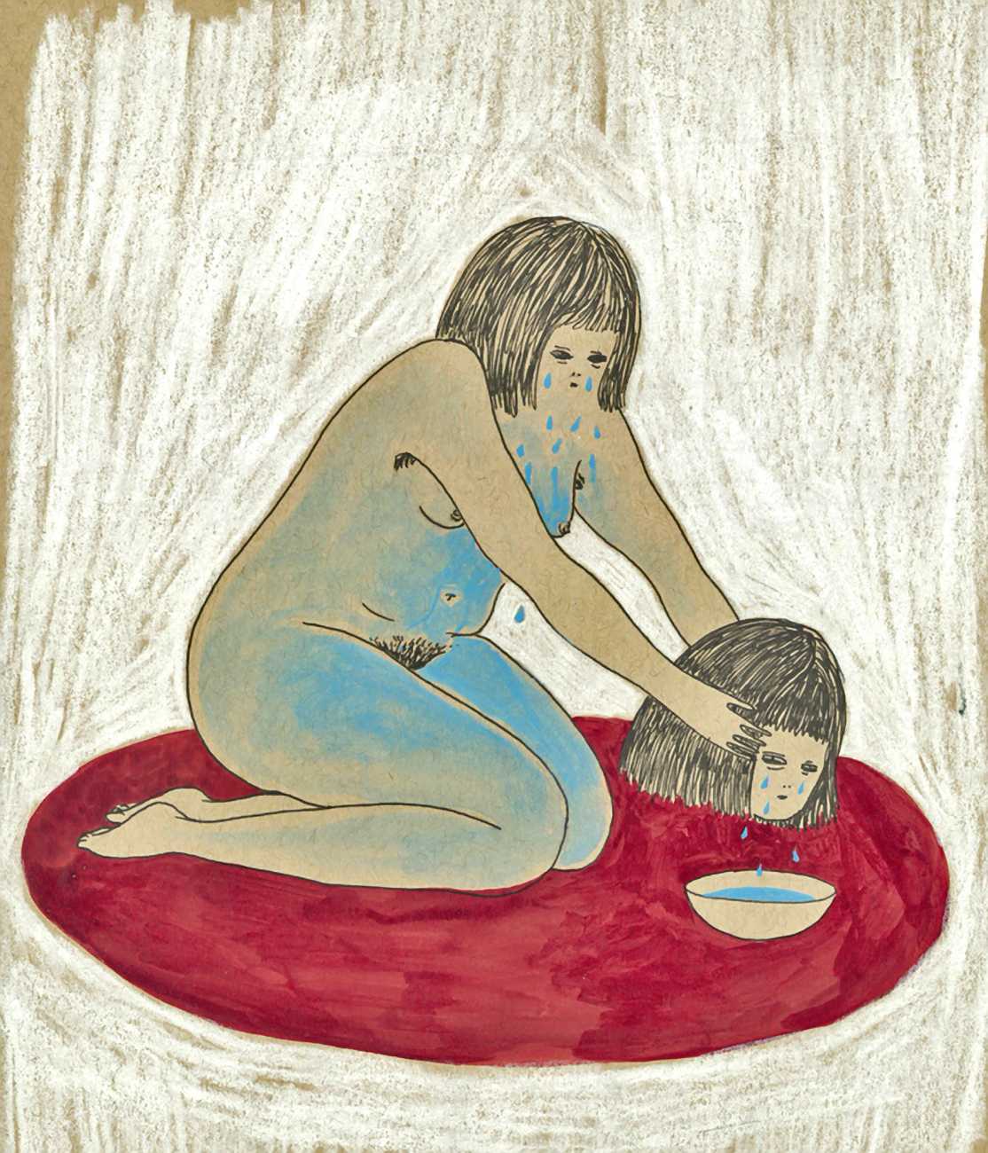 The affection in touch, being touched, and touching stretches across the surface-based work, provoking a viewer to feel big love. Often the tiny childlike characters sexually experiment between two worlds – a ghostlike past and a present orgasmic setting. With clear representation of sexual interactions with both highly rendered and gestural elements, she provides blaring commentary on the casual interactions of a stagnant solitary search for sexual comfort. In the midst of climax, tears are often indistinguishable from pussy squirts and cum shots.