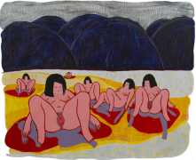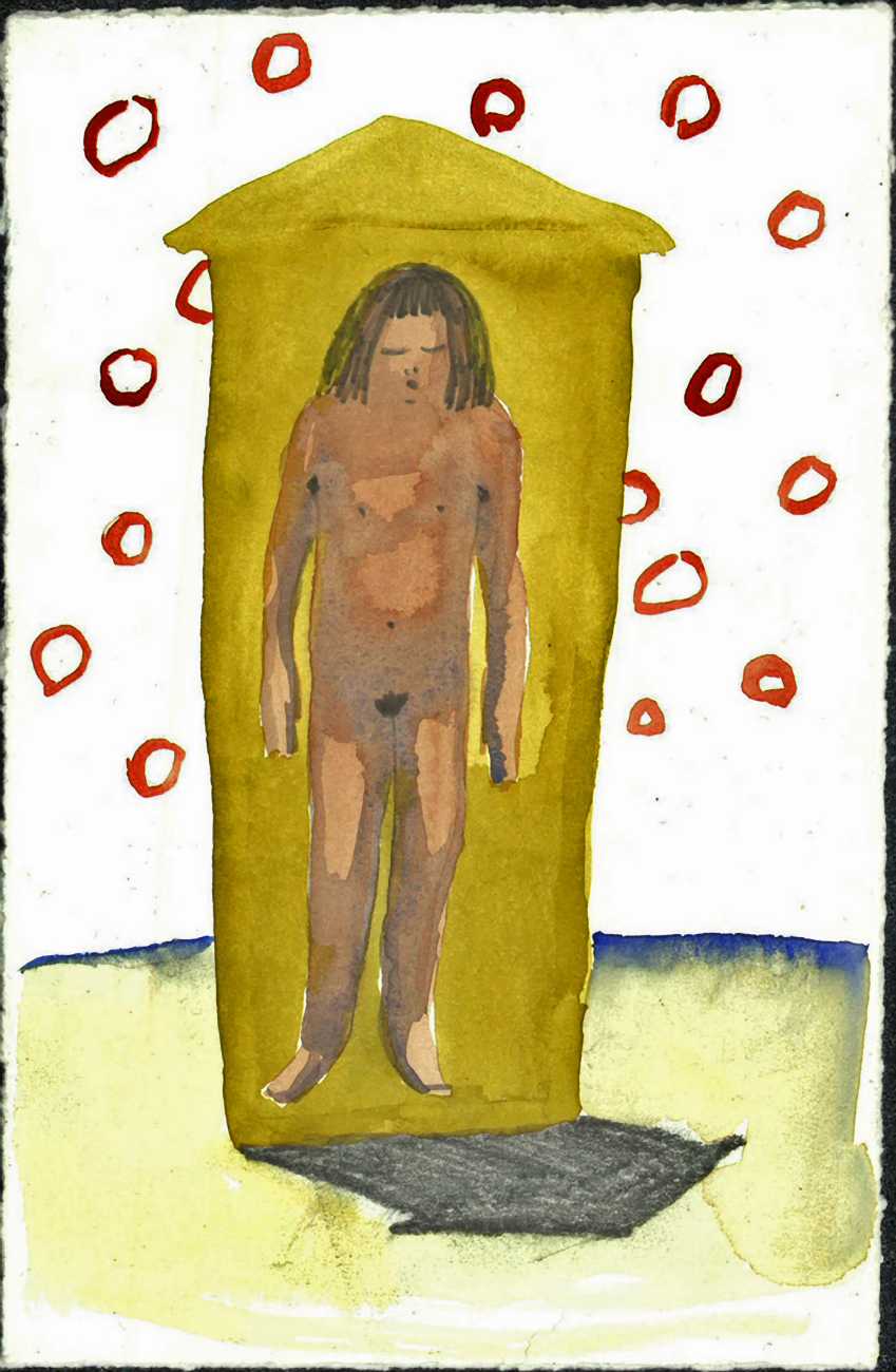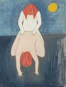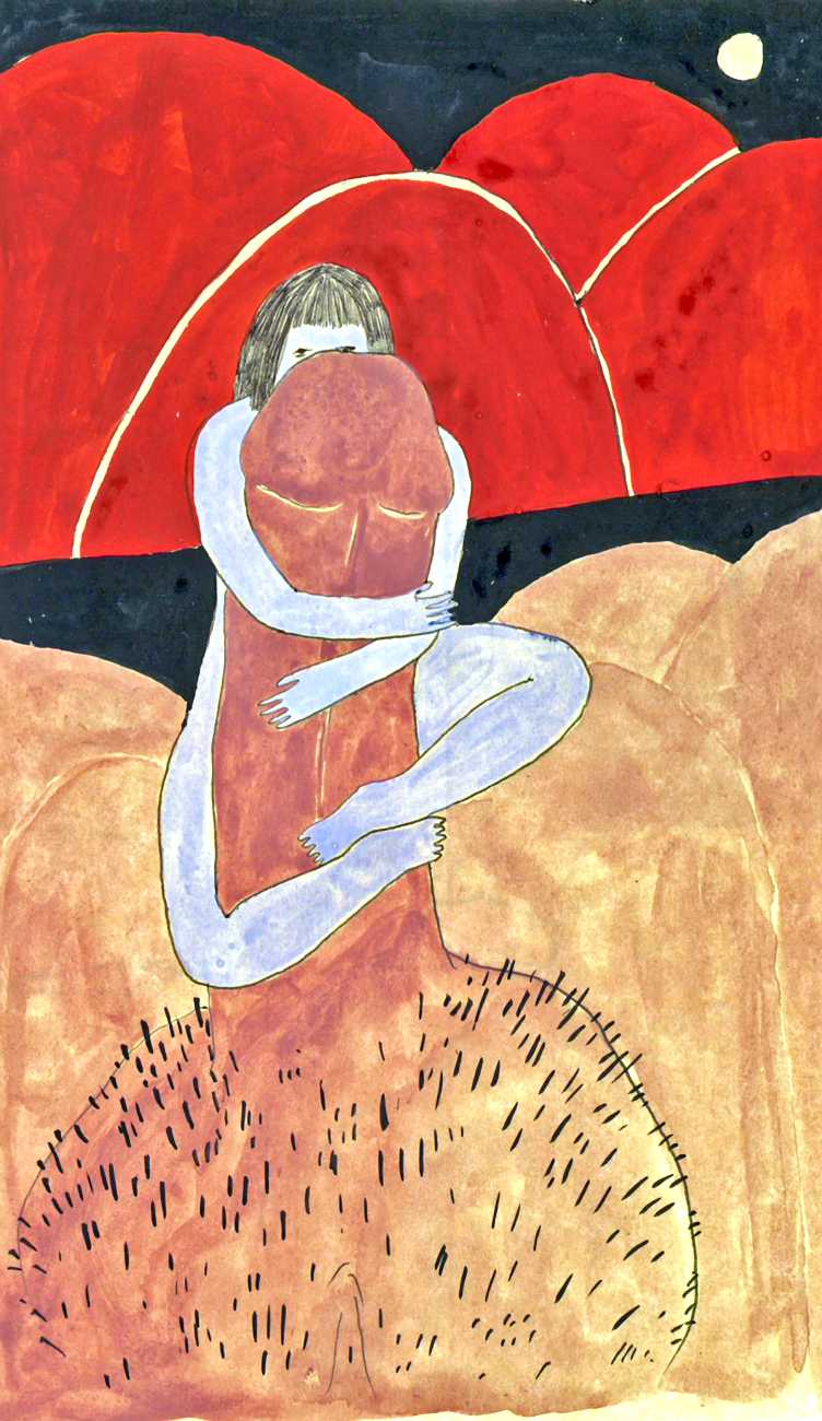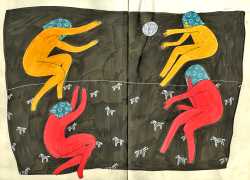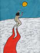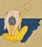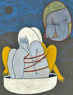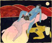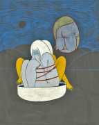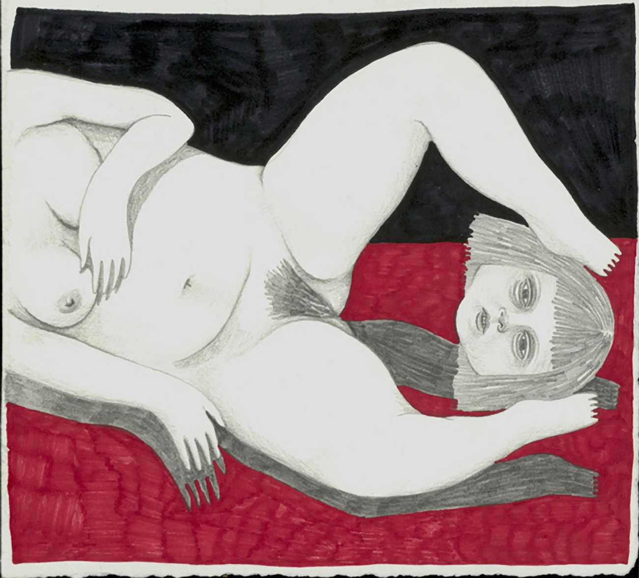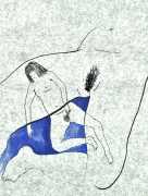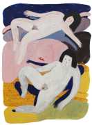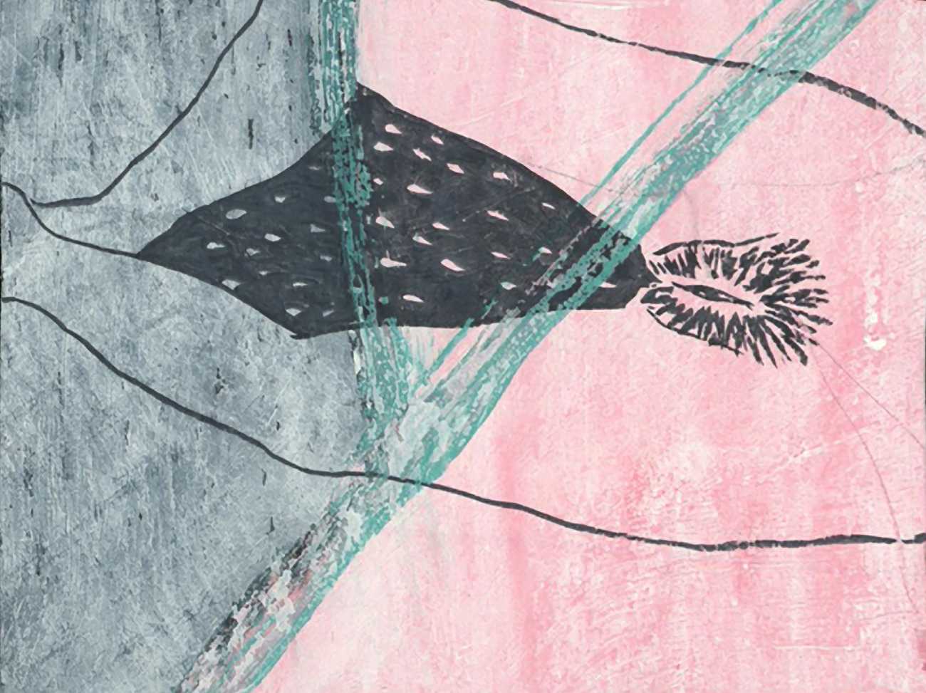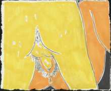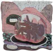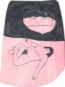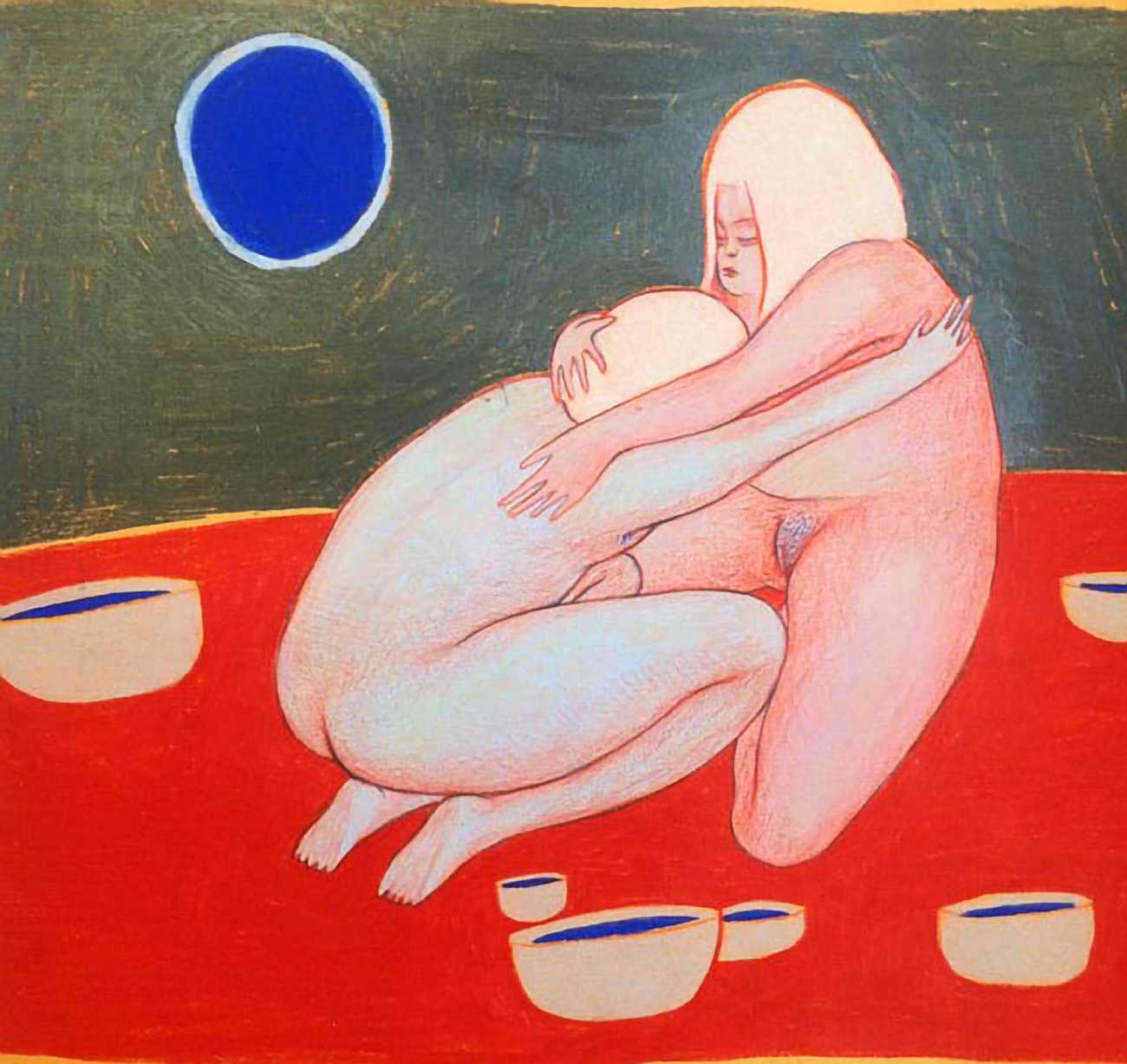 The affection in touch, being touched, and touching stretches across the surface-based work, provoking a viewer to feel big love. Often the tiny childlike characters sexually experiment between two worlds – a ghostlike past and a present orgasmic setting. With clear representation of sexual interactions with both highly rendered and gestural elements, she provides blaring commentary on the casual interactions of a stagnant solitary search for sexual comfort. In the midst of climax, tears are often indistinguishable from pussy squirts and cum shots.