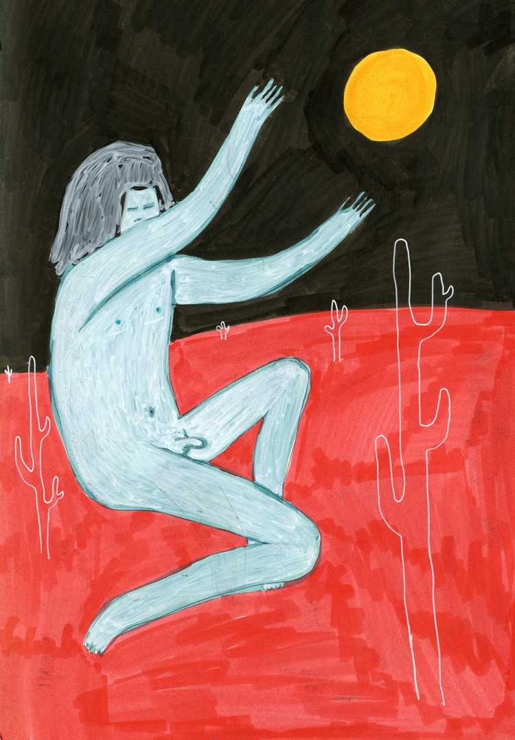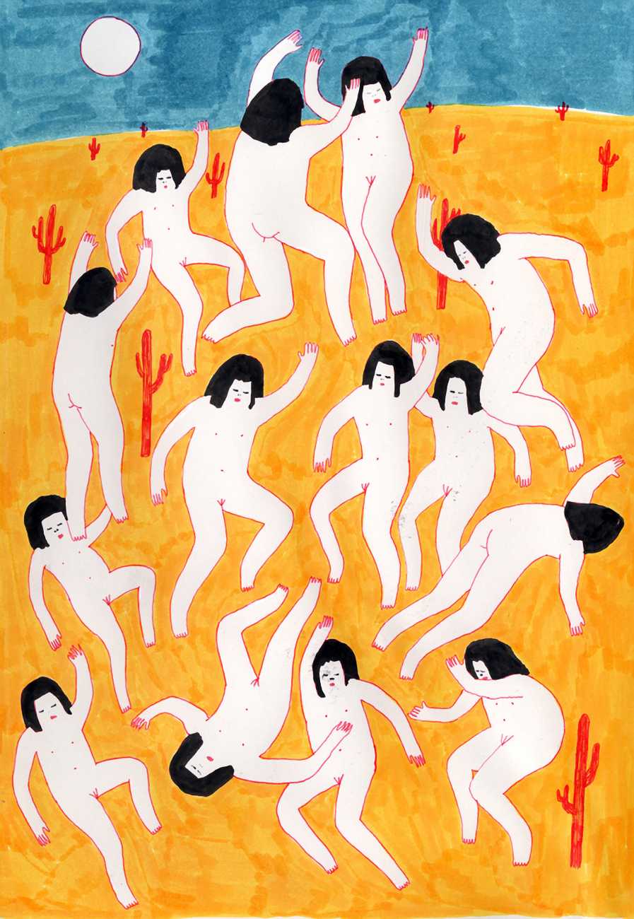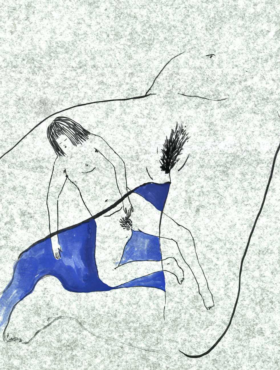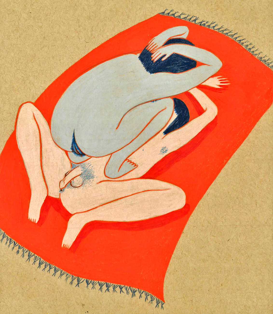 Her body of work is prolific with many playful, sexy illustrations of queer figures in bleak landscapes. Her cunning artistry portrays an intimate scrutiny while celebrating sentimentality.