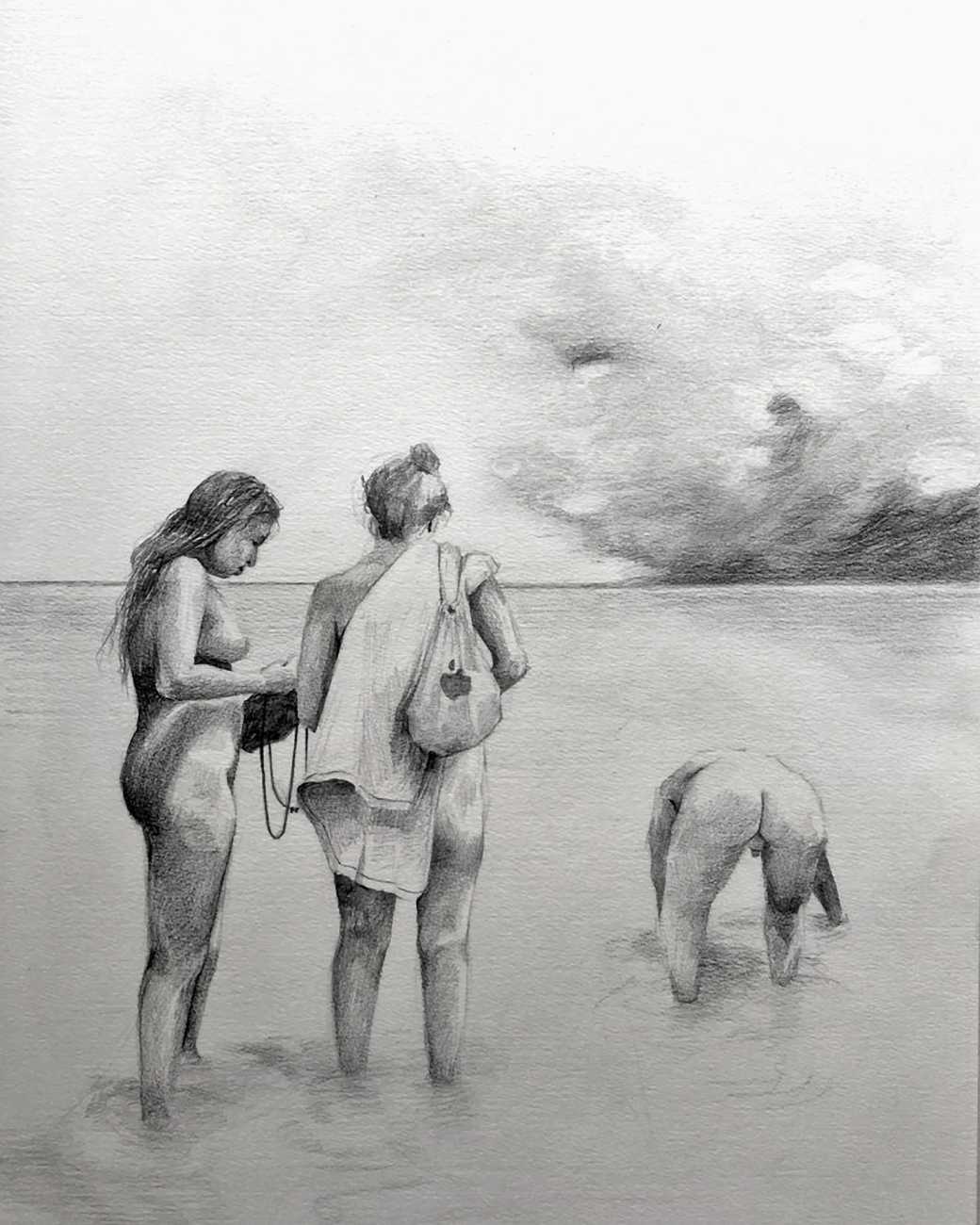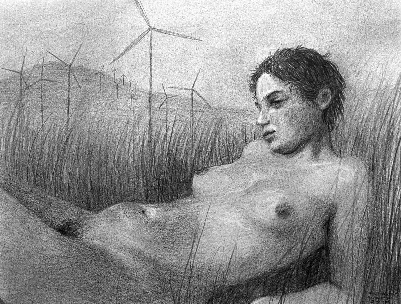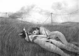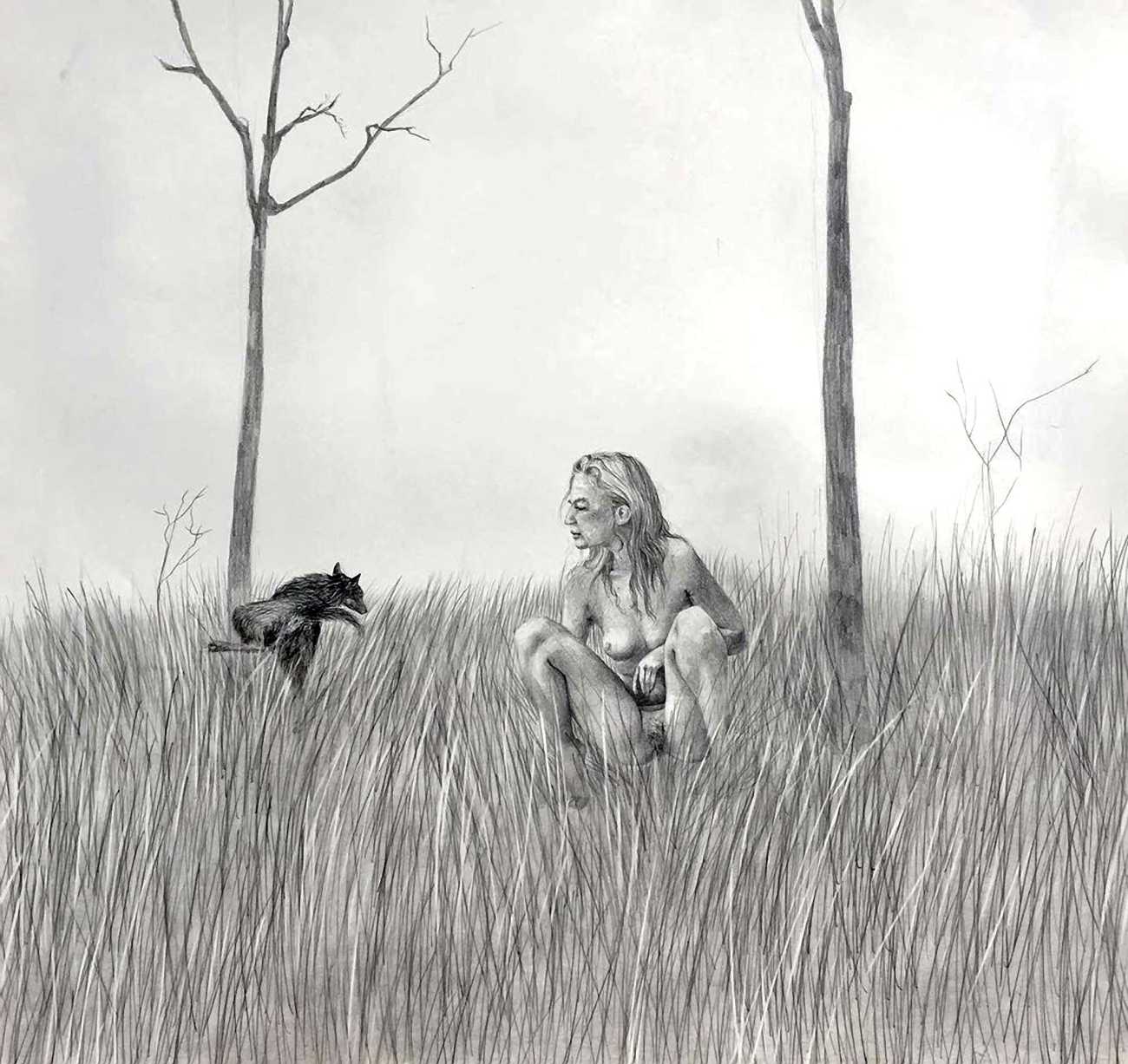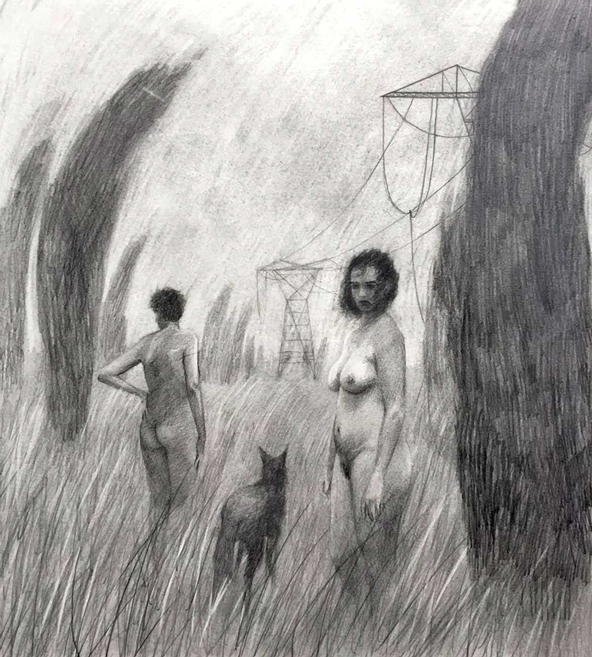 Waite’s naked or barely-clothed subjects roam in herds across windswept grass and wetlands and empty city streets. Scattered across the compositions, the last surviving totems of our obliterated civilisation can be seen – defunct wind farms and dilapidated telephone poles form symbols of the burning embers of humanity. She imagines these post-apocalyptic species as a combination of homoerotic, hermaphrodite, independent, nomads. The works are bound together by their unsettling ambiguity: are these subjects vacant, or aware of their past; are they empowered or abandoned; in peril or in paradise? Is theirs an escape from reality – or an inescapable fantasy?
