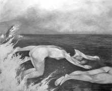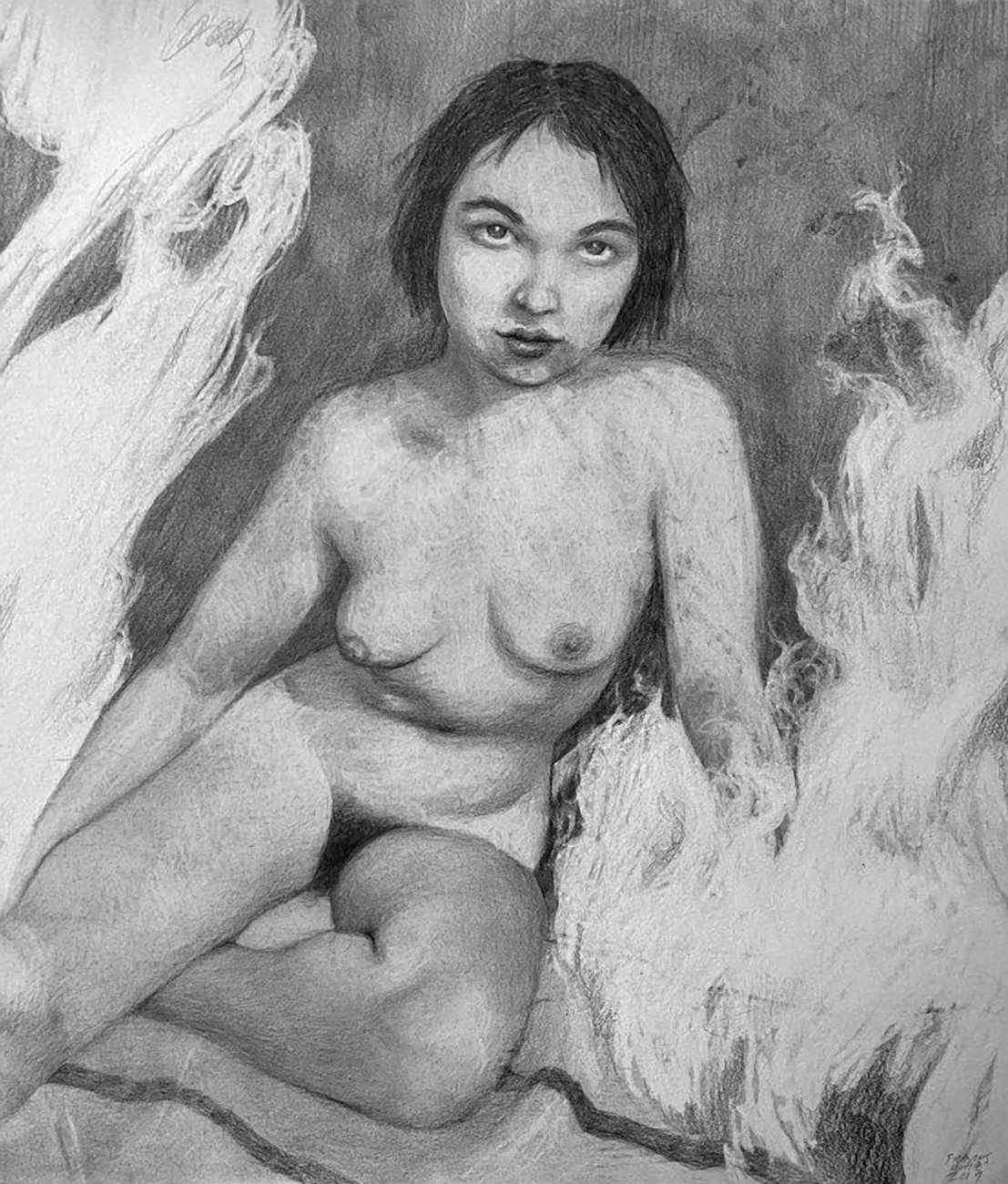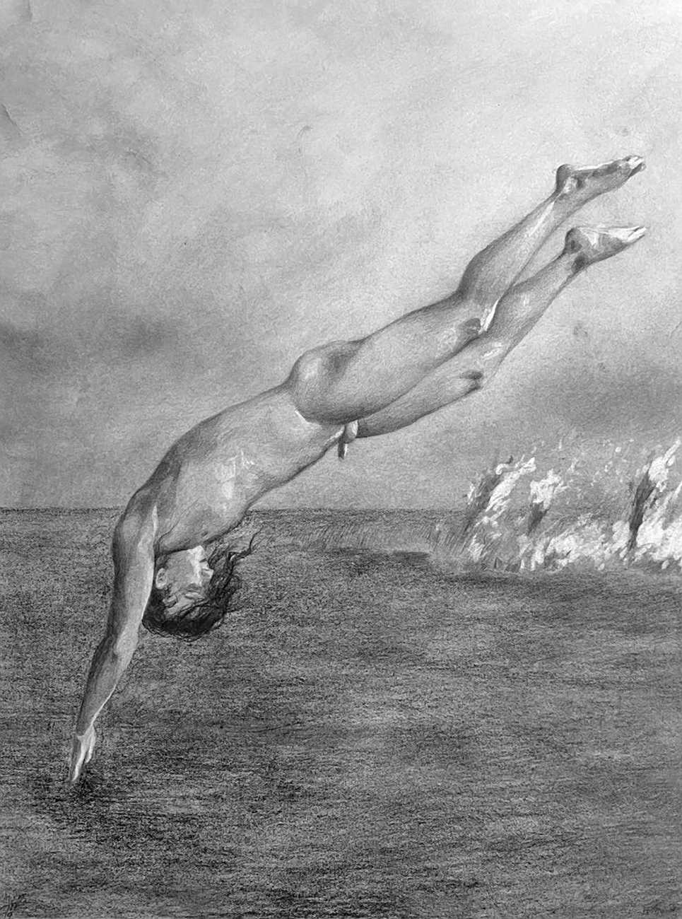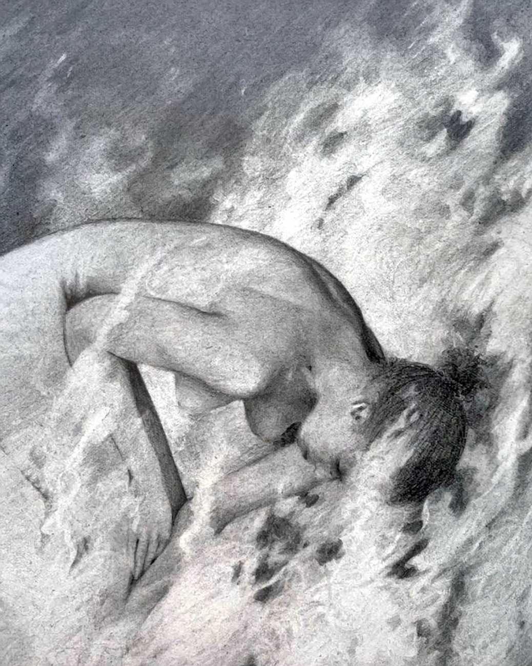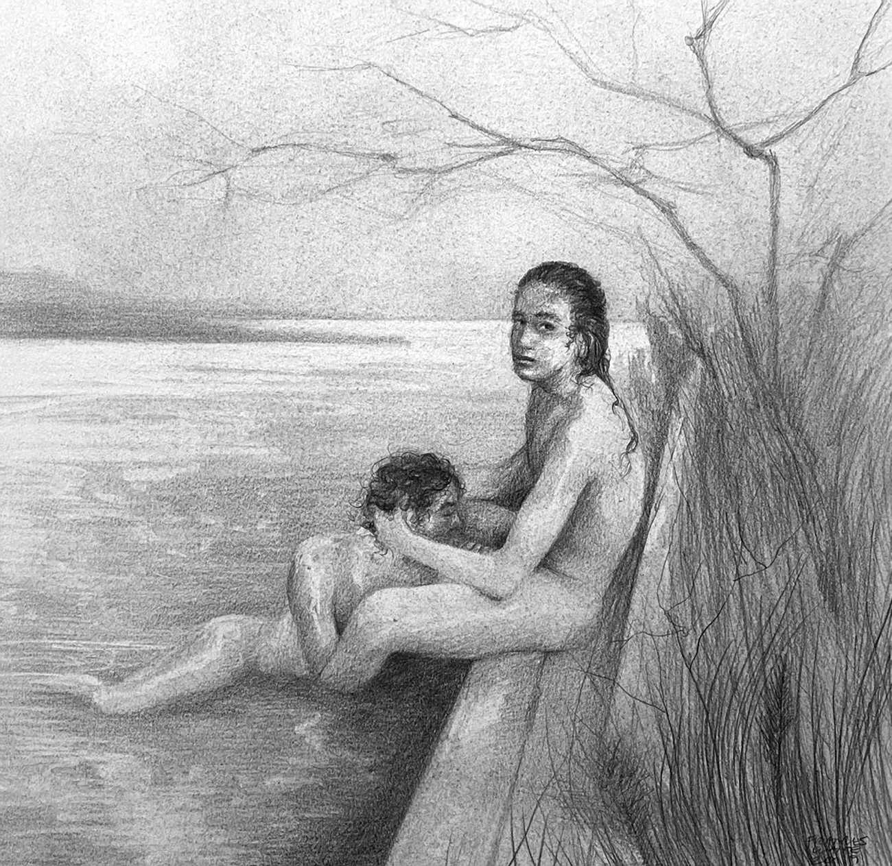 Waite’s naked or barely-clothed subjects roam in herds across windswept grass and wetlands and empty city streets. Scattered across the compositions, the last surviving totems of our obliterated civilisation can be seen – defunct wind farms and dilapidated telephone poles form symbols of the burning embers of humanity. She imagines these post-apocalyptic species as a combination of homoerotic, hermaphrodite, independent, nomads. The works are bound together by their unsettling ambiguity: are these subjects vacant, or aware of their past; are they empowered or abandoned; in peril or in paradise? Is theirs an escape from reality – or an inescapable fantasy?