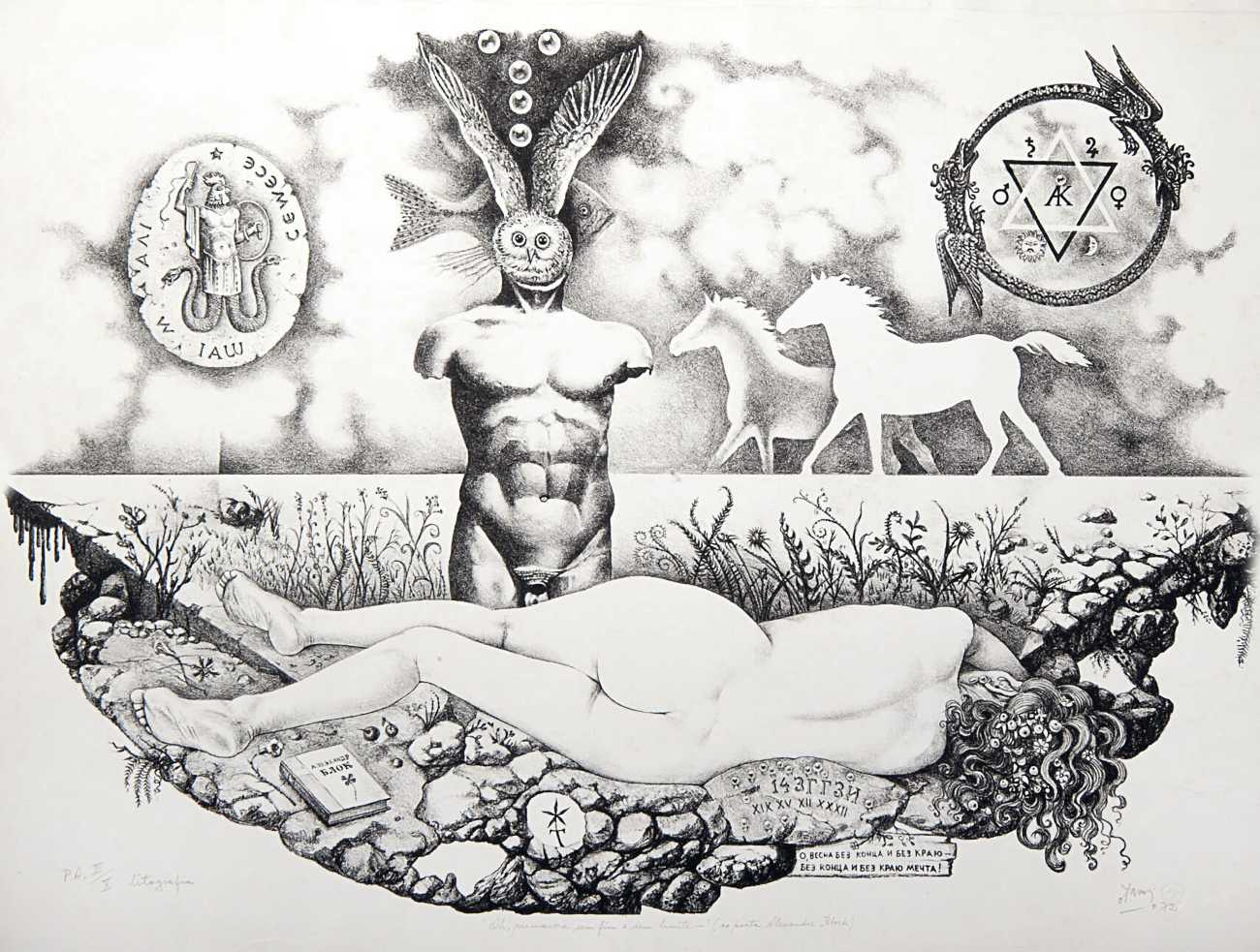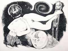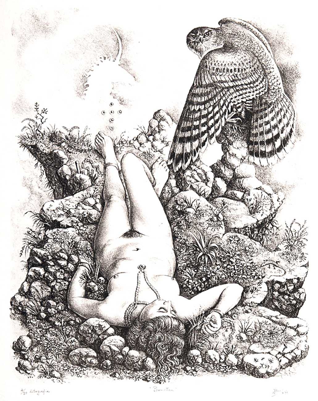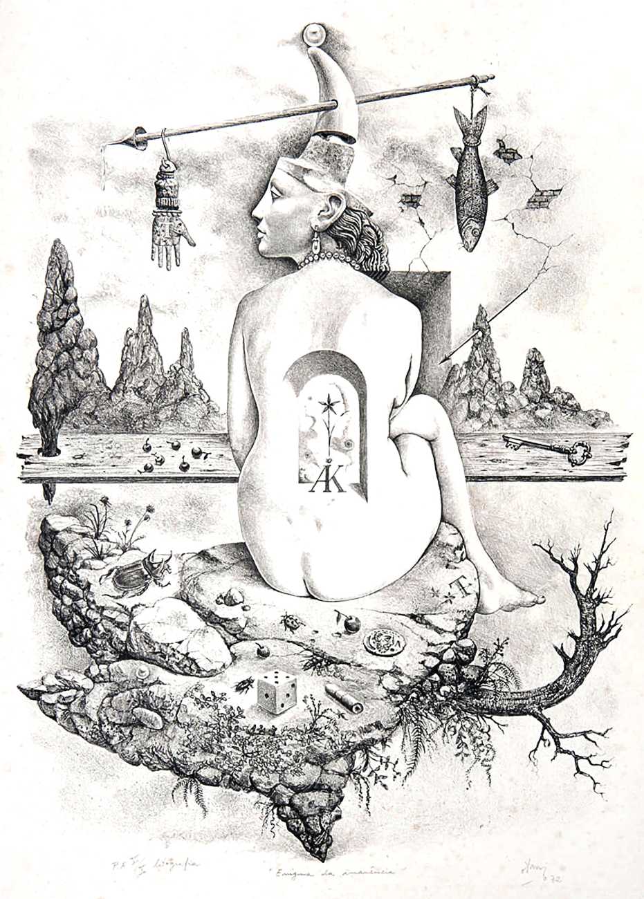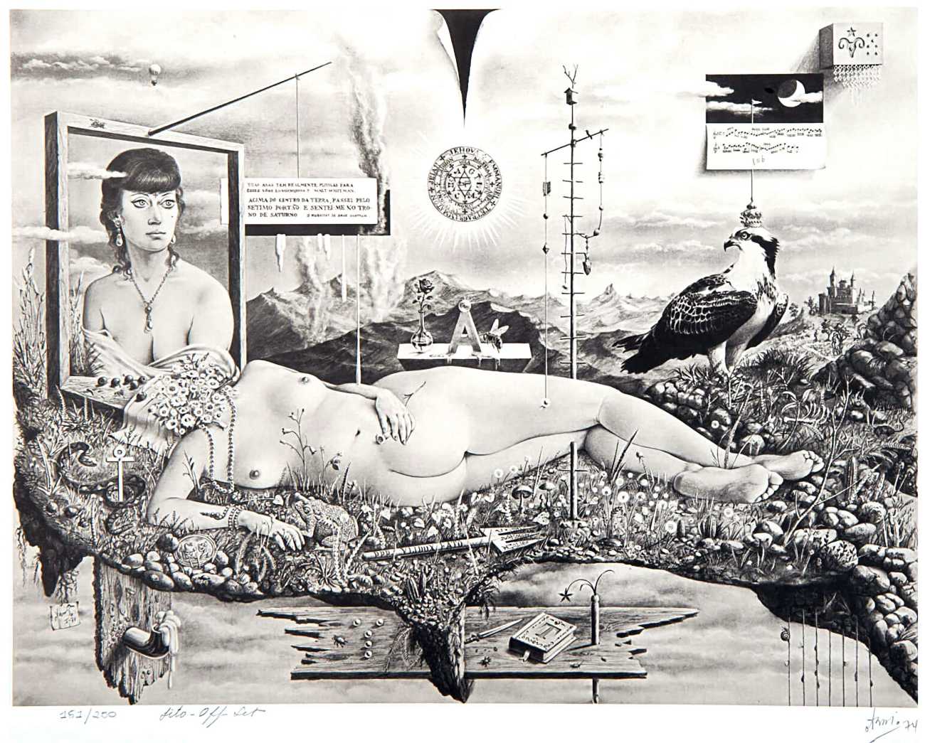 ‘Divulgação’ (Revelations) is the generic title given by Araújo to an extended series of engravings made in the 1970s, exploring mysterious and magical connections between the female figure, nature and sorcery. Each demonstrates the artist’s rich imagination, technical skill, and an ability to combine many disparate elements into a satisfying composition.