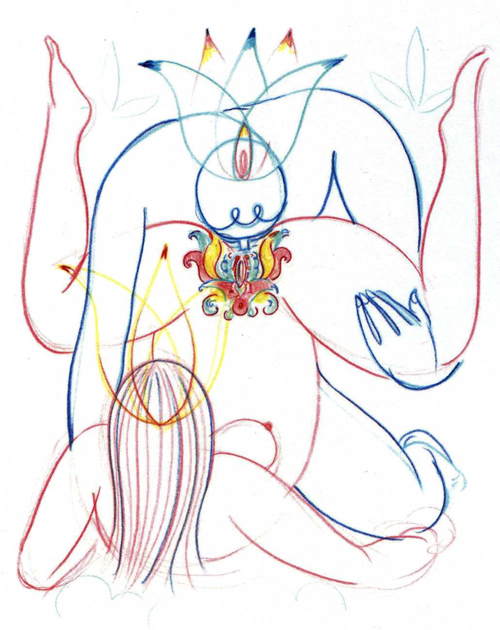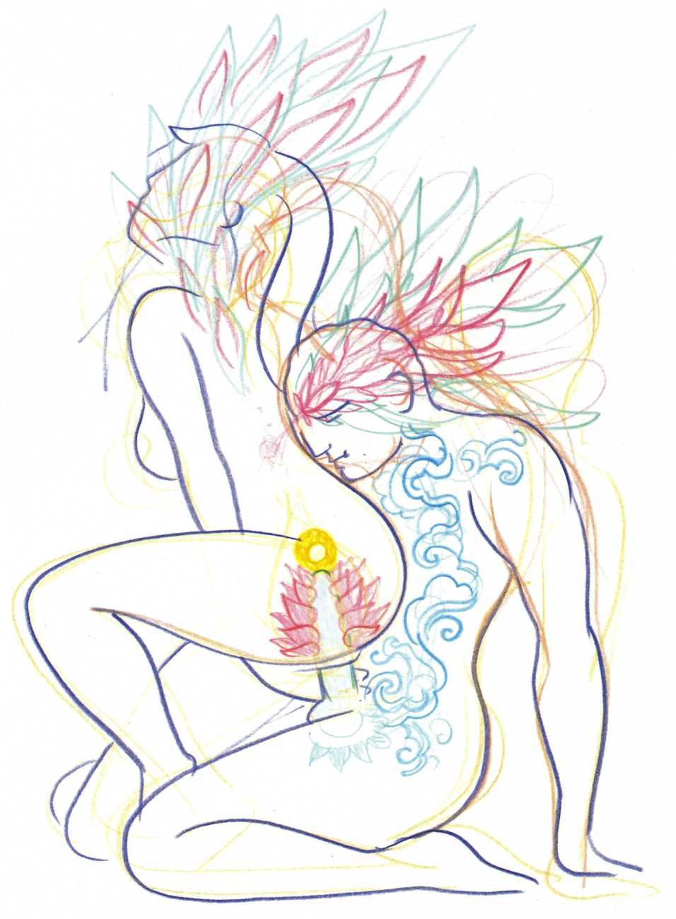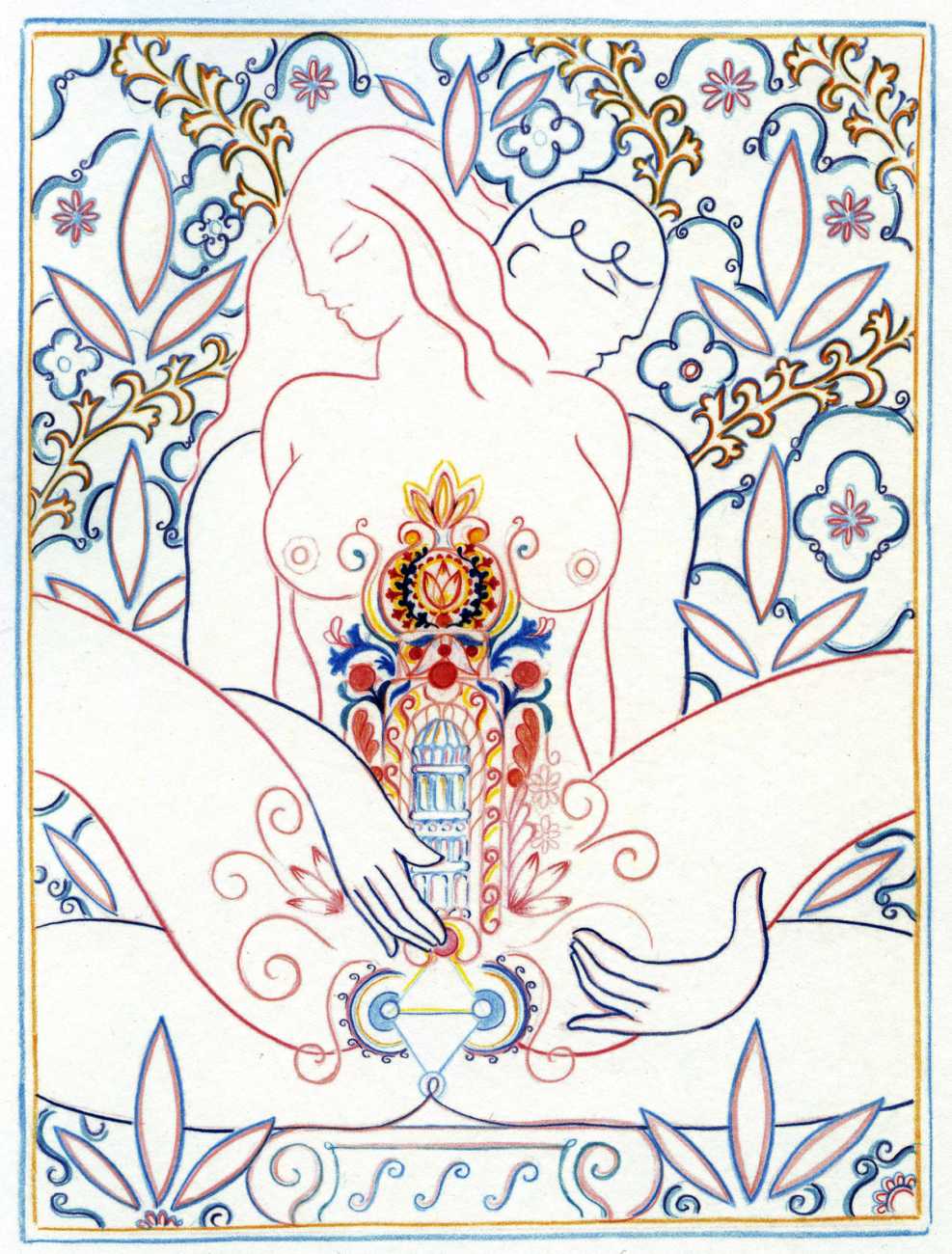 Thus the Sexual Journeying section begins, ‘In the altered states of eroticism, it’s possible to journey through a cosmology of different dreamtimes. It is a sexual odyssey transporting lovers through sublime realms – like the heart spaces of emotional connection, the psychic merging together through synchronised sensation, or the alchemical music of energetic harmonisation. Sometimes the journey passes into bliss, the spiritual dissolution of duality, where for extended moments the self is evaporated into the now, identity becomes impossible to locate because attention is so fully consumed by the experience of physical presence.’
