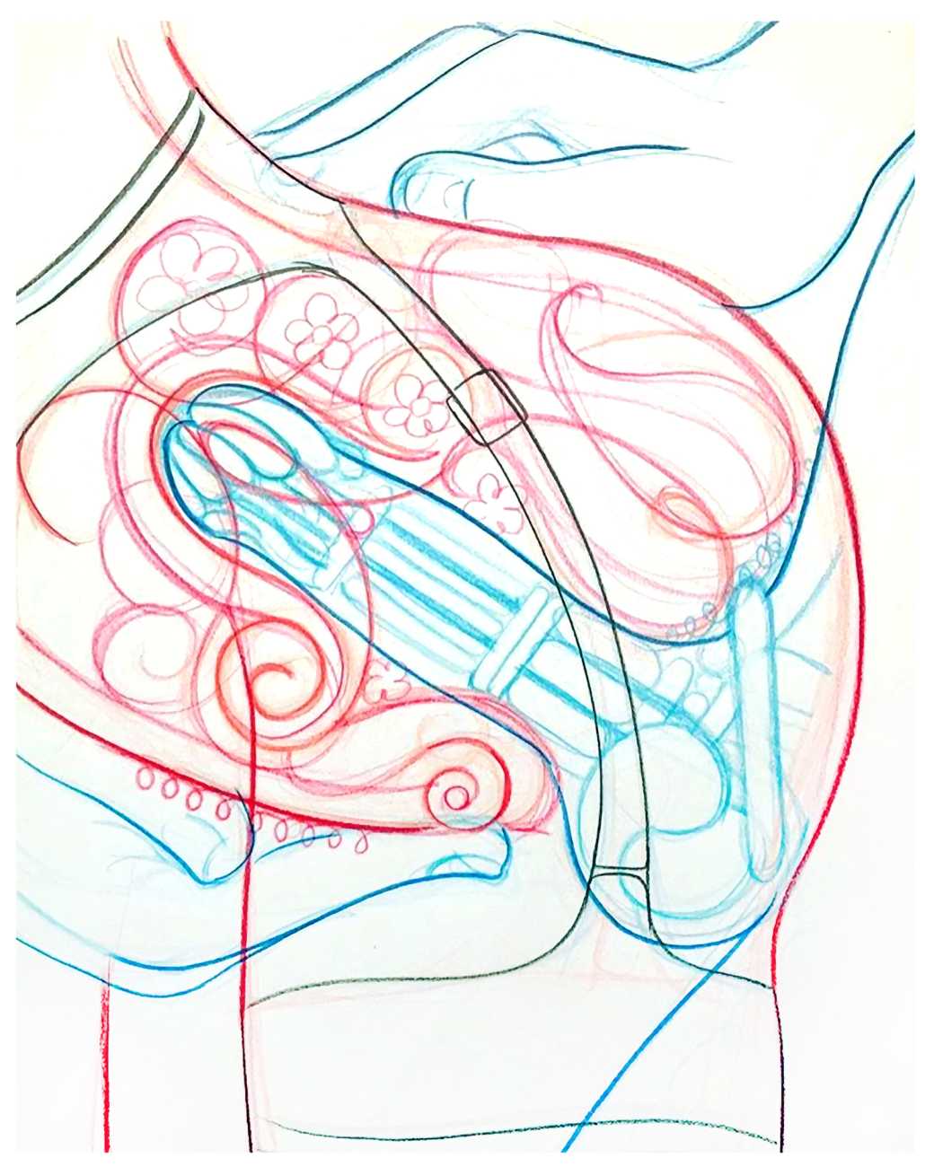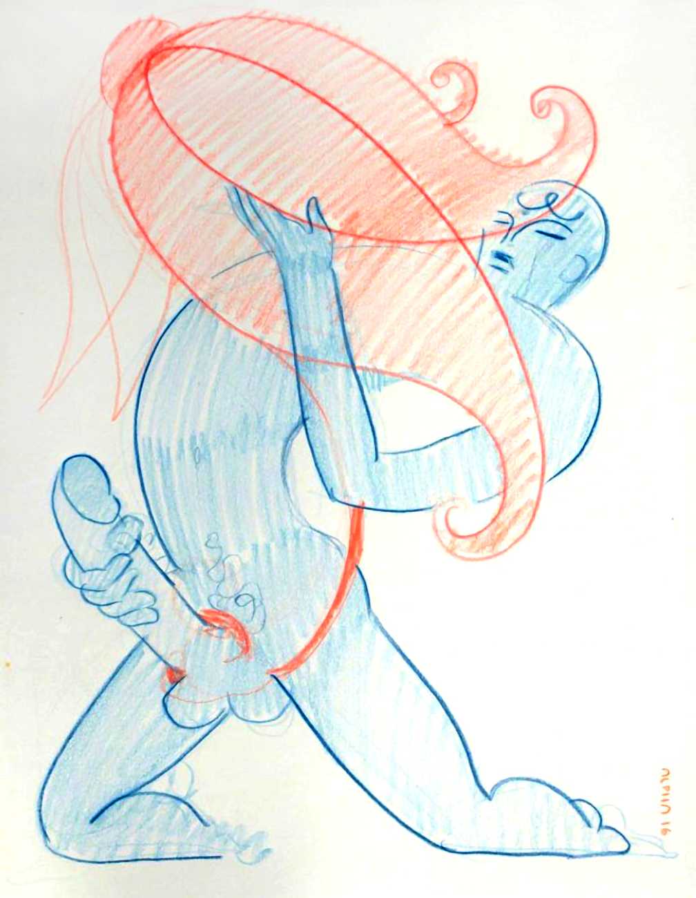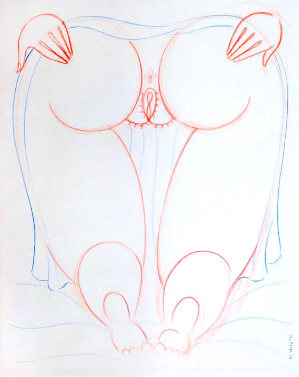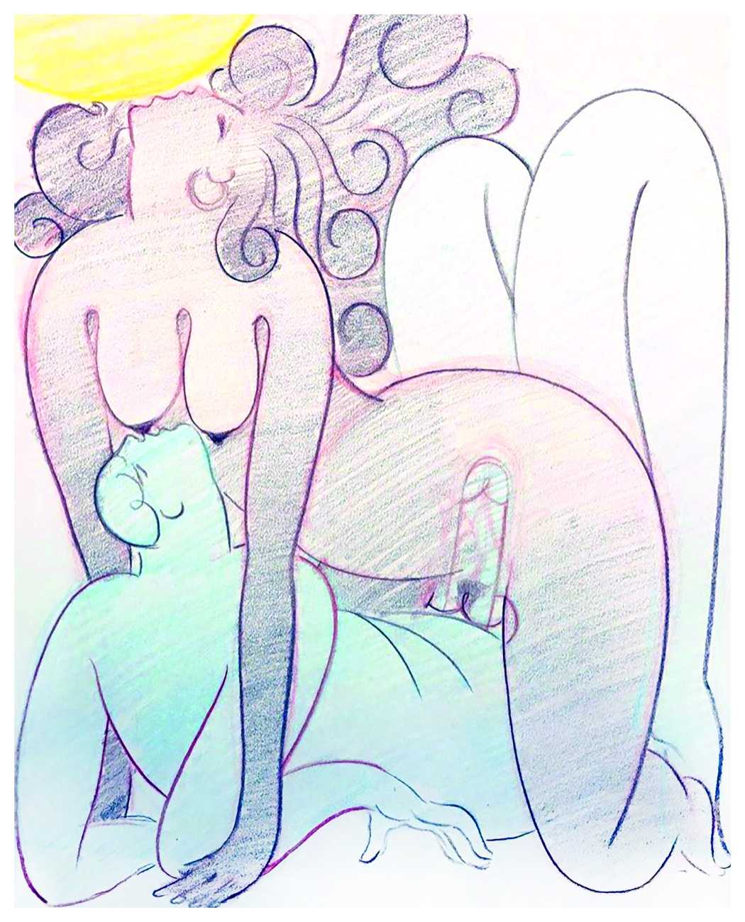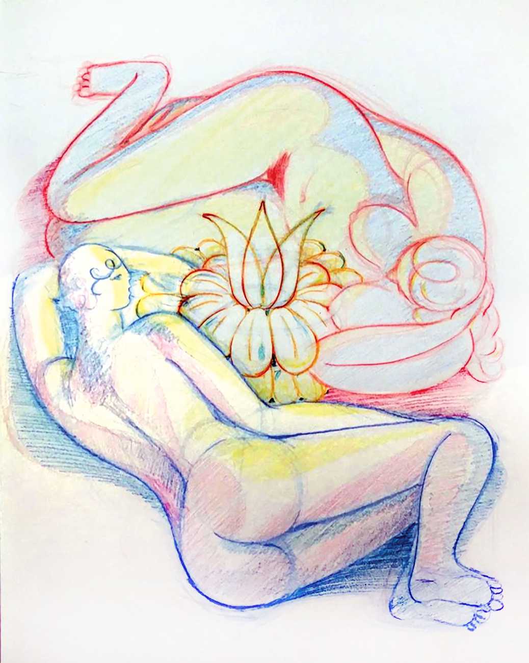 In figure drawing my attention was always on capturing the body, the form, the light. It was a very focused kind of effort, and while I deeply respect it, I found I was not expressing what was truly within me. It wasn’t until I dedicated myself to drawing my figures direct from imagination that things started to open up. Drawing without reference forces me to answer all kinds of questions on a personal level, like ‘what does the exquisite tension of lips pressed against a nipple look like’, ‘what does a sumptuous ass look like when it is seducing and inviting a lover towards it?’ Without objective reference, the next questions become, ‘What do I want it to look like?’ and ‘What about it is activating and exciting to me?’ This kind of questioning led me to a much more personal expression of the figure. I love the idea of bending and shaping bodies into forms that capture the sensation and experience of our realities; the physical, the energetic, the emotional, the spiritual.