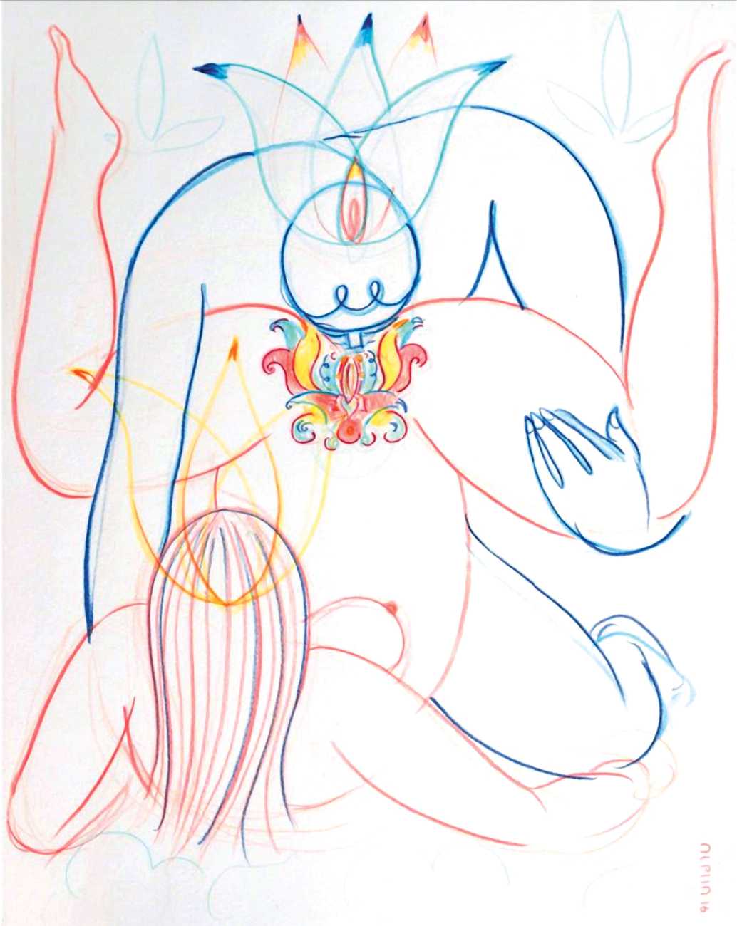 The poetry of Rumi has been a big influence on me. It’s shown me that art can simply be praise and an expression of joy and love. This kind of ecstatic art released me from the idea that art had to contribute some kind of innovation on culture in order to be validated. Novelty isn’t the only form of value, one can repeat what’s already been said a thousand times, and the deeper and more sincerely it is expressed the more its value increases. I draw my influences from a wide range of sources both high and low, from mysticism and the occult to folk art, outsider art and indigenous art, from pornography, kink and BDSM to yoga, tantra, and the healing arts.