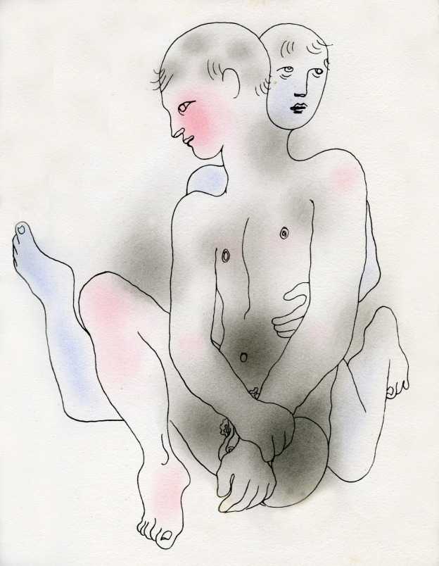 Jean Cocteau’s illustrations to Le livre blanc are among his best, his sure spare lines using minimum effort to produce erotic and compelling images of sexual joy and pain. The strategic use of a limited colour palette for emphasis adds to the emotional impact of the imagery.