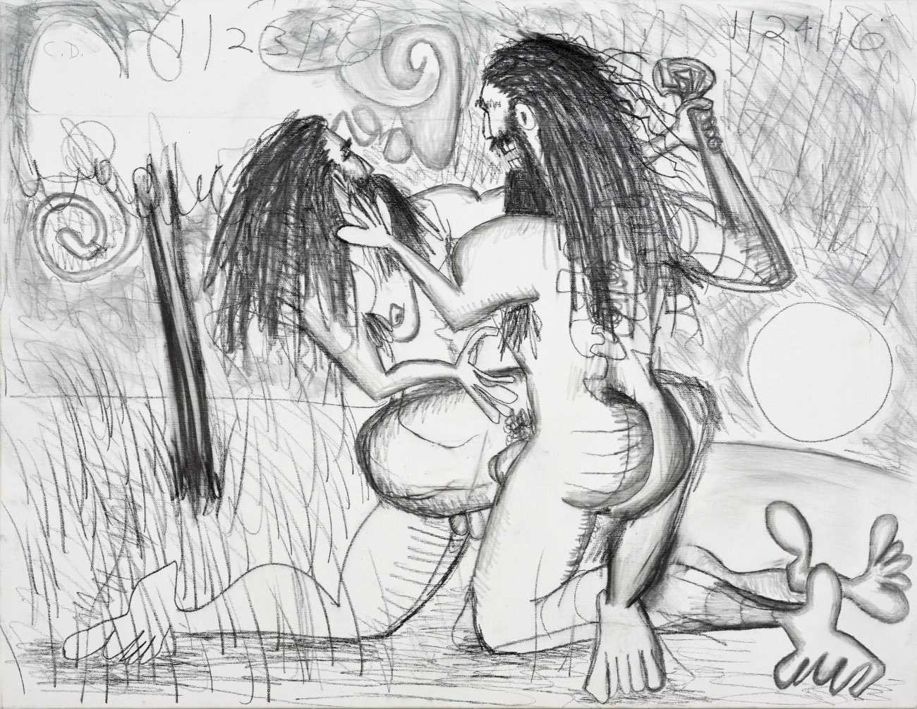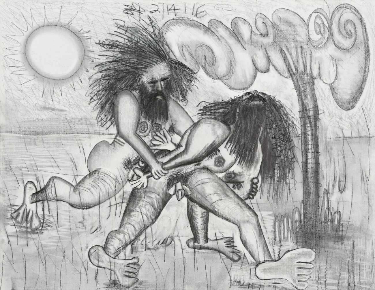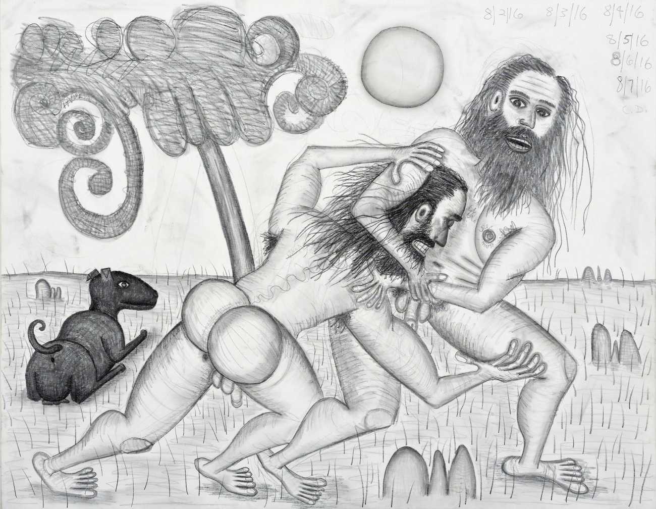 In 2016 Dunham turned from the stylised female body to the male, choosing to focus on the struggle between two naked men, overseen by a small dog. This series, entitled The Golden Age, represents Dunham’s preliminary sketches for the paintings in the Wrestlers sequence made between 2016 and 2020.