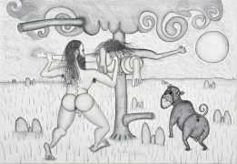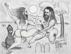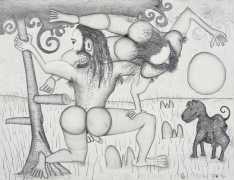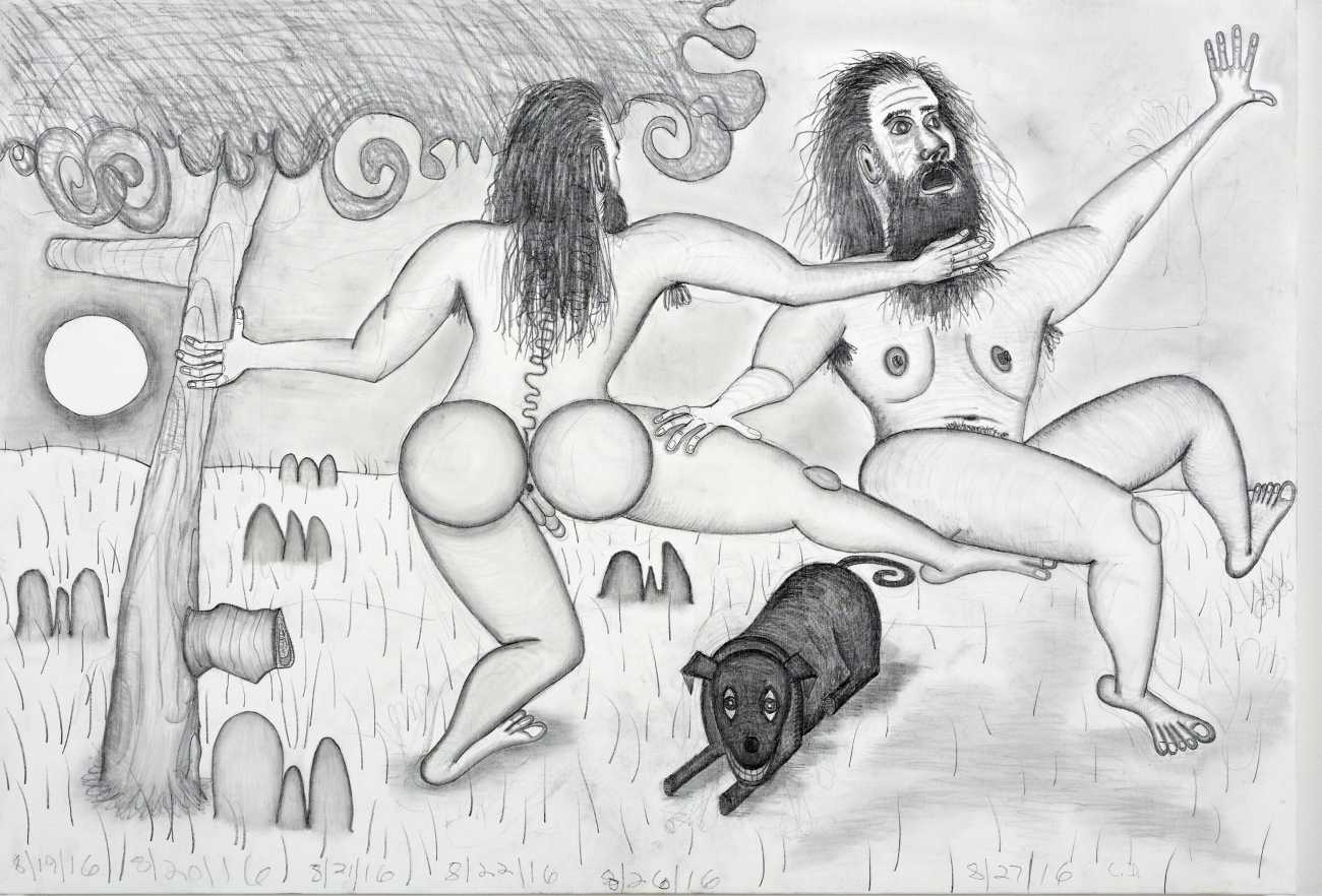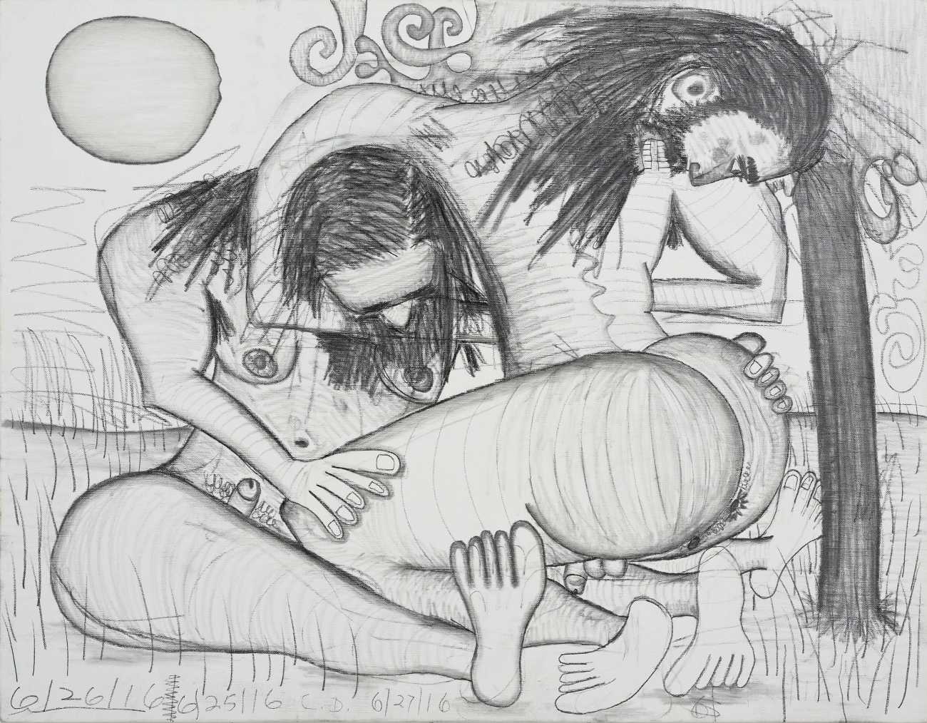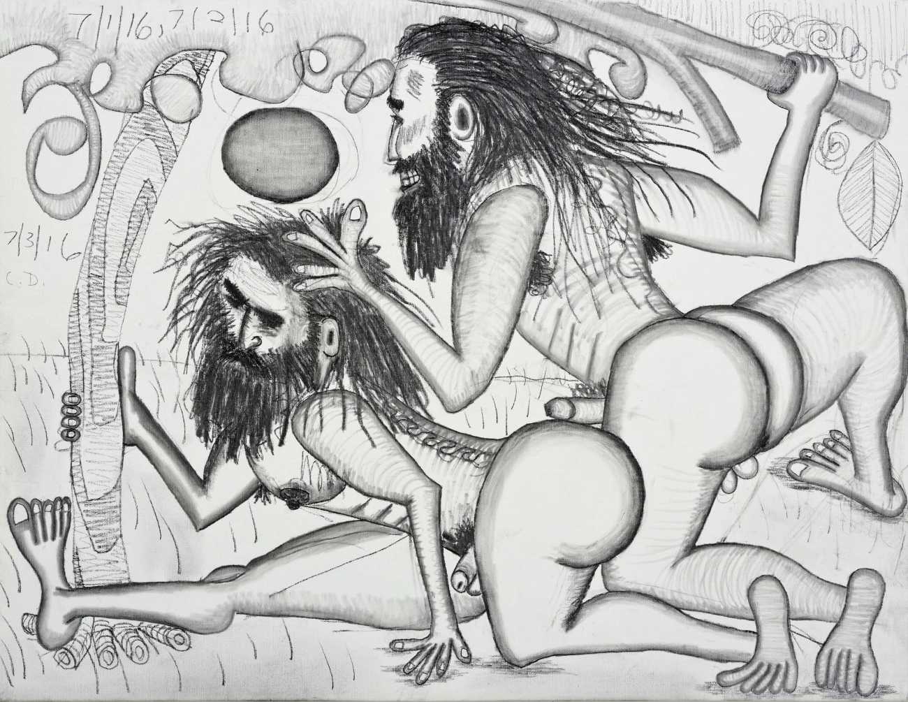 In 2016 Dunham turned from the stylised female body to the male, choosing to focus on the struggle between two naked men, overseen by a small dog. This series, entitled The Golden Age, represents Dunham’s preliminary sketches for the paintings in the Wrestlers sequence made between 2016 and 2020.
