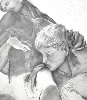 Patrick Angus’s drawings show his progress from an untrained amateur capturing näive beach scenes in Santa Barbara, to an accomplished artist portraying tender gay encounters. Several of the later drawings are preliminary studies for paintings, such as his Material World theatre scene of 1987.