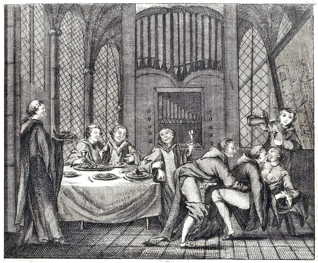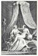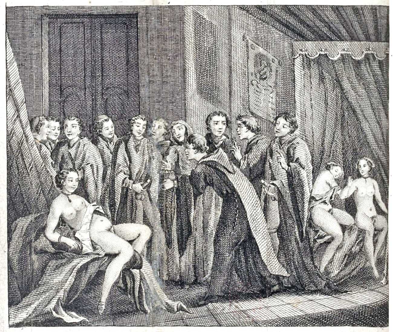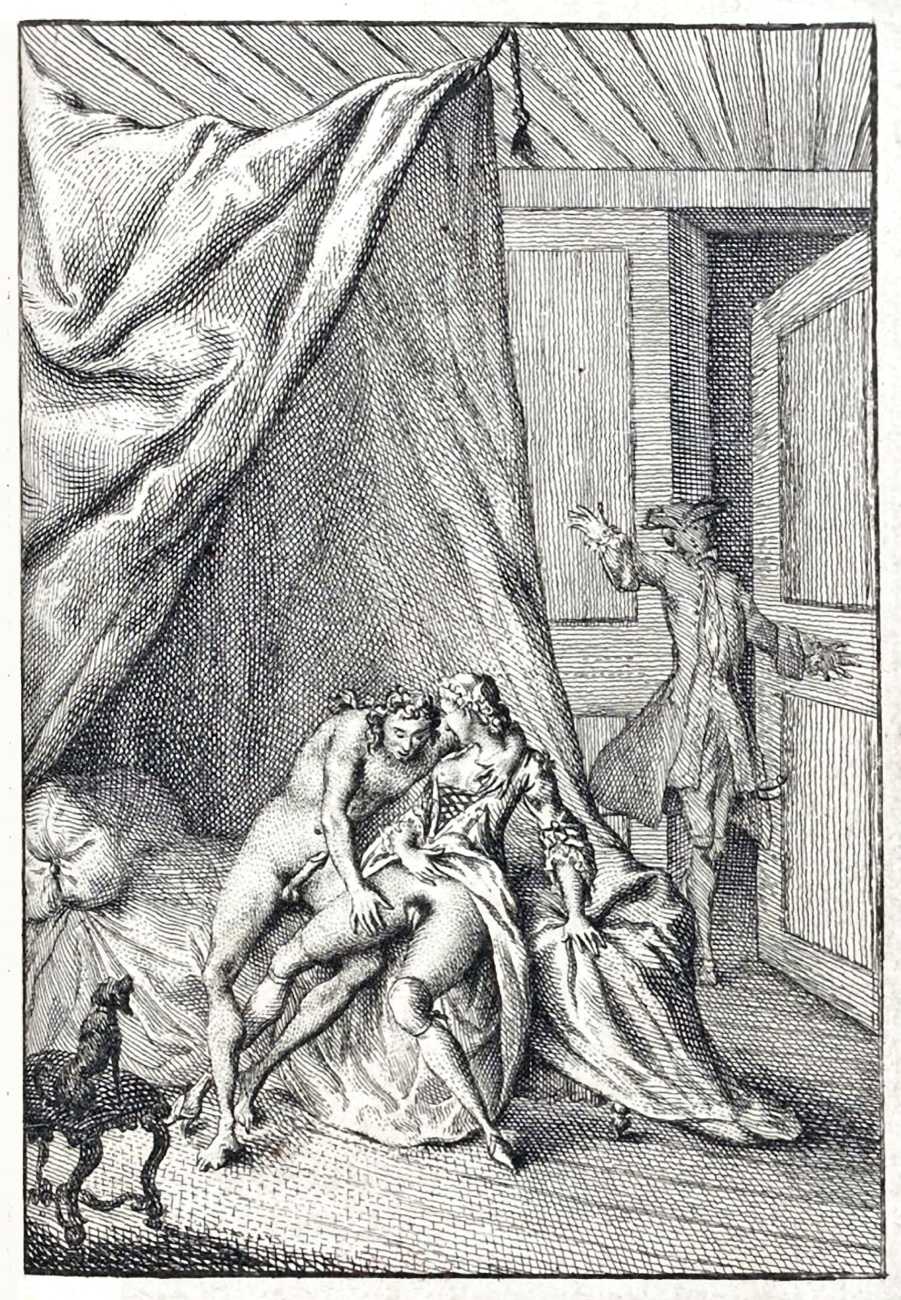 The 1740 edition of Dom B… contains eighteen anonymous engravings, all of them erotic apart from the last one, which depicts Saturnin’s reception by the Carthusians. In this copy, held by the Biblioteque Nationale de France, three of the engravings are misplaced – the 11th, 15th and 17th. The images are presented in the correct order here.