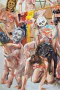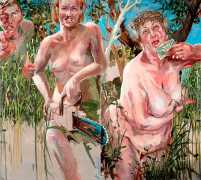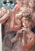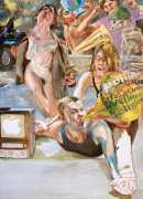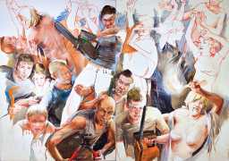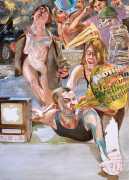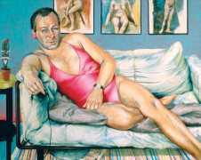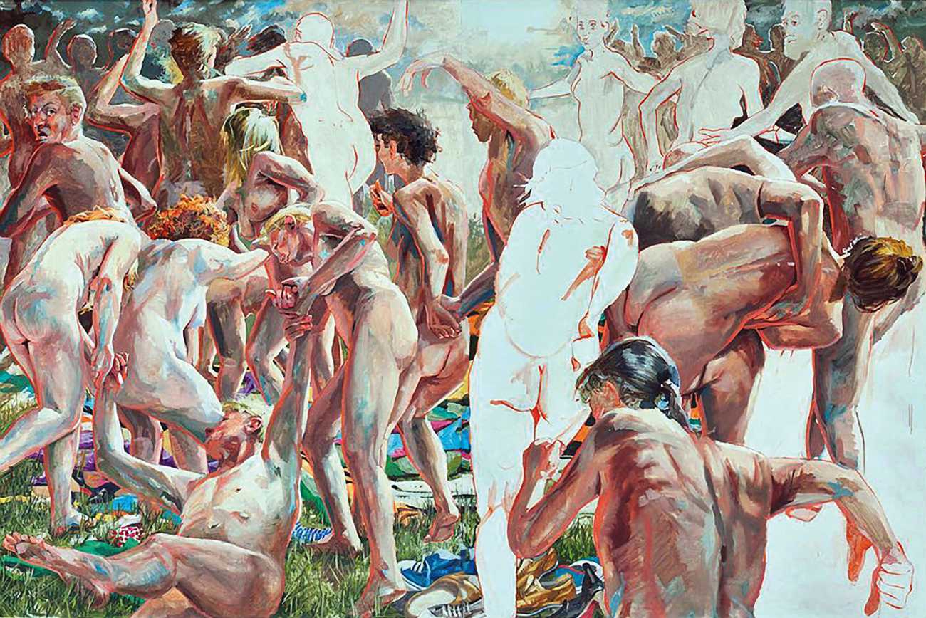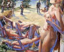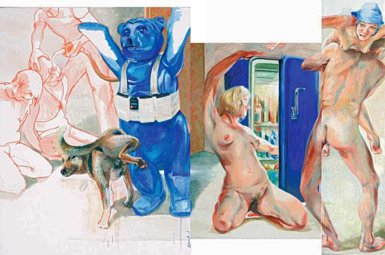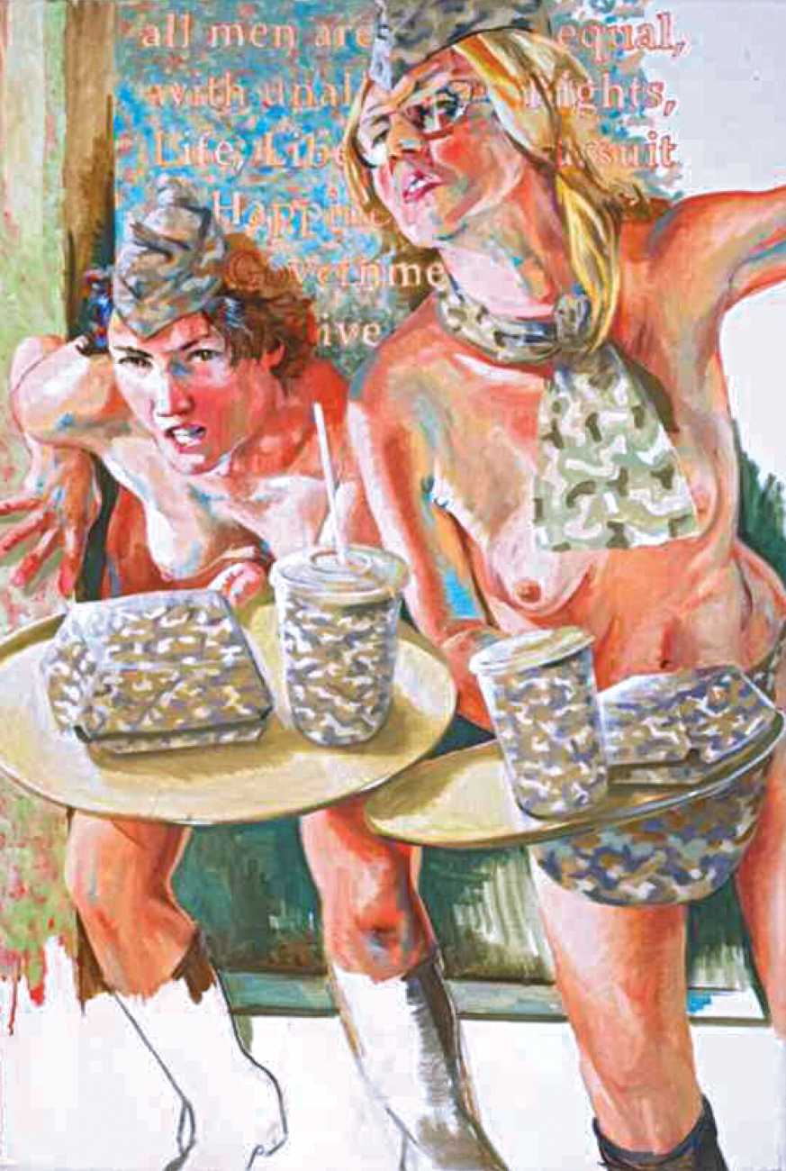 In his very distinctive paintings, Wendland provides an artistic commentary on many aspects of social, economic and political life in modern Germany. His large canvases reference well-known brand names and popular culture, as well as religion and politics, particularly the more militaristic aspects of post-Soviet Germany. Many include some degree of nudity, reminding the viewer that under the veneer of clothes and social conventions our naked bodies are always close to the surface.