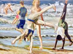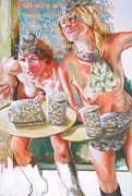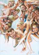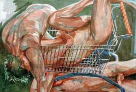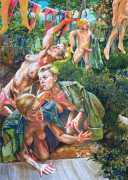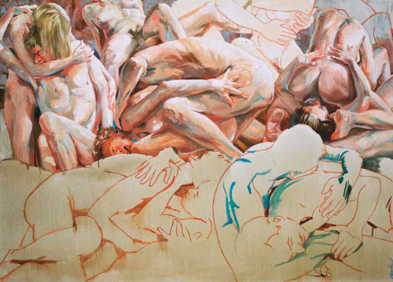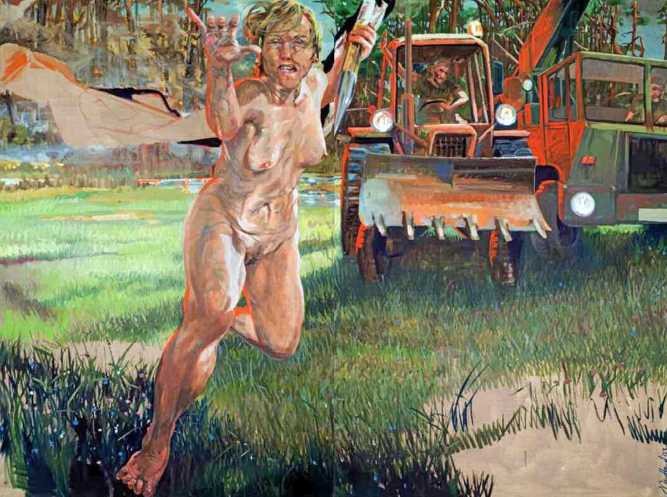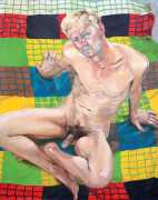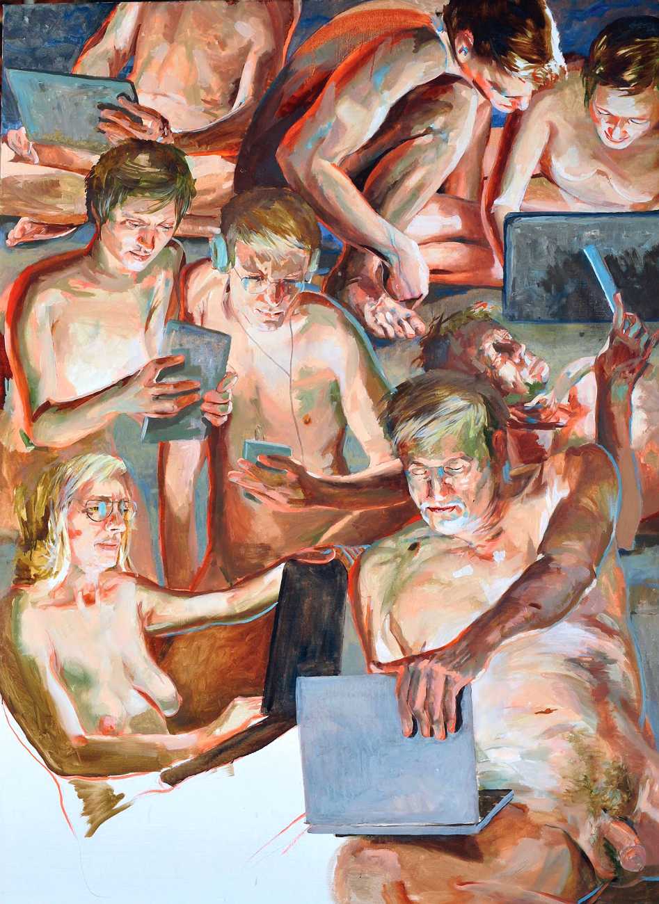 In his very distinctive paintings, Wendland provides an artistic commentary on many aspects of social, economic and political life in modern Germany. His large canvases reference well-known brand names and popular culture, as well as religion and politics, particularly the more militaristic aspects of post-Soviet Germany. Many include some degree of nudity, reminding the viewer that under the veneer of clothes and social conventions our naked bodies are always close to the surface.