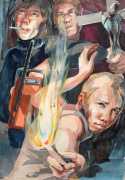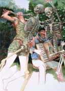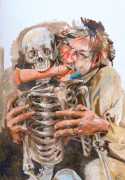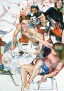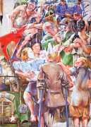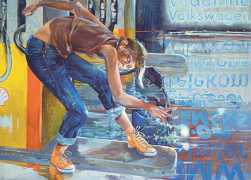 Schorlau’s introduction continues, ‘What is amazing is that it's easy to see more than just the moment that's captured in Sigurd Wendland's pictures. I have no problem seeing the seconds before and after this moment. Some images even make me feel like I'm watching a short film. I check the pictures one by one, I feel the same way about almost all of them. There is no doubt about it: Sigurd Wendland creates not just a picture, but a scenario. The paintings are very often ensemble affairs. Rarely is a character alone, and the people depicted are nearly always moving. On closer inspection you even think you can recognise the motives of their actions. They have a life of their own, and I haven't been able to find any examples where they are just illustrations. It is precisely this fragmentary character of his images that challenges the viewer's attention; the juxtaposition of detail, precision and apparent fleetingness increases the tension, just as if a detective were tracing a murderer's every movement but not seeing his face.’