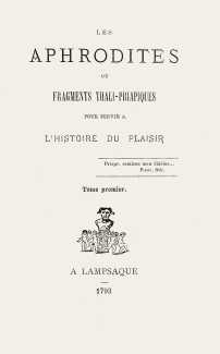 Les Aphrodites was published ‘A Lampsaque’ (The ancient Greek city of Lampsacus, now Lapseki in northern Turkey), but actually Brussels in Belgium, to avoid French censorship.