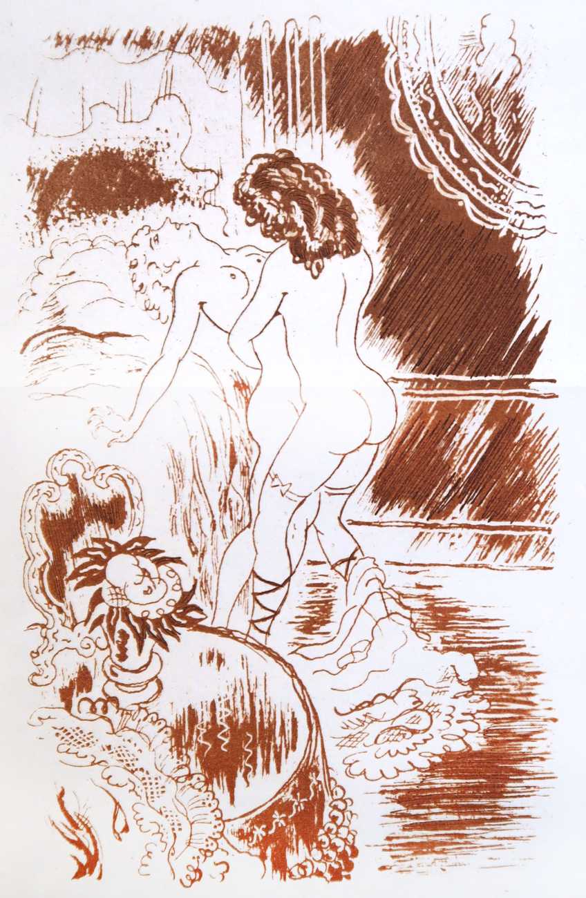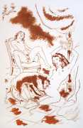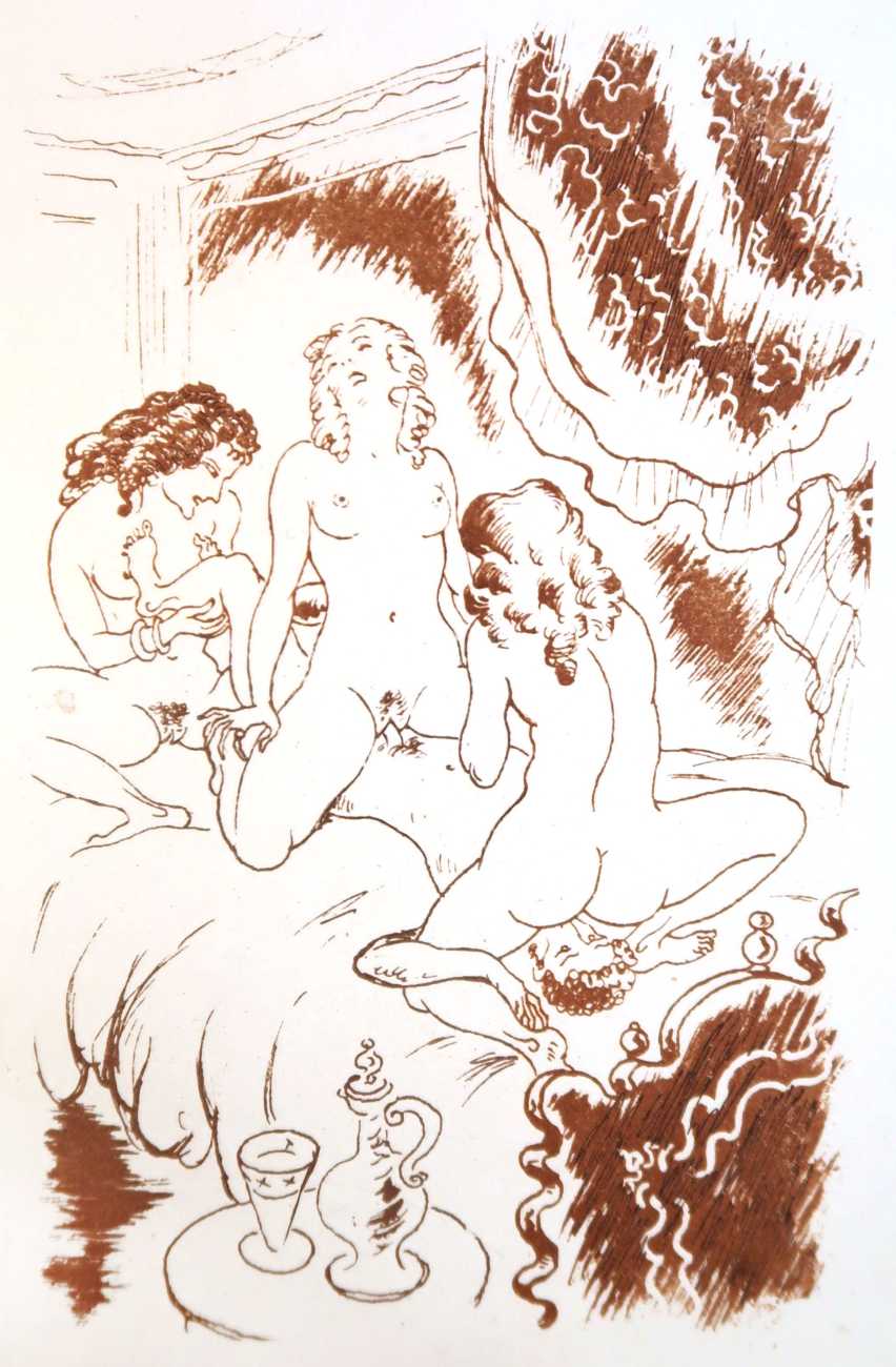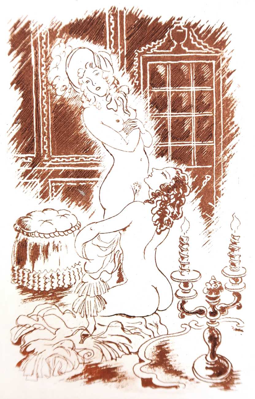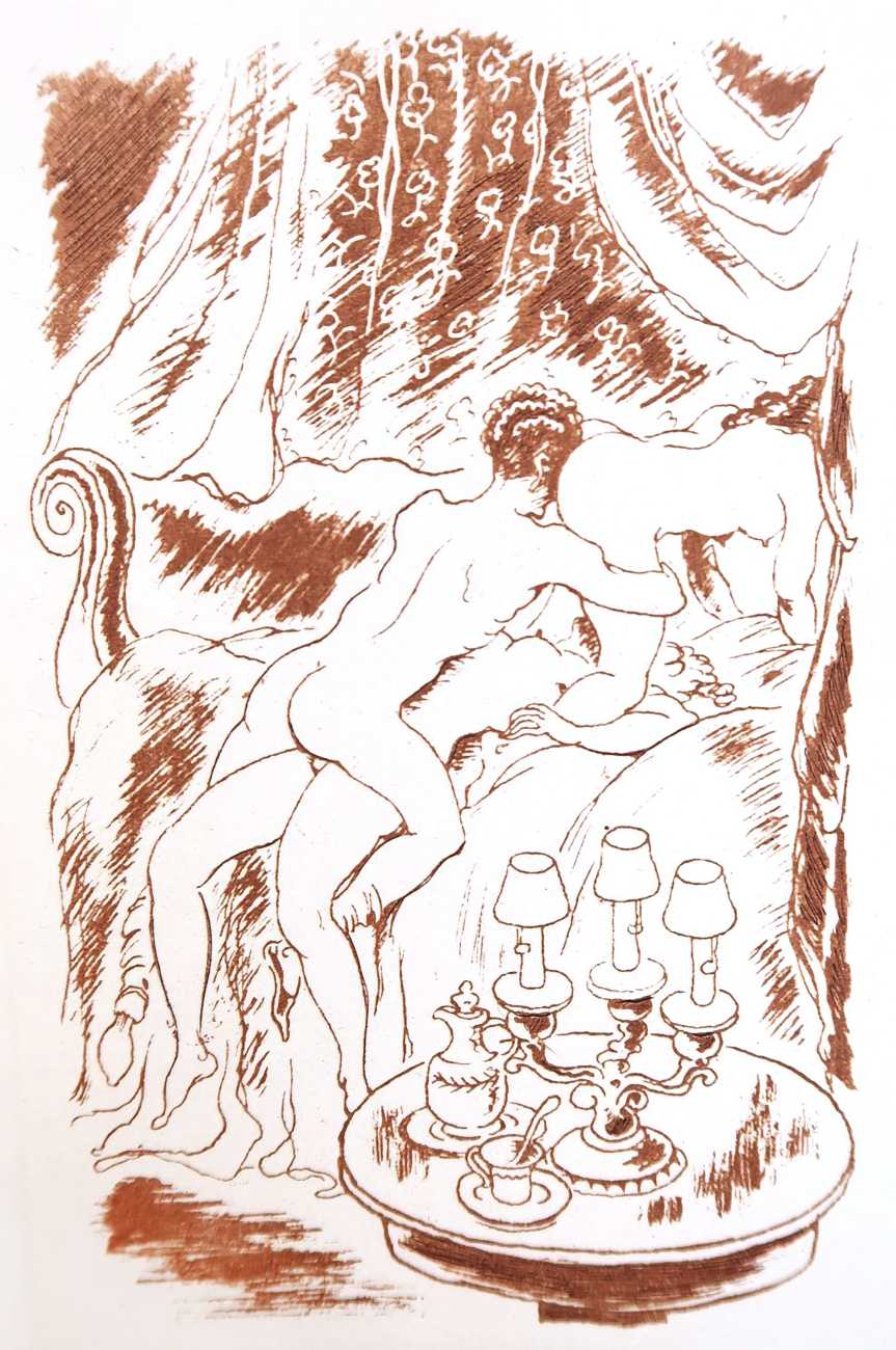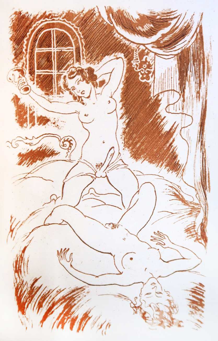 Gamiani is one of the most perennially popular and most-often illustrated of all erotic texts, and here we have one of several anonymous artists trying their hand at a set of sanguine (blood-red) drawings to accompany this fantastic and salacious text. Gamiani was first published in 1833, and is generally believed to have been written by Alfred de Musset. Subtitled ‘Two Nights of Excess’, and based on de Musset’s experiences with George Sand and her lesbian lover, Gamiani opens with Alcide watching Countess Gamiani and her young lover Fanny enjoying one another’s bodies. Very much aroused, Alcide reveals himself and joins them, and they spend the rest of their time together sharing their intimate stories and re-enacting scenes from them. The varied scenarios in the narrative include sexual encounters with a monkey, a donkey, and a hanged man. The unsigned plates from the first illustrated edition of Gamiani have been variously attributed to Achille Devéria and Octave Tassaert.
