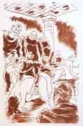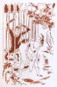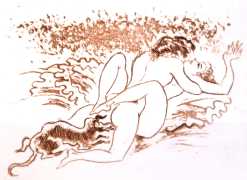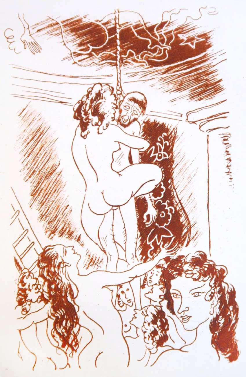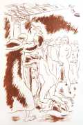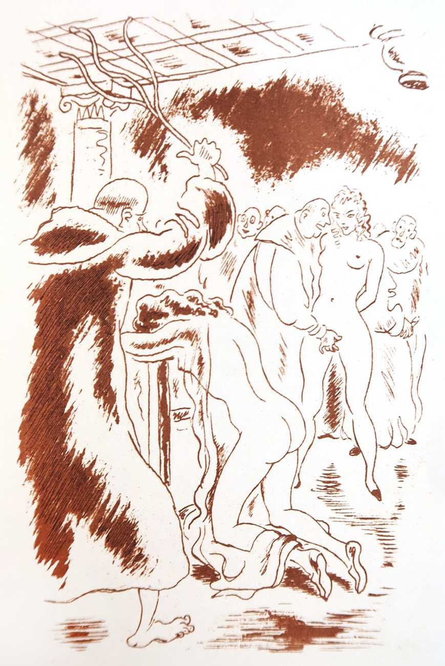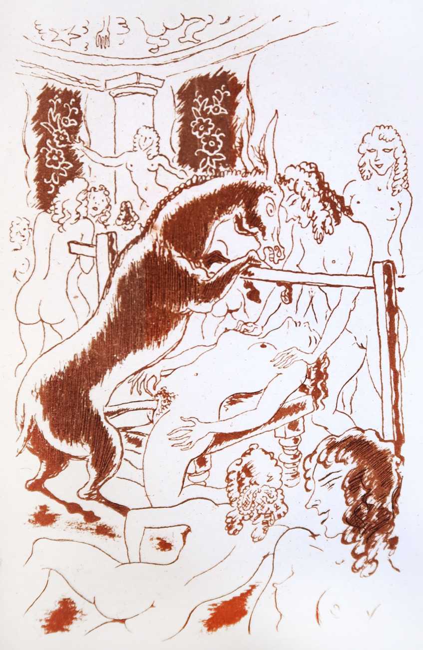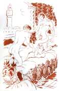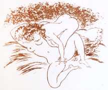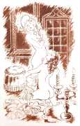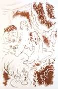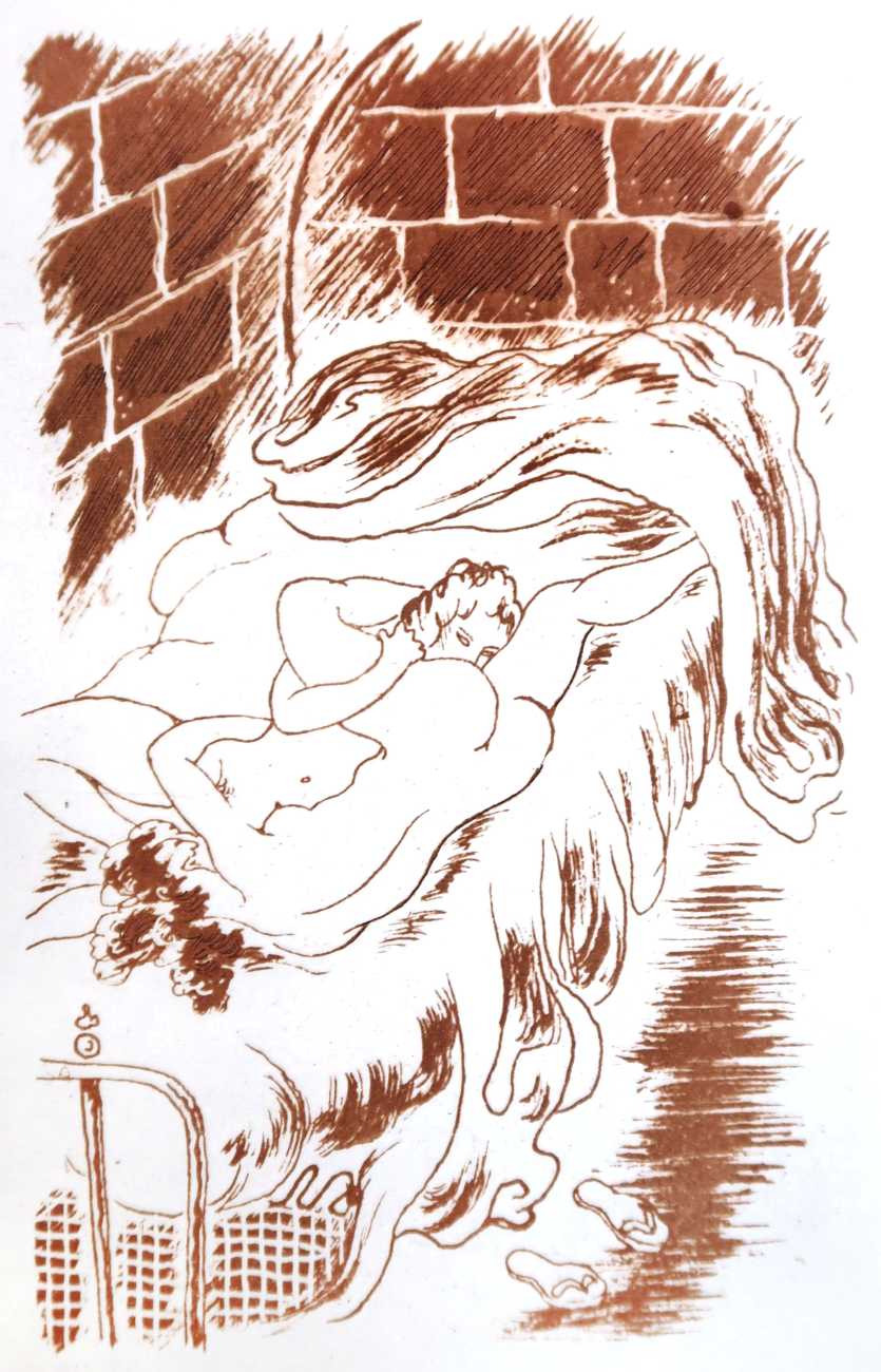 Gamiani is one of the most perennially popular and most-often illustrated of all erotic texts, and here we have one of several anonymous artists trying their hand at a set of sanguine (blood-red) drawings to accompany this fantastic and salacious text. Gamiani was first published in 1833, and is generally believed to have been written by Alfred de Musset. Subtitled ‘Two Nights of Excess’, and based on de Musset’s experiences with George Sand and her lesbian lover, Gamiani opens with Alcide watching Countess Gamiani and her young lover Fanny enjoying one another’s bodies. Very much aroused, Alcide reveals himself and joins them, and they spend the rest of their time together sharing their intimate stories and re-enacting scenes from them. The varied scenarios in the narrative include sexual encounters with a monkey, a donkey, and a hanged man. The unsigned plates from the first illustrated edition of Gamiani have been variously attributed to Achille Devéria and Octave Tassaert.