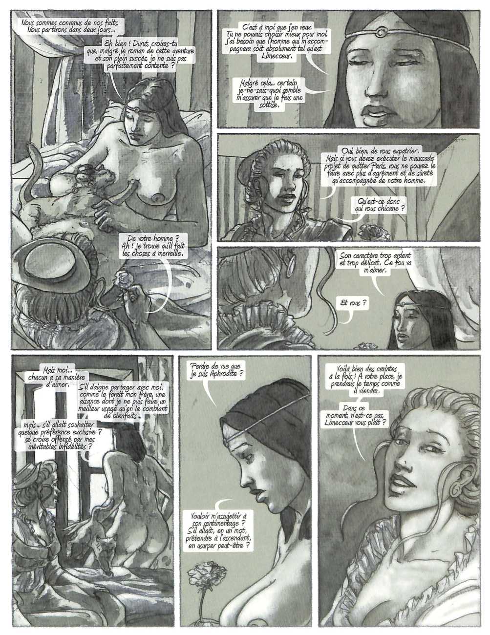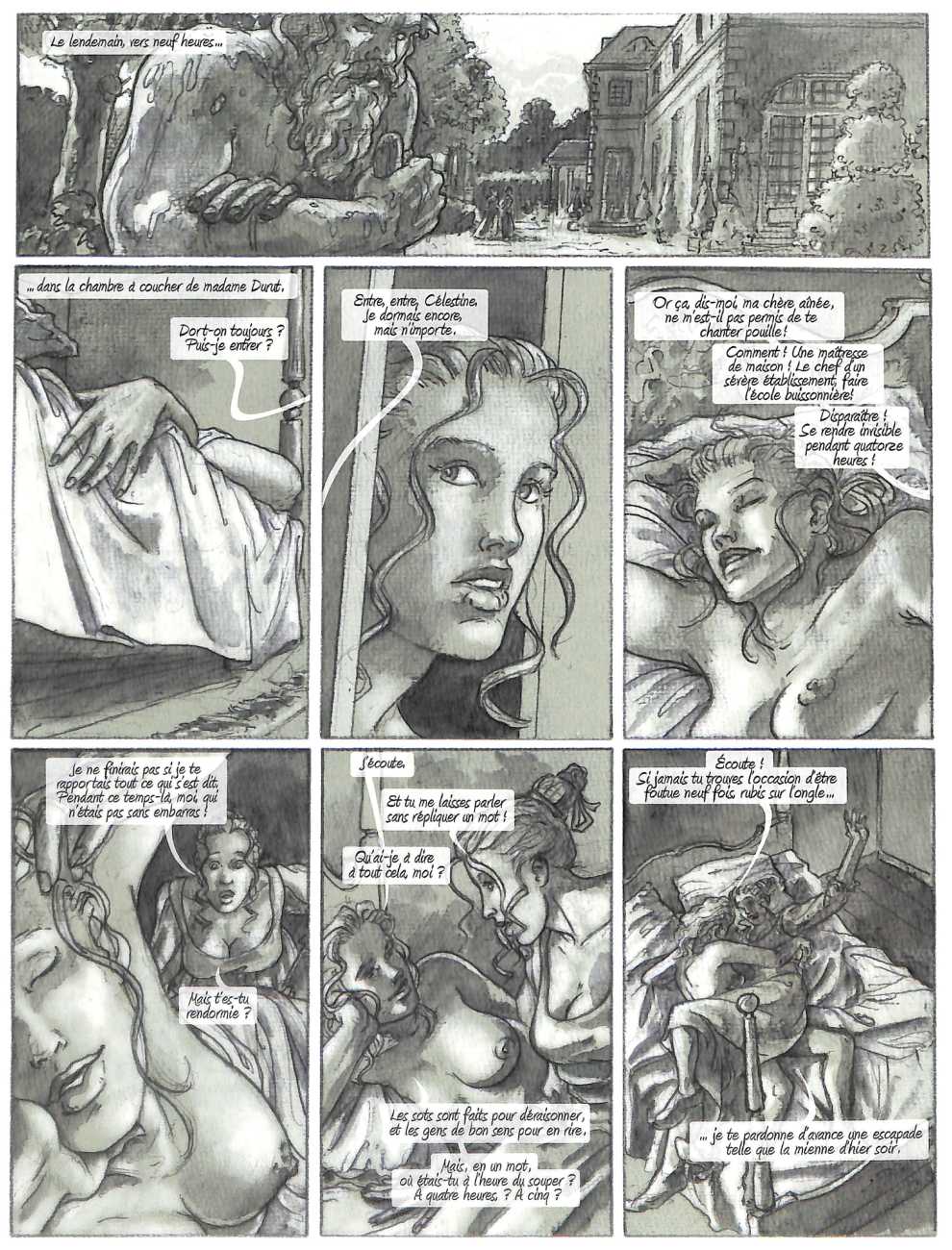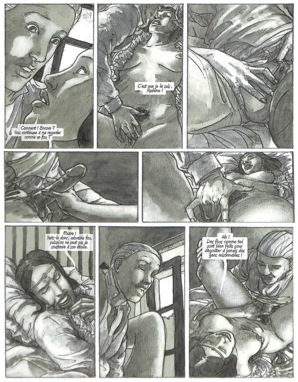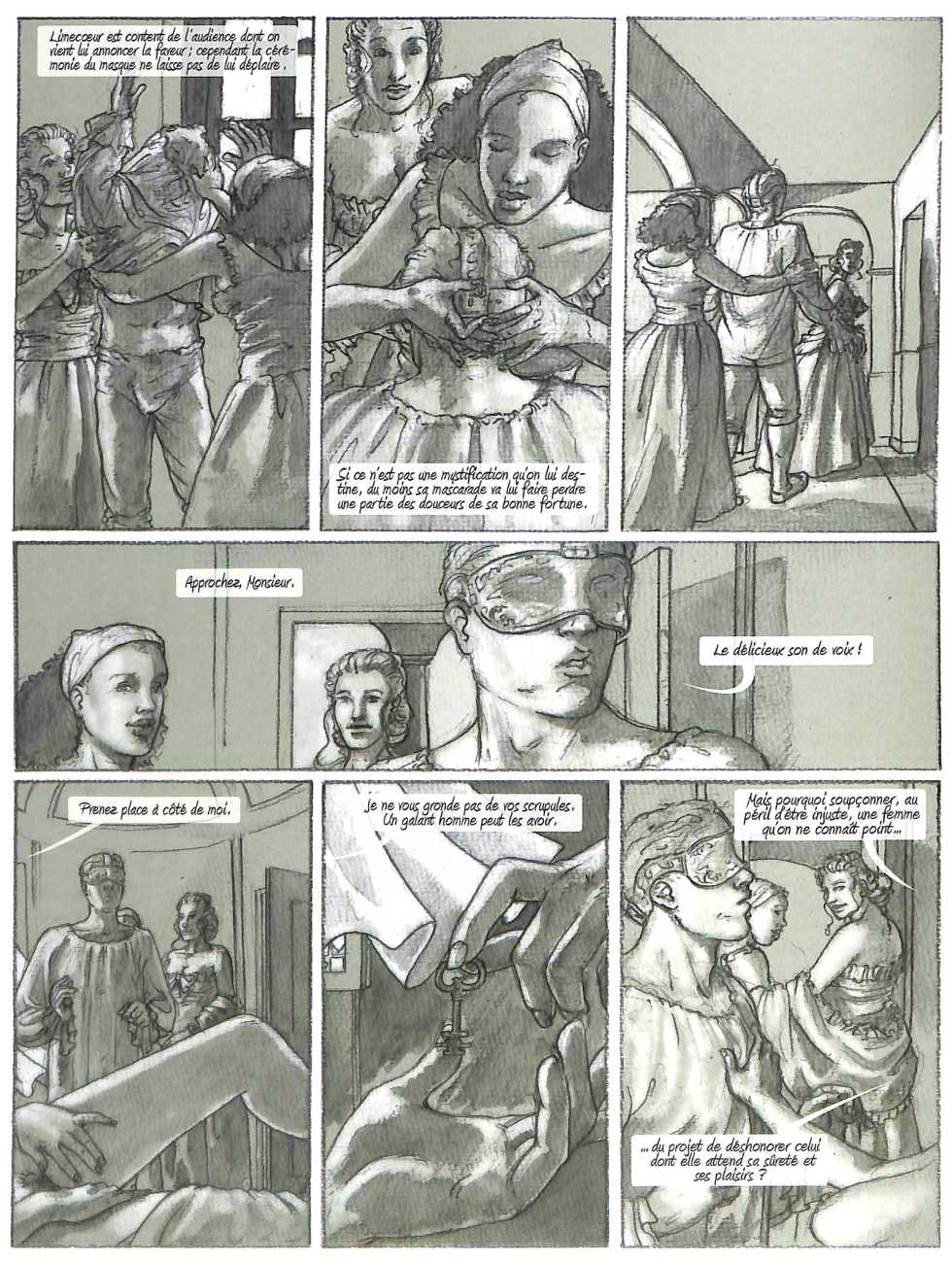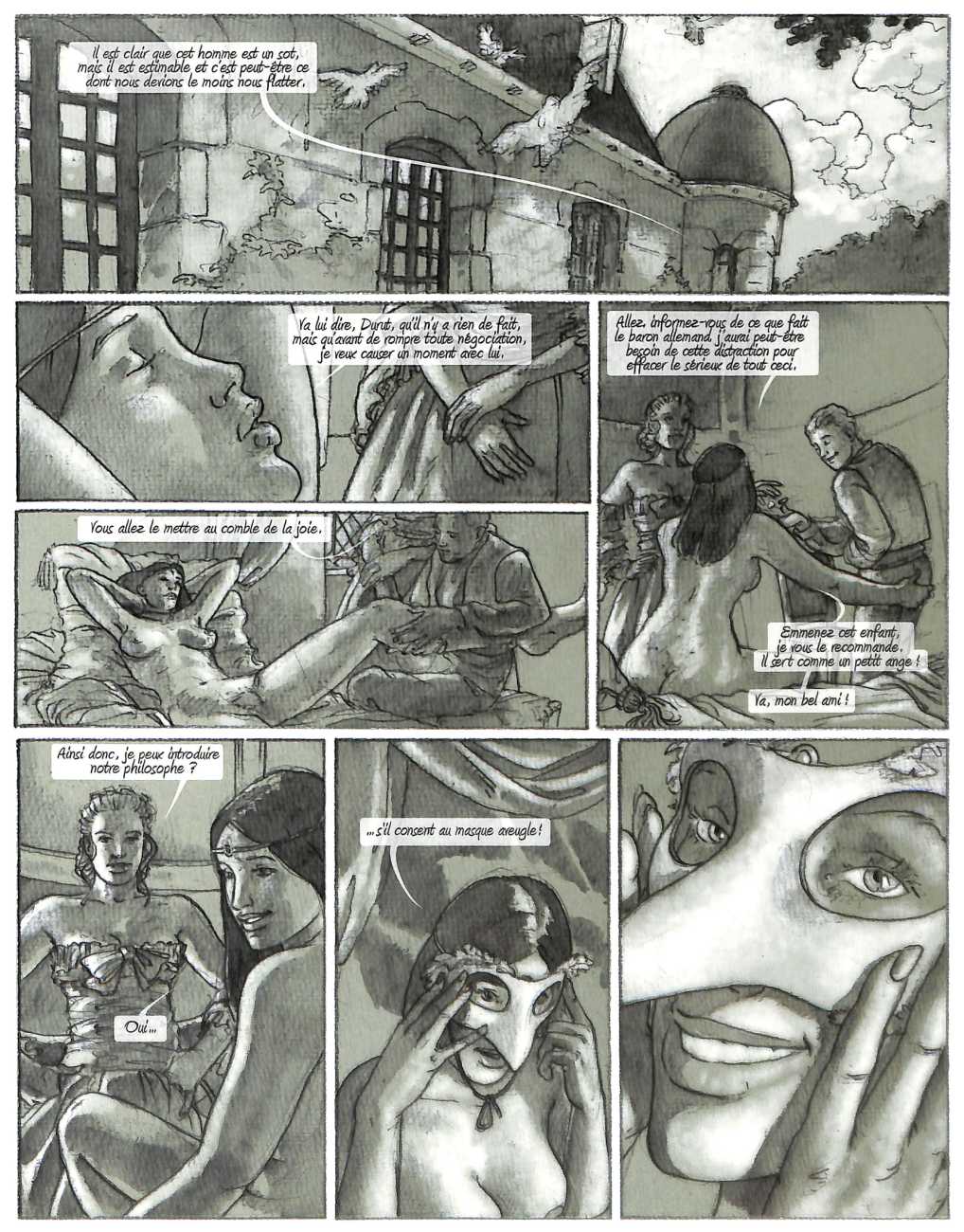 The second volume of Les Aphrodites, Le masque aveugle (The Blind Mask) sees the lovely Célestine continuing to explore the mysteries of Madame Durut’s chateau, finding a prisoner locked in a cage having his manhood measured regularly and a sex-starved nun, and taking part in an erotic masked ball.