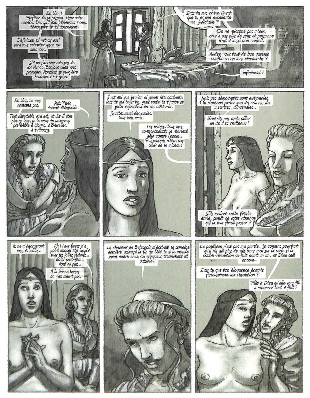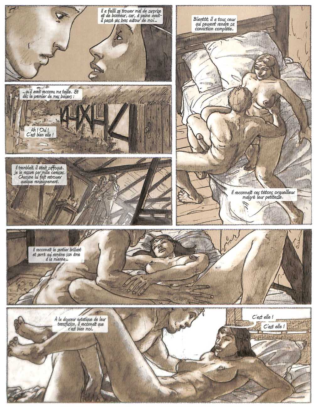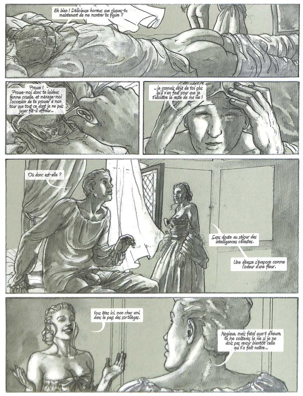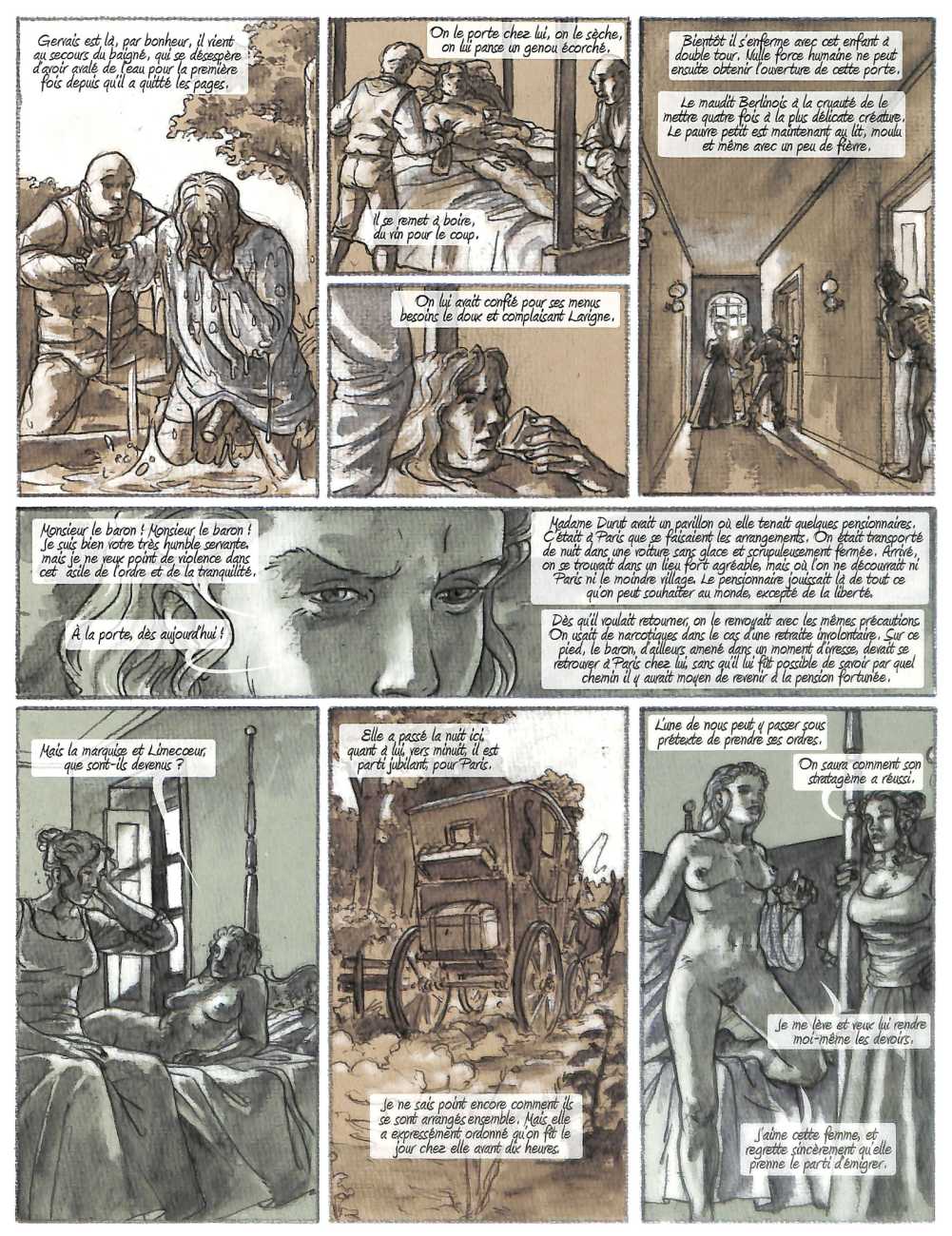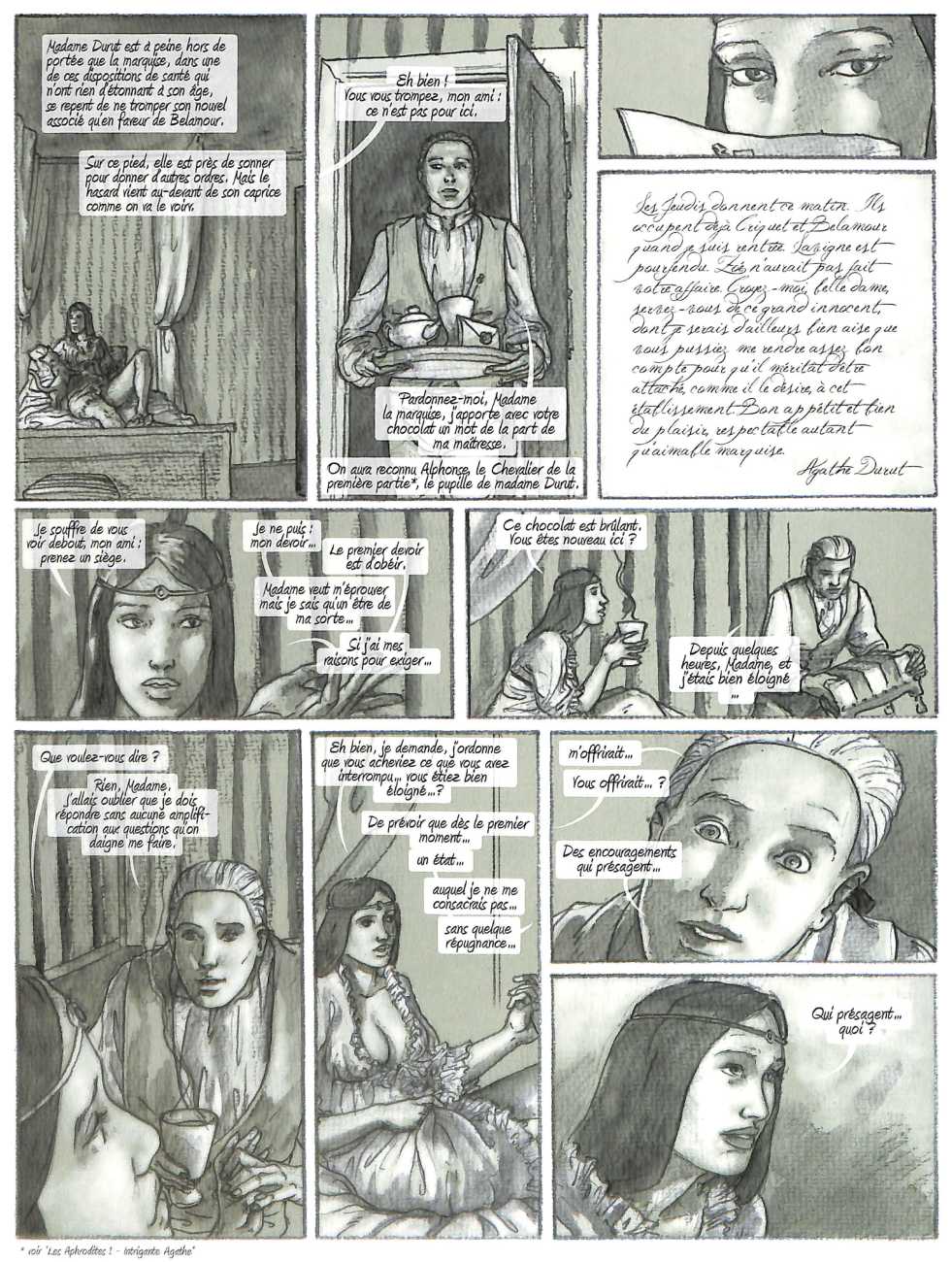 The second volume of Les Aphrodites, Le masque aveugle (The Blind Mask) sees the lovely Célestine continuing to explore the mysteries of Madame Durut’s chateau, finding a prisoner locked in a cage having his manhood measured regularly and a sex-starved nun, and taking part in an erotic masked ball.