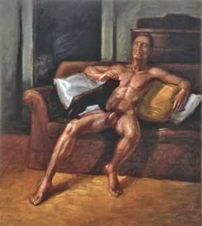 We show his paintings here in chronological order, from happy domestic gay encounters to the growing threat of AIDS. In the last paintings from 1994 we experience the artist’s alter ego, in white chemise and high heels, gently leave the proceedings.