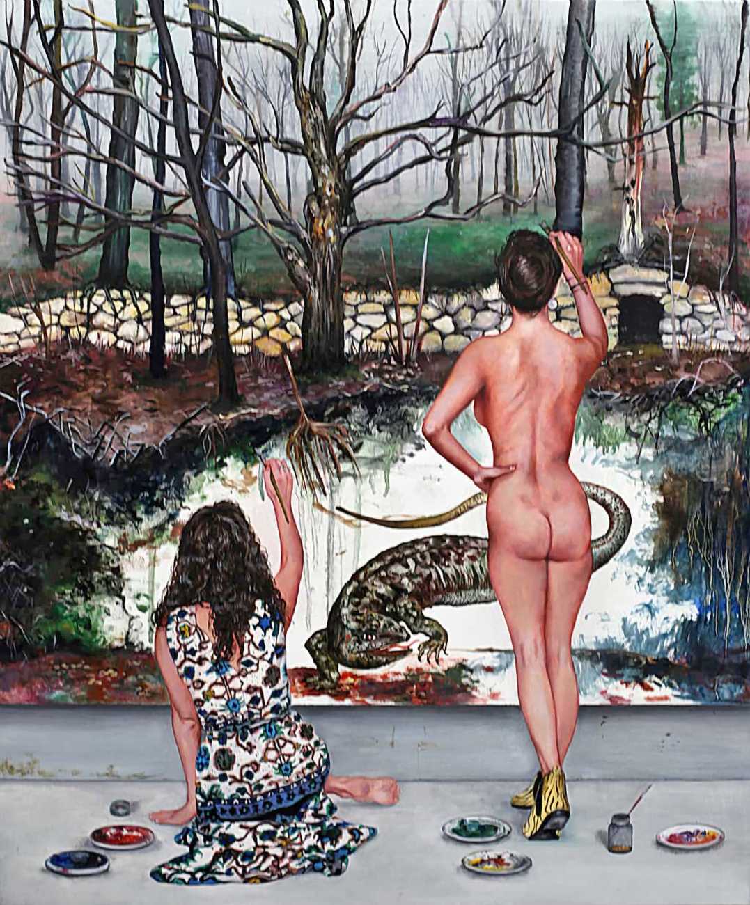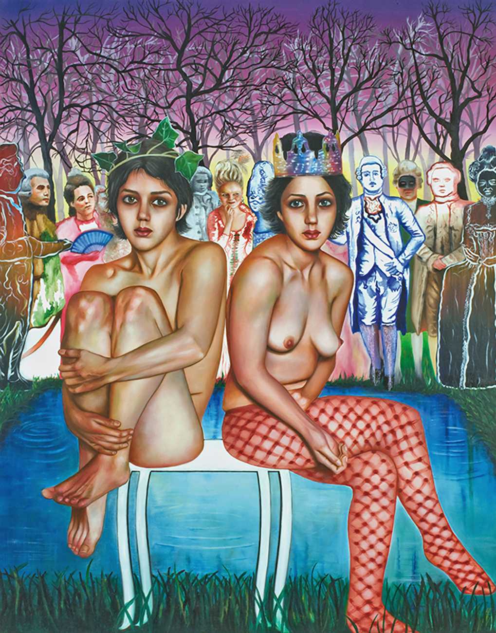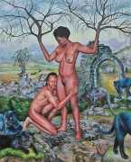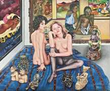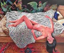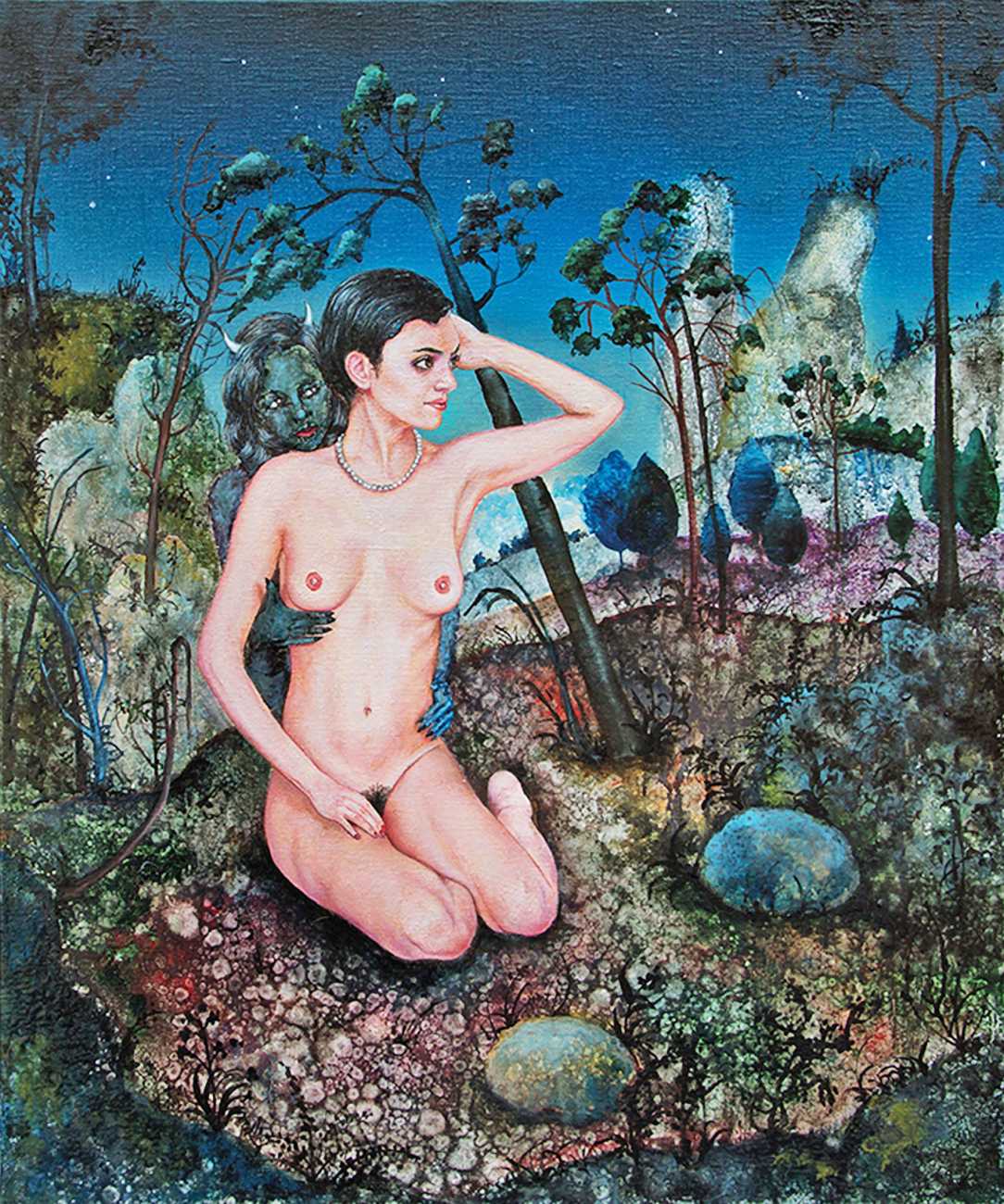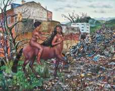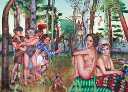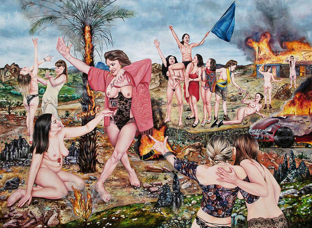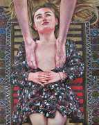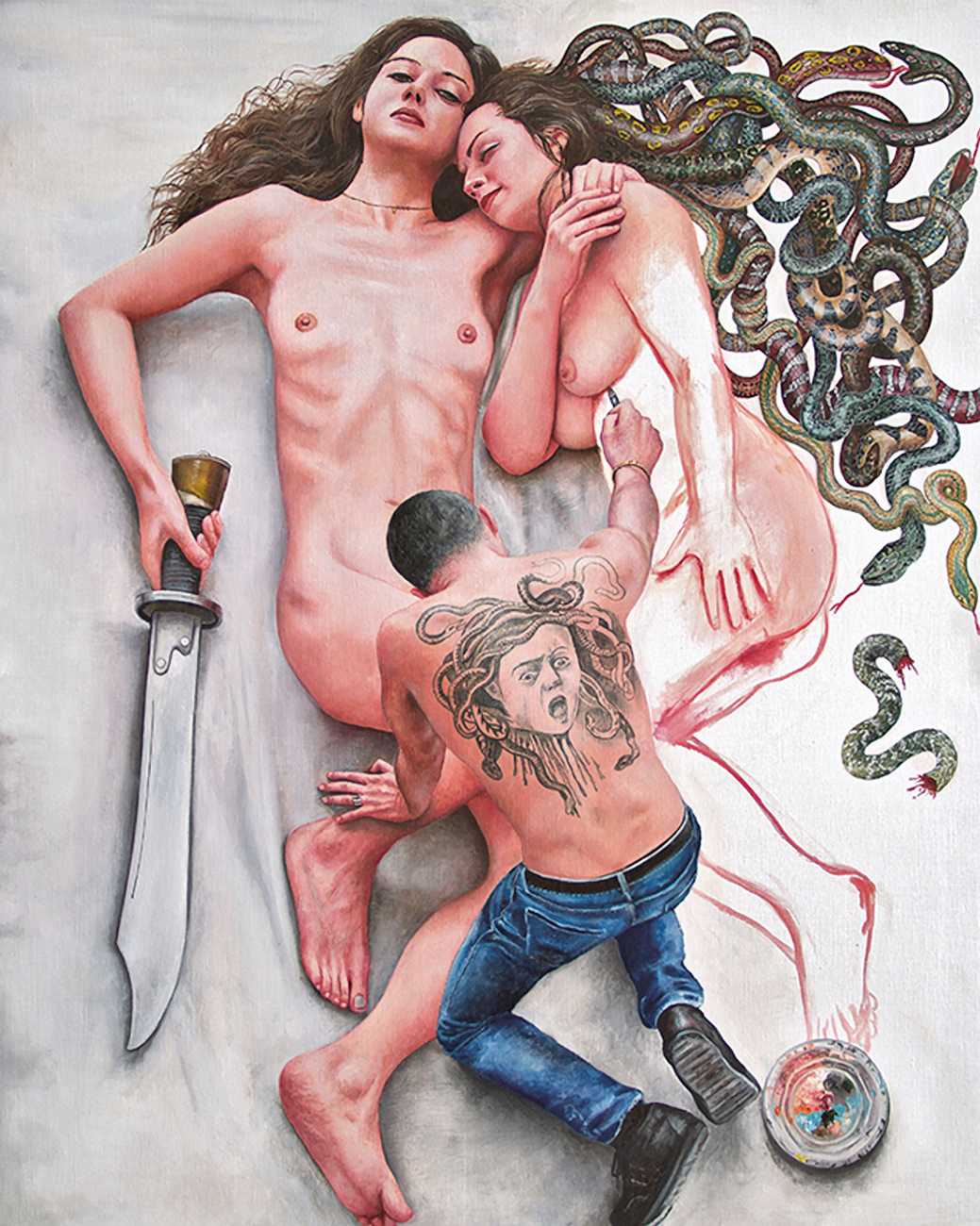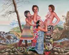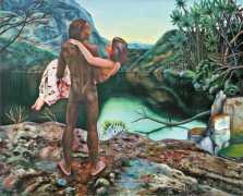 I think the origins of a visual language for a painter is rarely very conscious. As for me, it comes from how I see the world and what I want to express, but also from my utopias. In my paintings I deal with existential subjects such as desire, war, fear, love, death. I borrow from many different forms of expression, old paintings, cinema, the primitive arts. I always need a strong human presence in my paintings, so I also often ask my friends to pose for me and I take pictures of them to use as references.