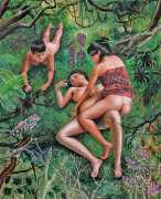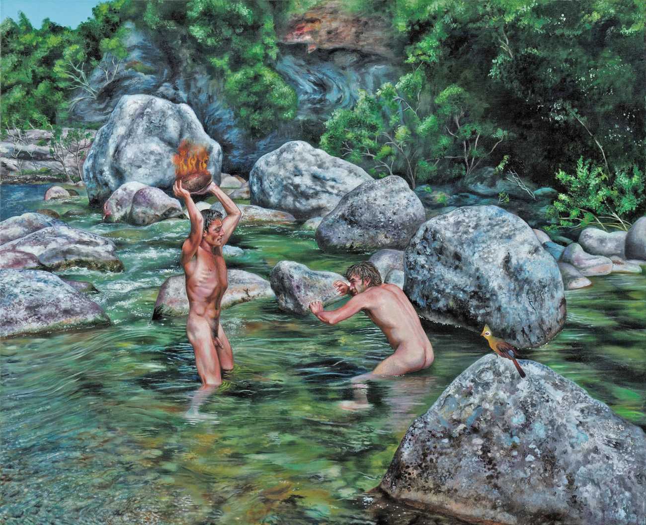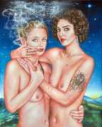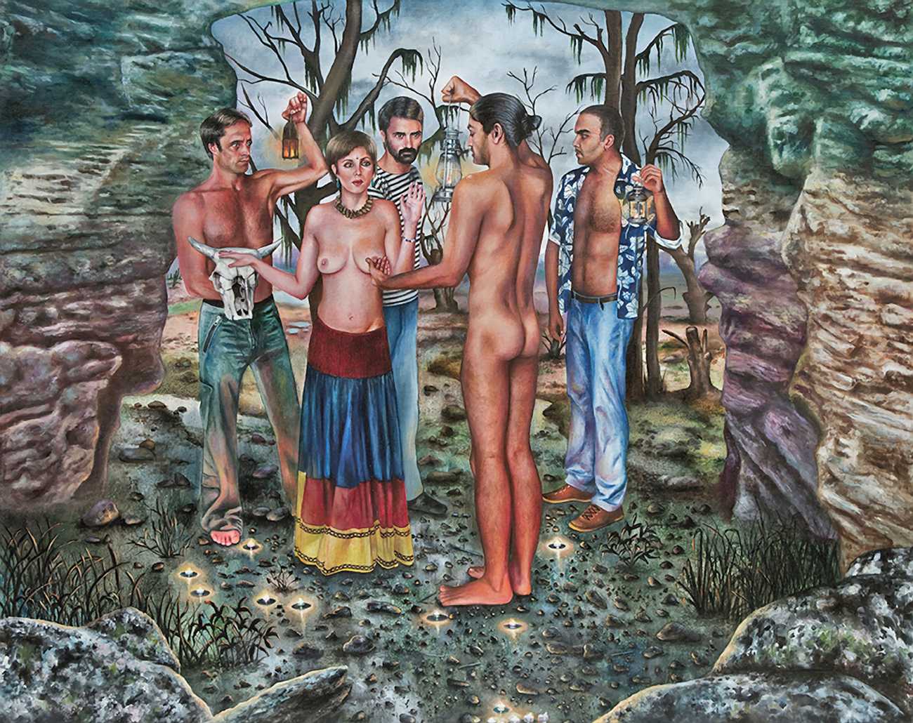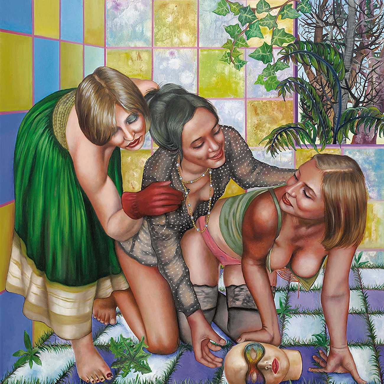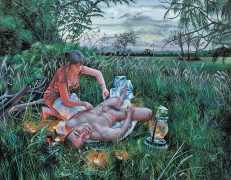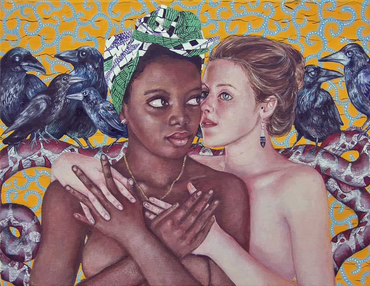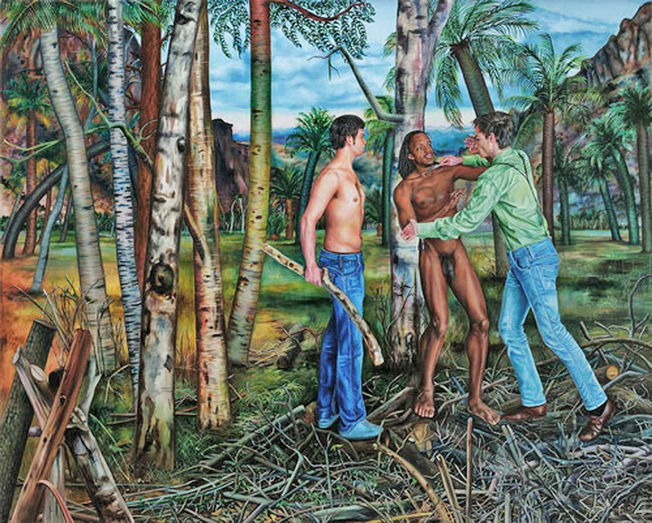 I think the origins of a visual language for a painter is rarely very conscious. As for me, it comes from how I see the world and what I want to express, but also from my utopias. In my paintings I deal with existential subjects such as desire, war, fear, love, death. I borrow from many different forms of expression, old paintings, cinema, the primitive arts. I always need a strong human presence in my paintings, so I also often ask my friends to pose for me and I take pictures of them to use as references.