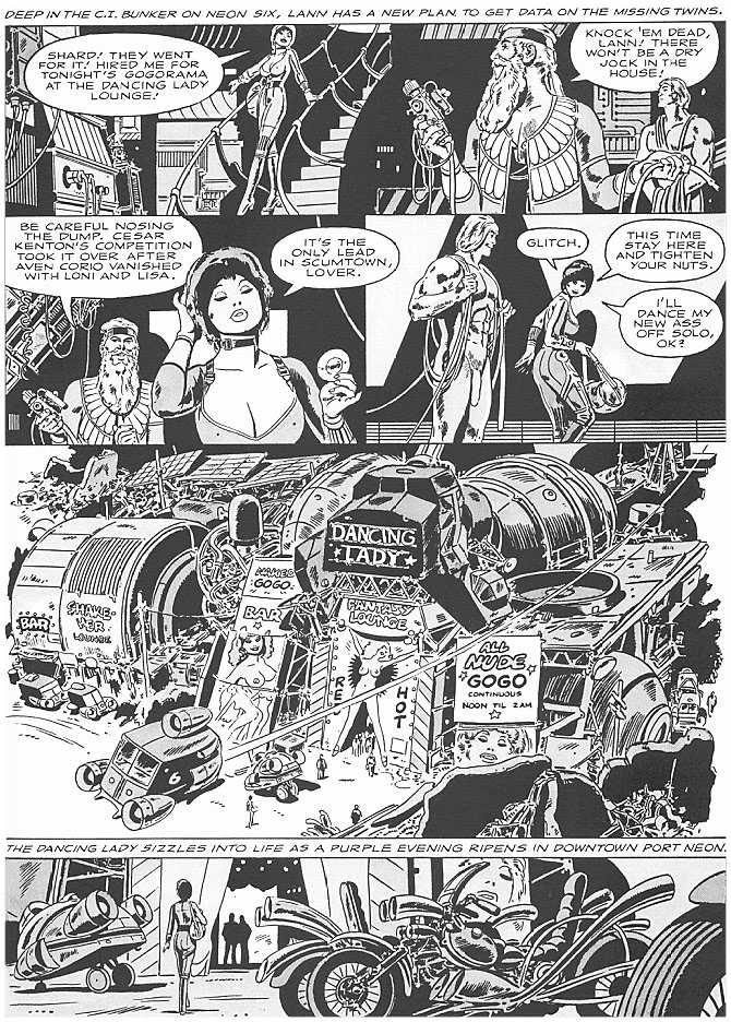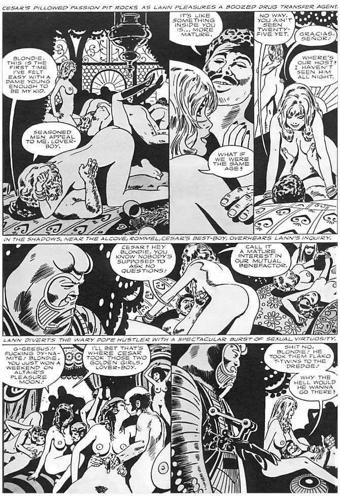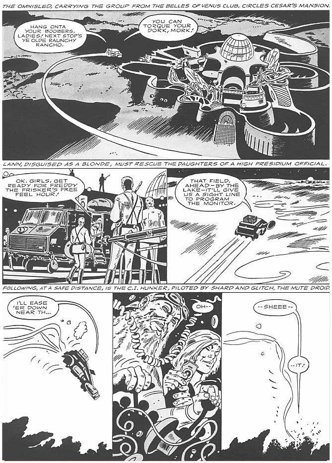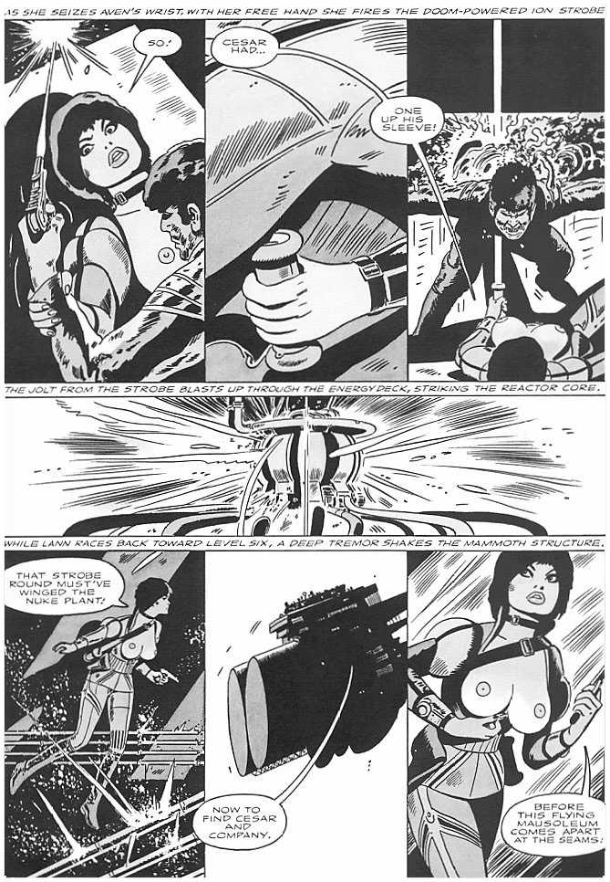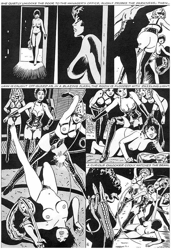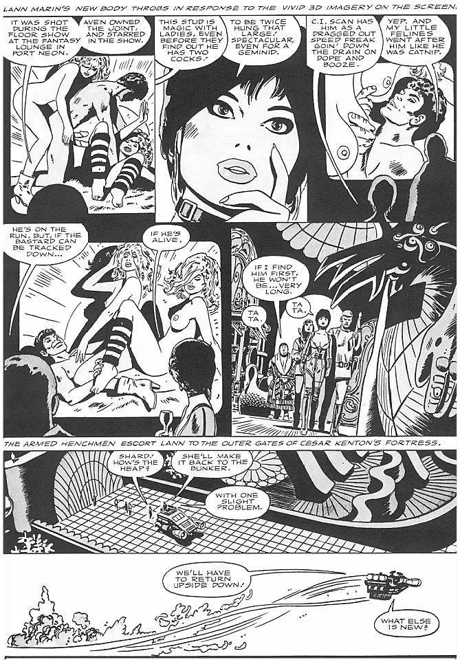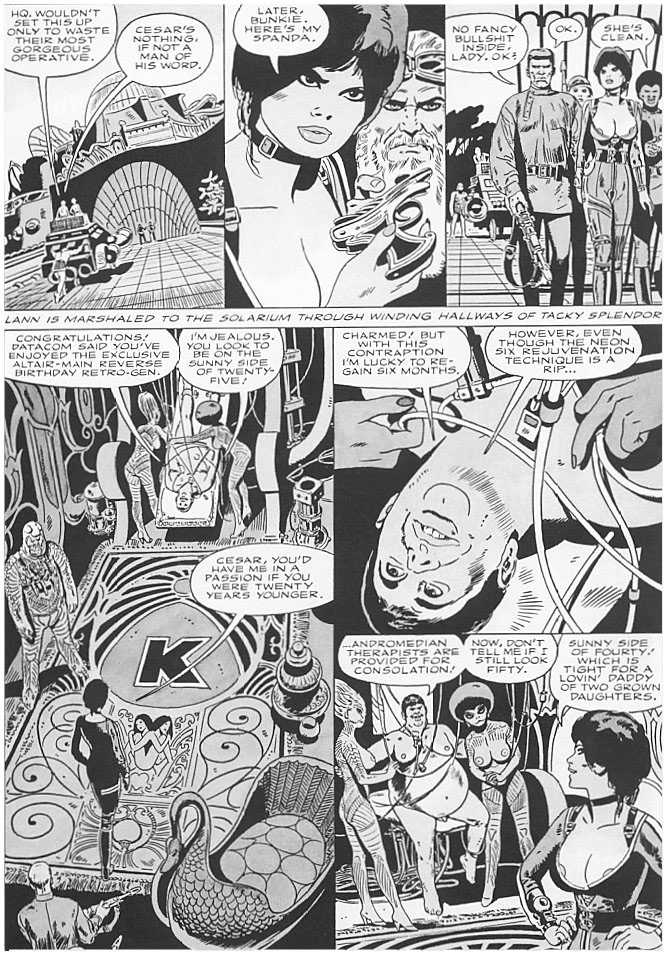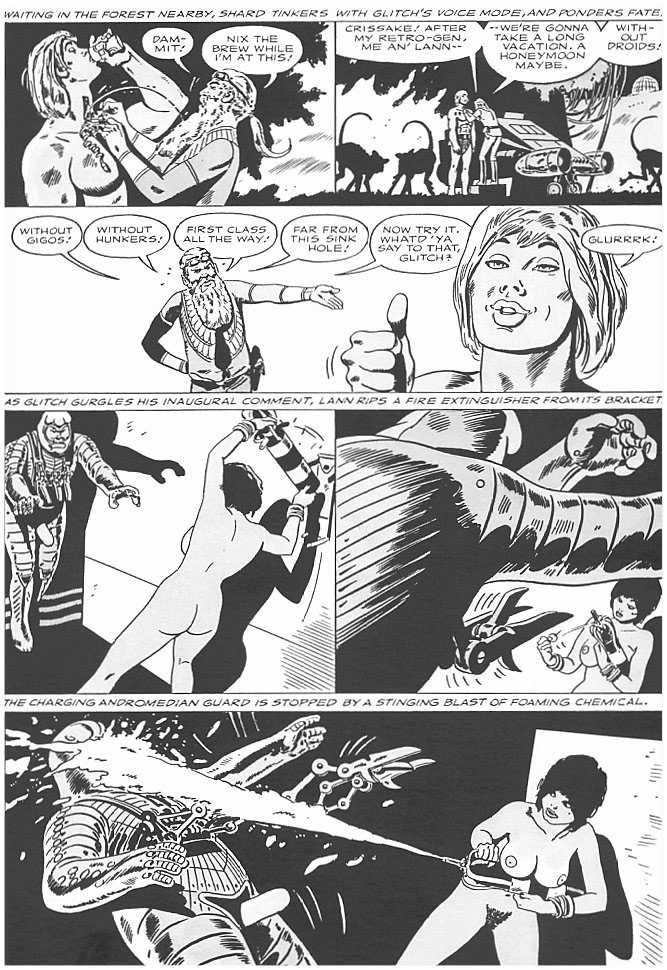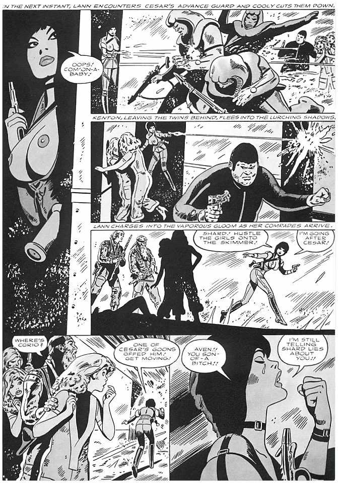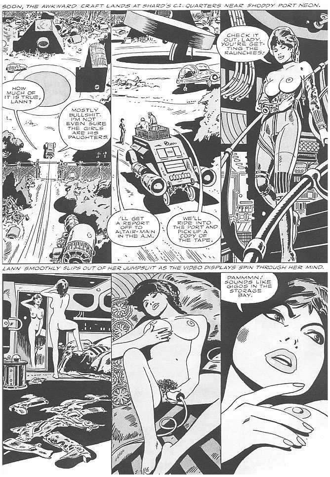 Lann is a buxom mercenary with the body of a 25-year-old. She has a middle-aged lover called Shard, and the two of them travel through the universe with hunky but brainless android Glitch, who Lann uses when Shard isn’t enough. They are on a mission to rescue two go-go dancers from the planet Neon-Six who have been kidnapped, and the action follows them through galactic brothels, naked women with rayguns, robots and lizards.