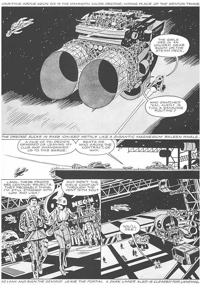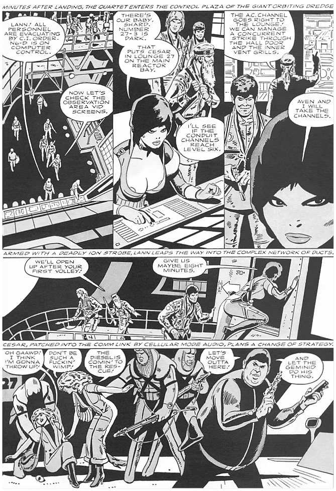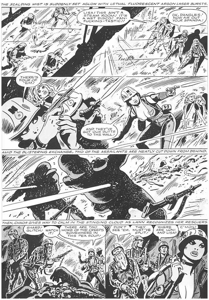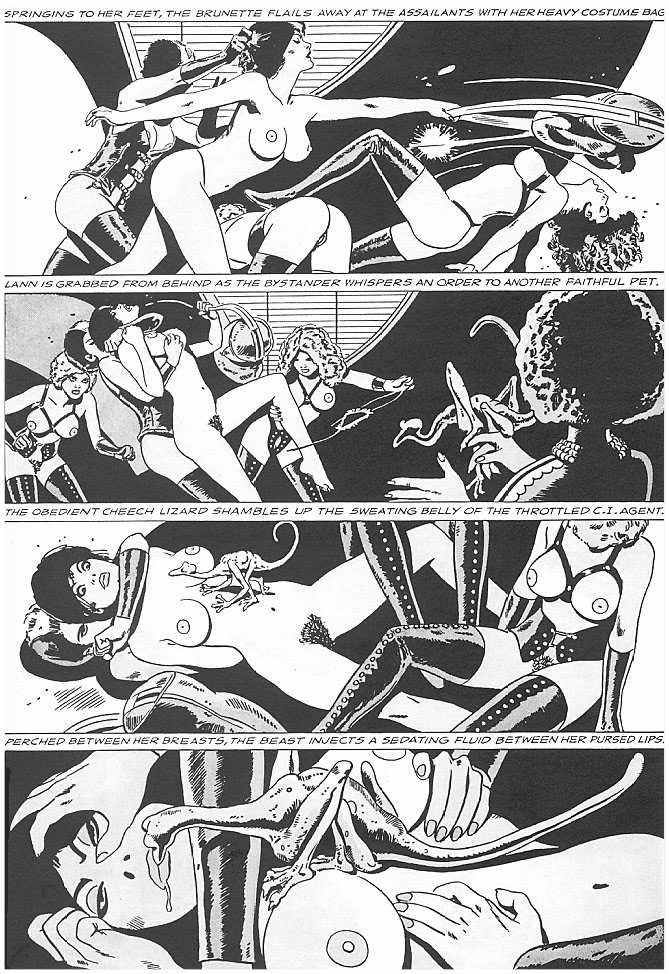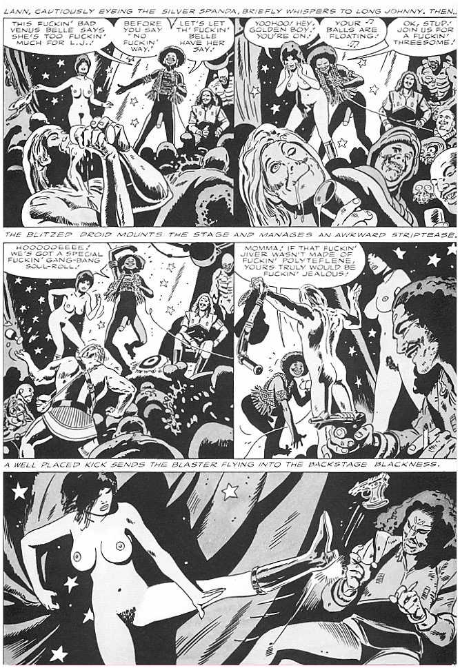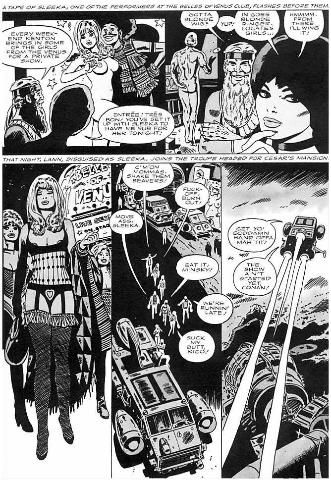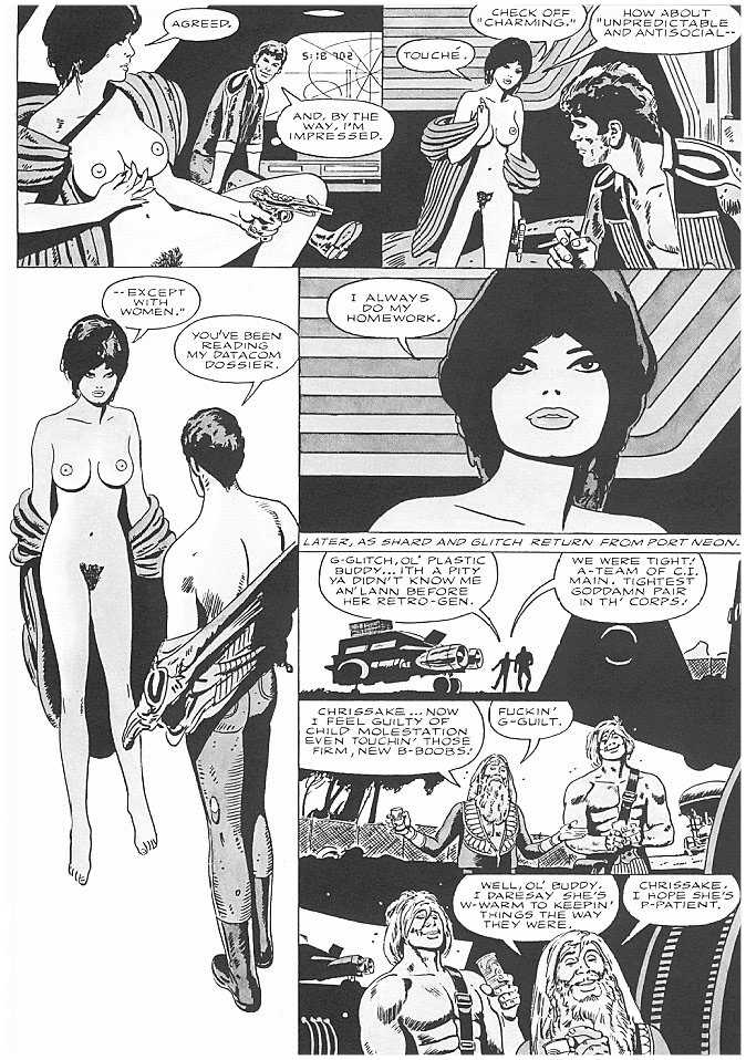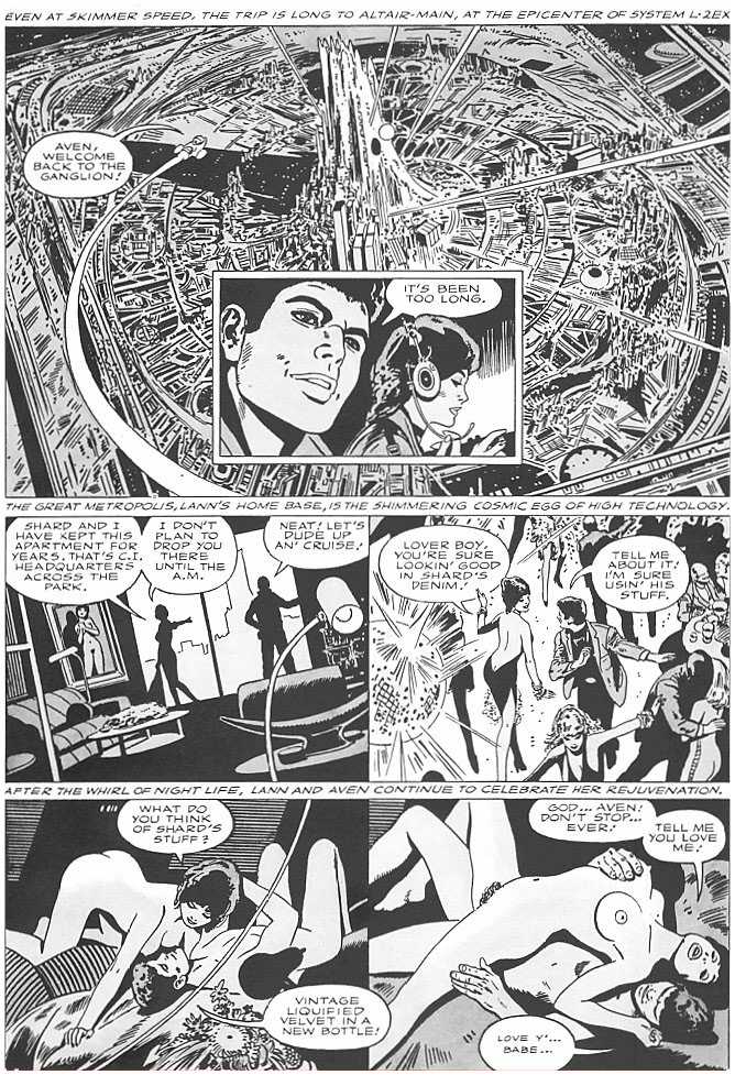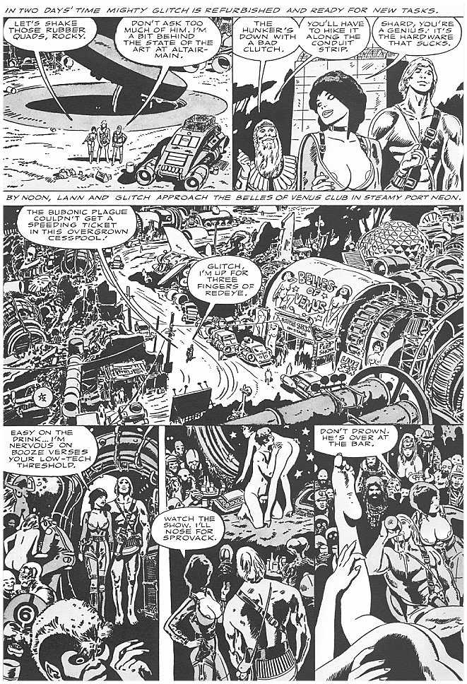 Lann is a buxom mercenary with the body of a 25-year-old. She has a middle-aged lover called Shard, and the two of them travel through the universe with hunky but brainless android Glitch, who Lann uses when Shard isn’t enough. They are on a mission to rescue two go-go dancers from the planet Neon-Six who have been kidnapped, and the action follows them through galactic brothels, naked women with rayguns, robots and lizards.