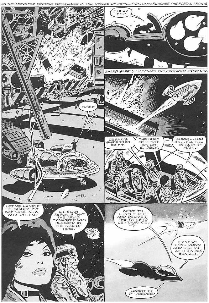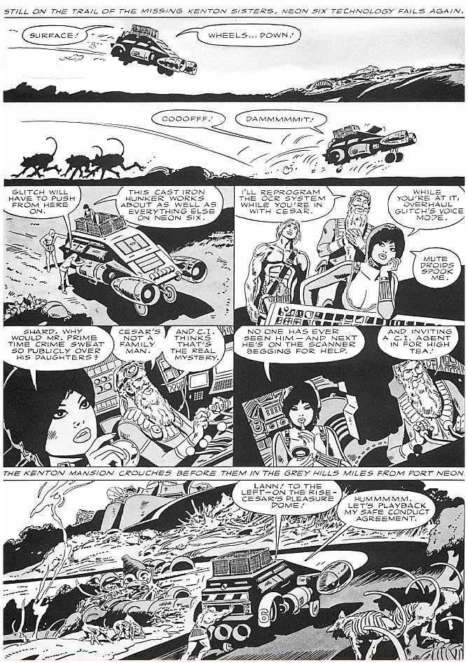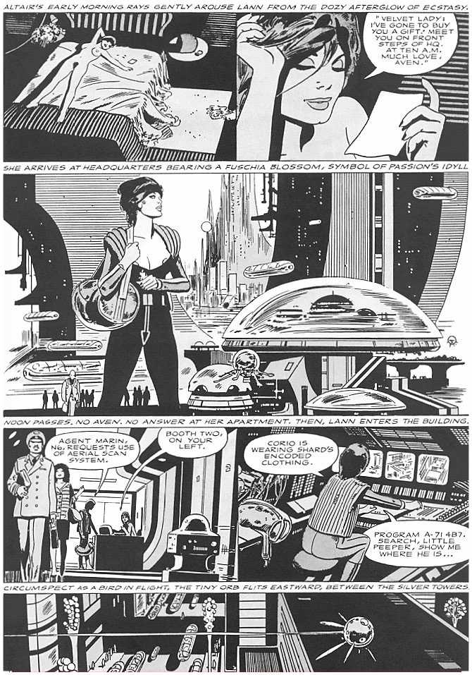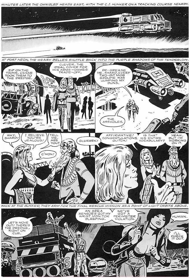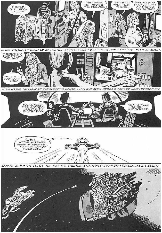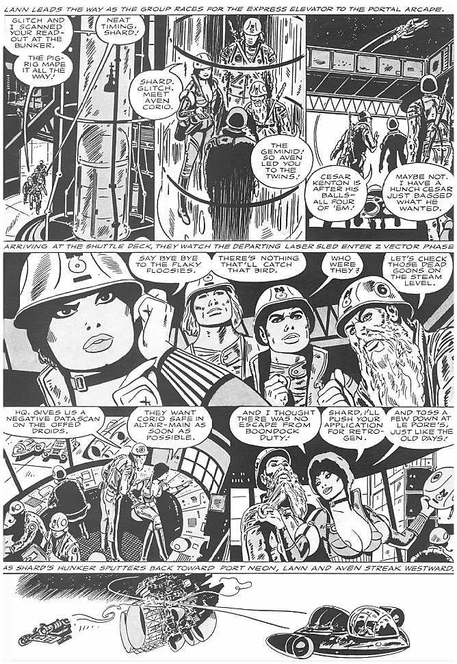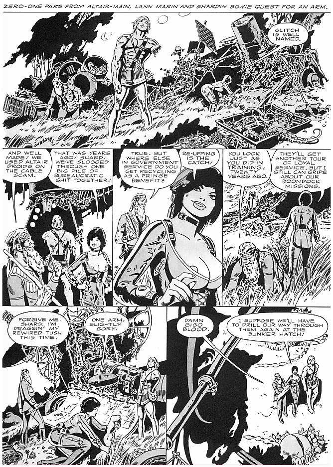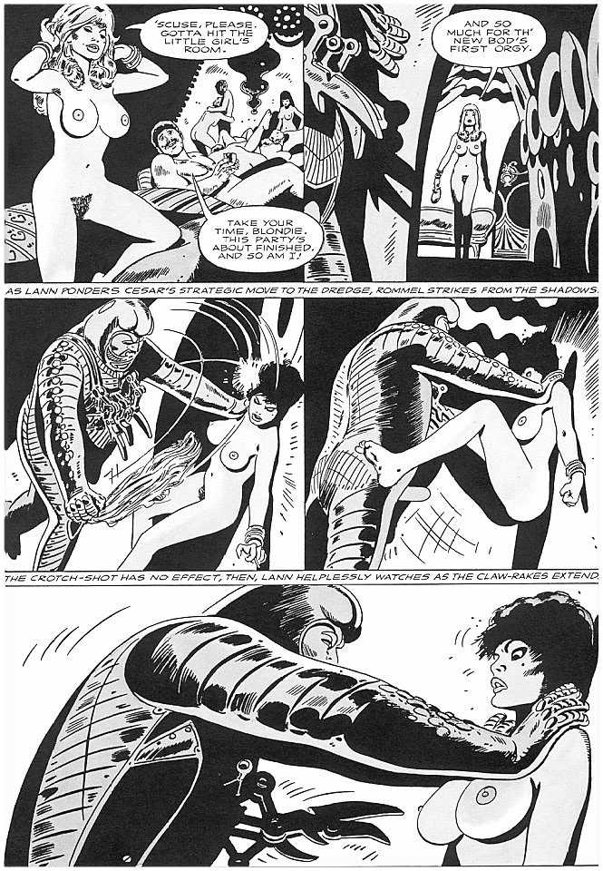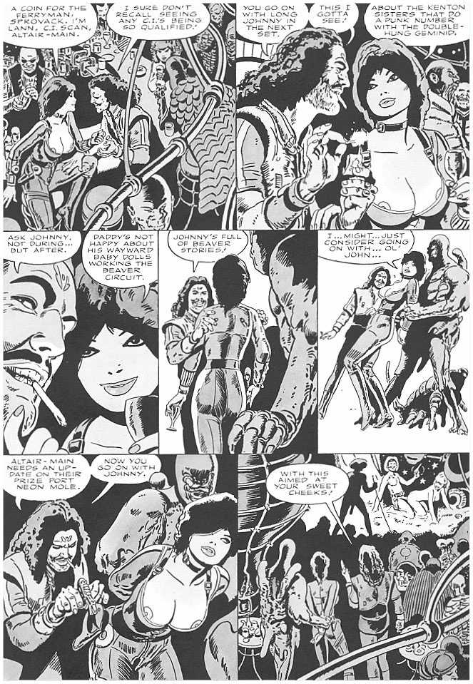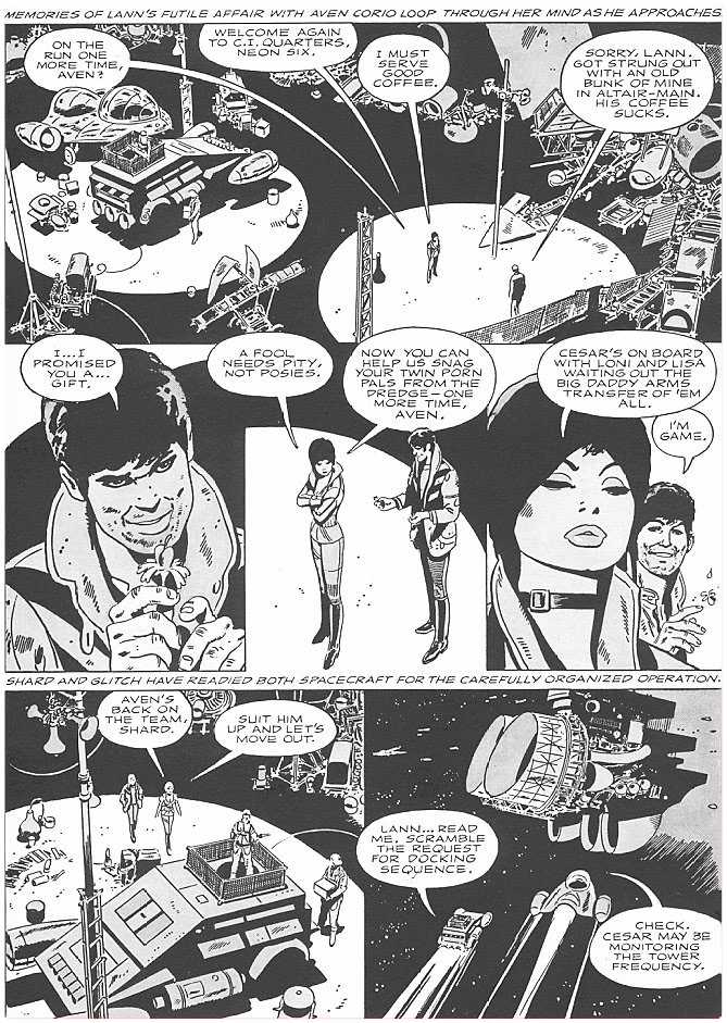 Lann is a buxom mercenary with the body of a 25-year-old. She has a middle-aged lover called Shard, and the two of them travel through the universe with hunky but brainless android Glitch, who Lann uses when Shard isn’t enough. They are on a mission to rescue two go-go dancers from the planet Neon-Six who have been kidnapped, and the action follows them through galactic brothels, naked women with rayguns, robots and lizards.