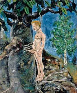Kullervo, two paintings of Kullervo, the ill-fated antihero of the Finnish epic Kalevala, hanging naked and from a tree and carving quotations from Mussolini (‘The act always precedes the law’) and Hitler (‘The world is a prize for the powerful’) into the trunk with his knife-like penis (1972 and 1983).