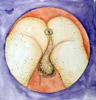 Miehekäs Kuukautiset (A Manly Menstruation), paintings of a man bleeding from his anus (1973).