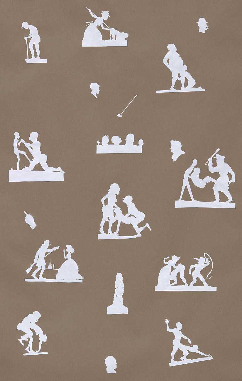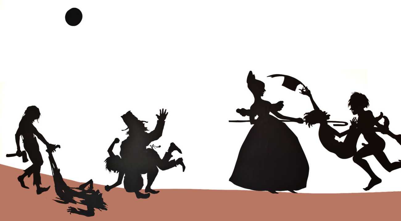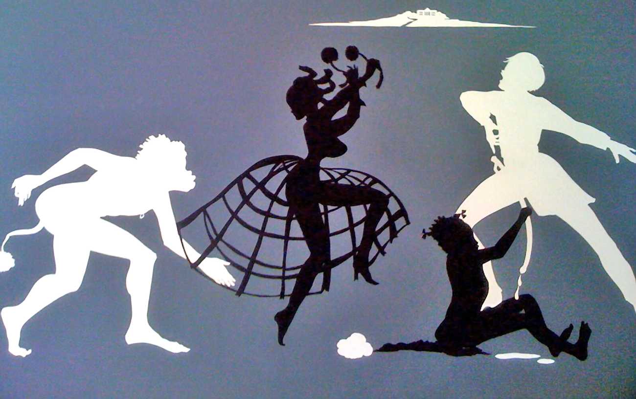 Kara Walker made her New York debut in a 1994 group exhibition at the Drawing Center with the 25-foot-long wall installation – Gone: An Historical Romance of a Civil War as It Occurred b’tween the Dusky Thighs of One Young Negress and Her Heart. Its caricatured Antebellum figures, engaged in violent and sexual interactions, were silhouettes cut from black paper and installed directly on the wall. The silhouette technique has its roots in the sentimental Victorian ‘ladies’ art’ of shadow portraits, but the scale of Walker’s work also alluded to the 360-degree historical cycloramas popular during the post-Civil War era for the depiction of battle scenes.