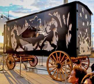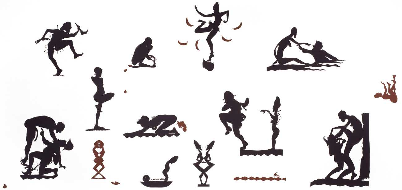 Walker has continued to use both the silhouette and cyclorama forms to explore the nature of race representation as well as the history of figuration and narrative in contemporary art. In Endless Conundrum, an African American Anonymous Adventuress, she interrogates the representation of the black body by modernist artists from Matisse to Brancusi. The silhouette theme is continued in one of her more recent large-scale projects, the Katastwóf Karavan. A large wagon on wheels, created as part of the Prospect.4 triennial in New Orleans, it sat for a while on the banks of the Mississippi, depicting an ominous scene of dancing, marching figures draped in vegetation.