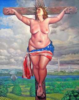 We start here with religious allusions – the first five paintings are titled Eden, Nature versus Nurture, Sebastian of the Suburbs, The Fabulosity of God, and This Rapture will be Facebooked. In subsequent works we see his trademark takes on well-known subjects such as Leda and the Swan, The Three Graces, Lady Godiva, and Humpty Dumpty. The selection concludes with We The People, and Liberty Takes Holidays, Brookes’ versions of perennial American themes.