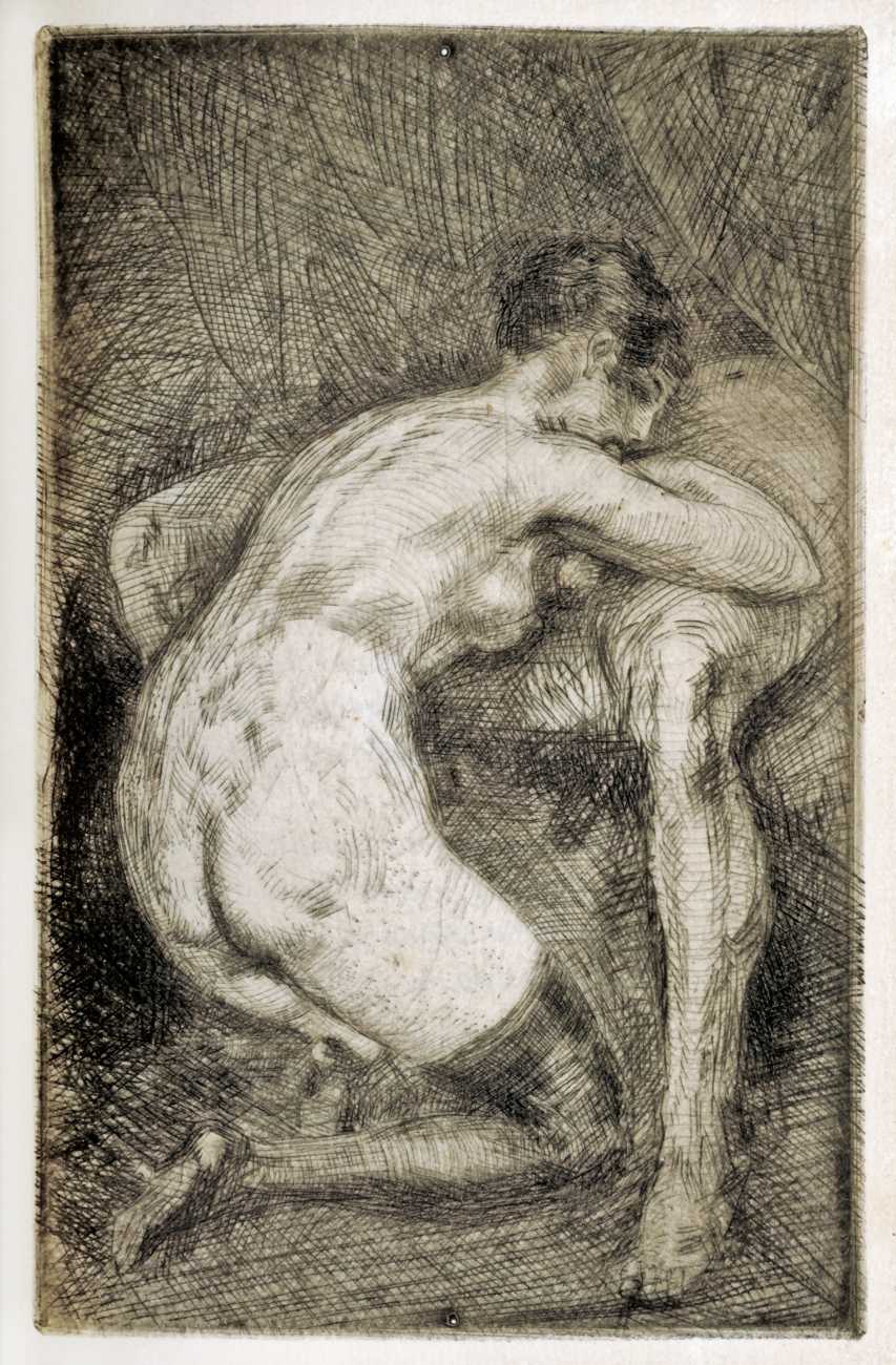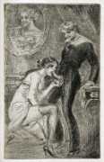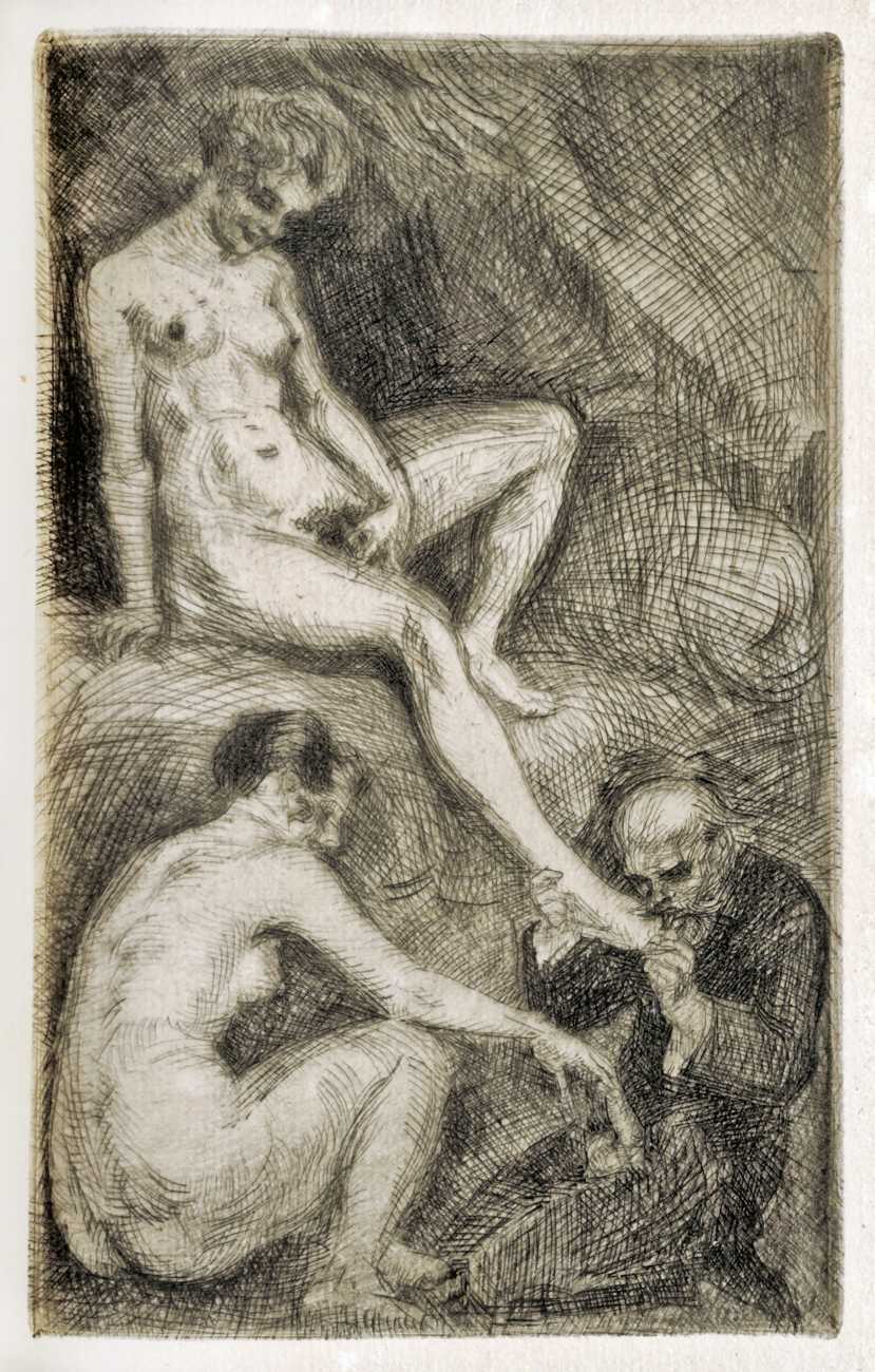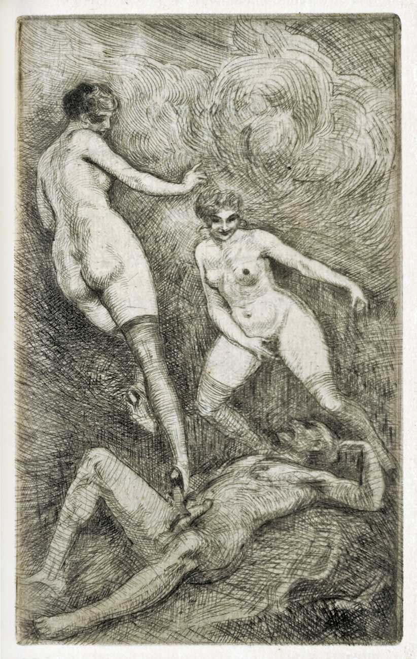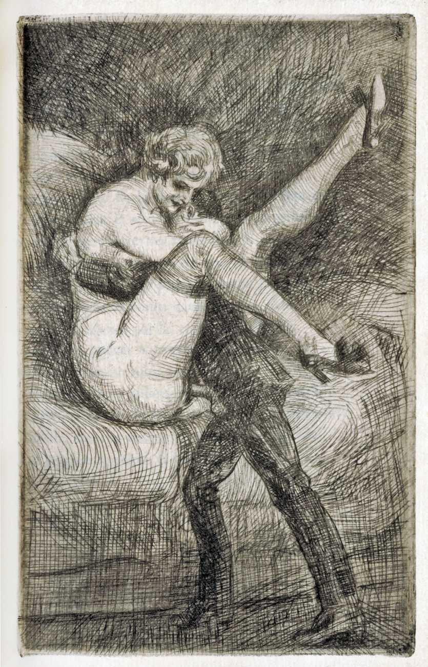 Whoever made these images, they are the perfect complement to Paul Verlaine’s Femmes (Women), a collection of eighteen poems published in 1890 to celebrate Verlaine’s women friends and lovers, forming part of the poet’s notorious Oeuvres libres. At least two of the etchings, and perhaps a third, show Verlaine himself in action.