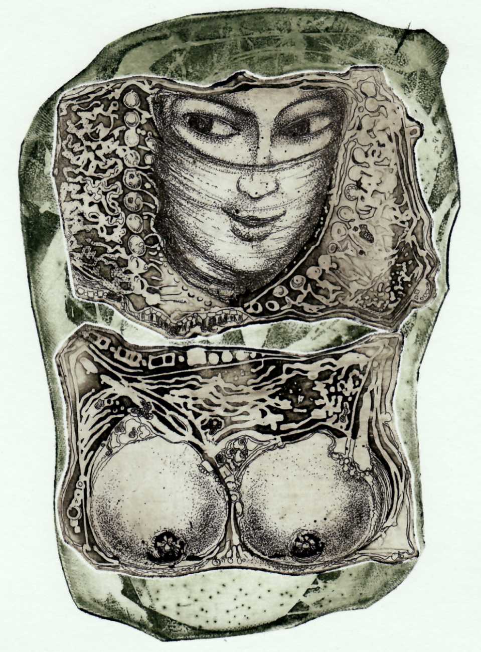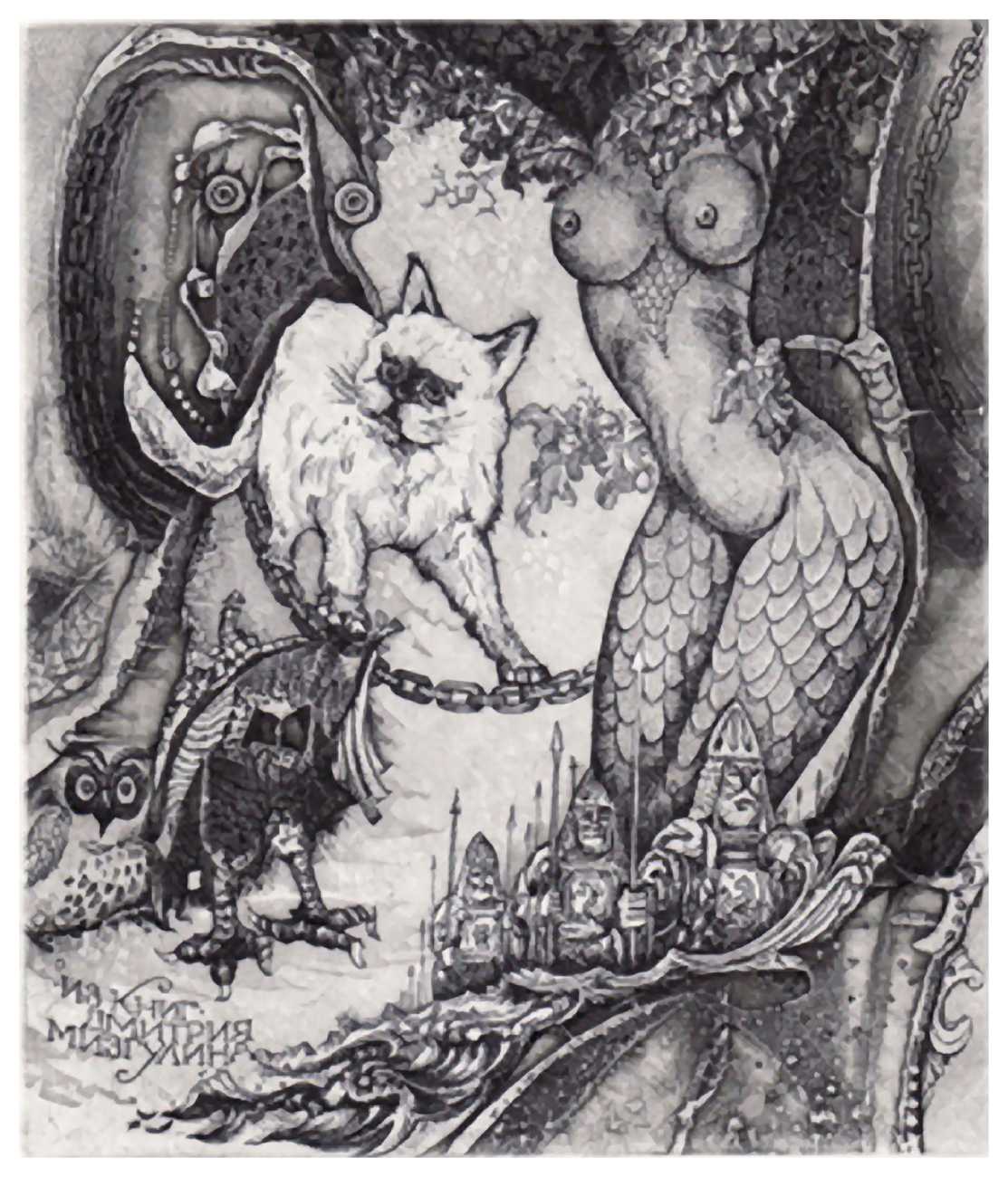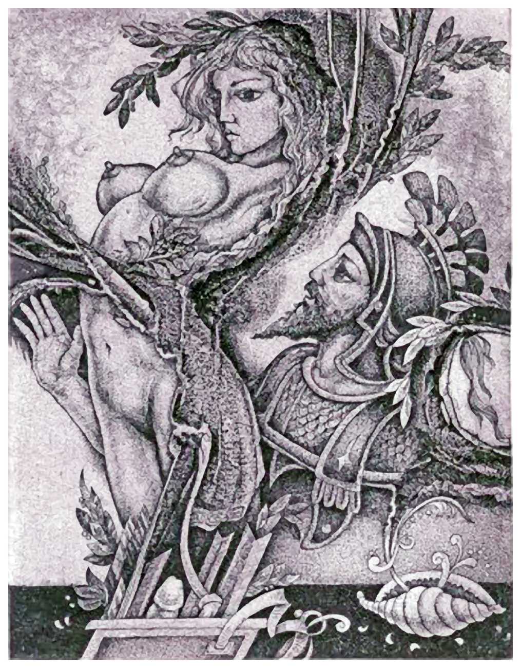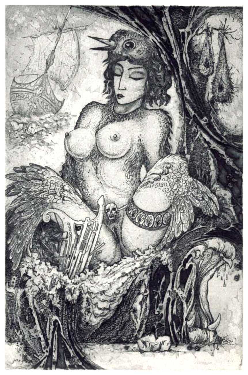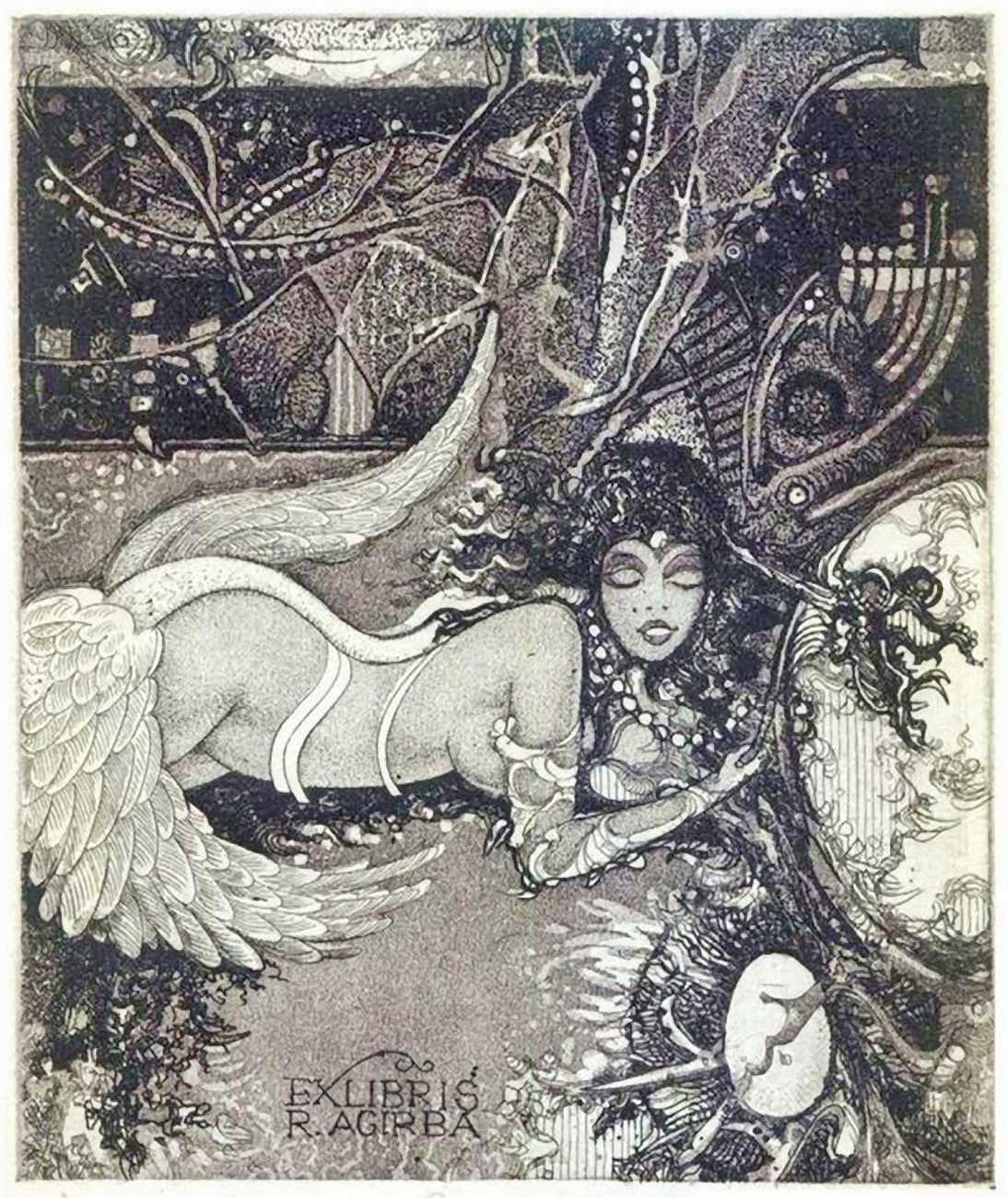 Ruslan Agirba’s detailed etchings take their inspiration from a wide variety of sources, including mythical – Leda and the Swan, Europa, the Sirens; literary – The Three Musketeers, Midsummer Night’s Dream; and historic – Arab dance and ancient Egypt. A surrealist strand runs through them all, using a variety of etching techniques to create swirling patterns and fine lines, always concentrating on a tight composition that does full justice to the small scale of his work.
