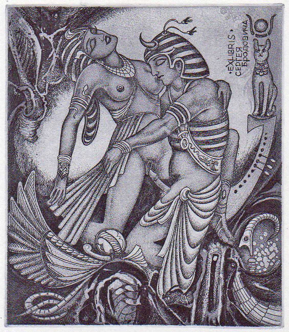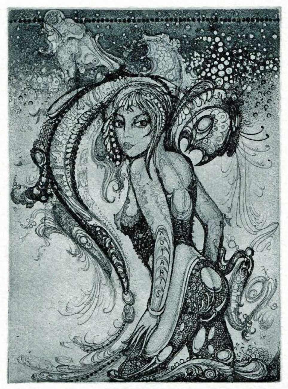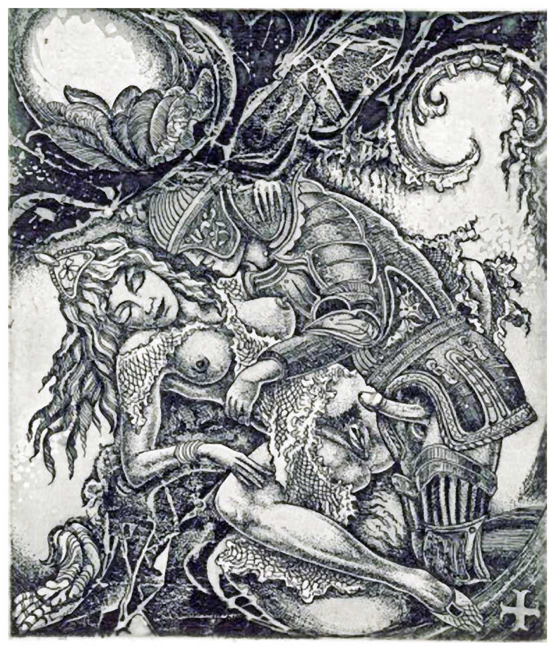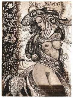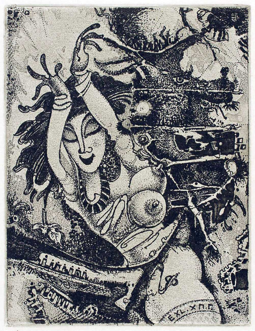 Most of his etchings originate as commissions for Ex Libris or bookplates, a genre which has a strong international following. The same dedictees often appear several times, as his clients return for new works to add to their personal collection, though of course the bookplates are destined never to be attached to actual books.